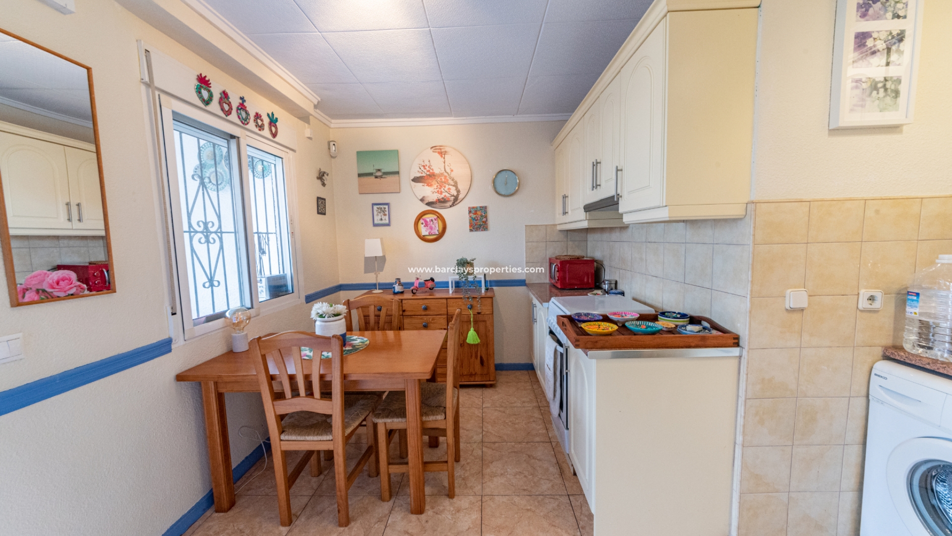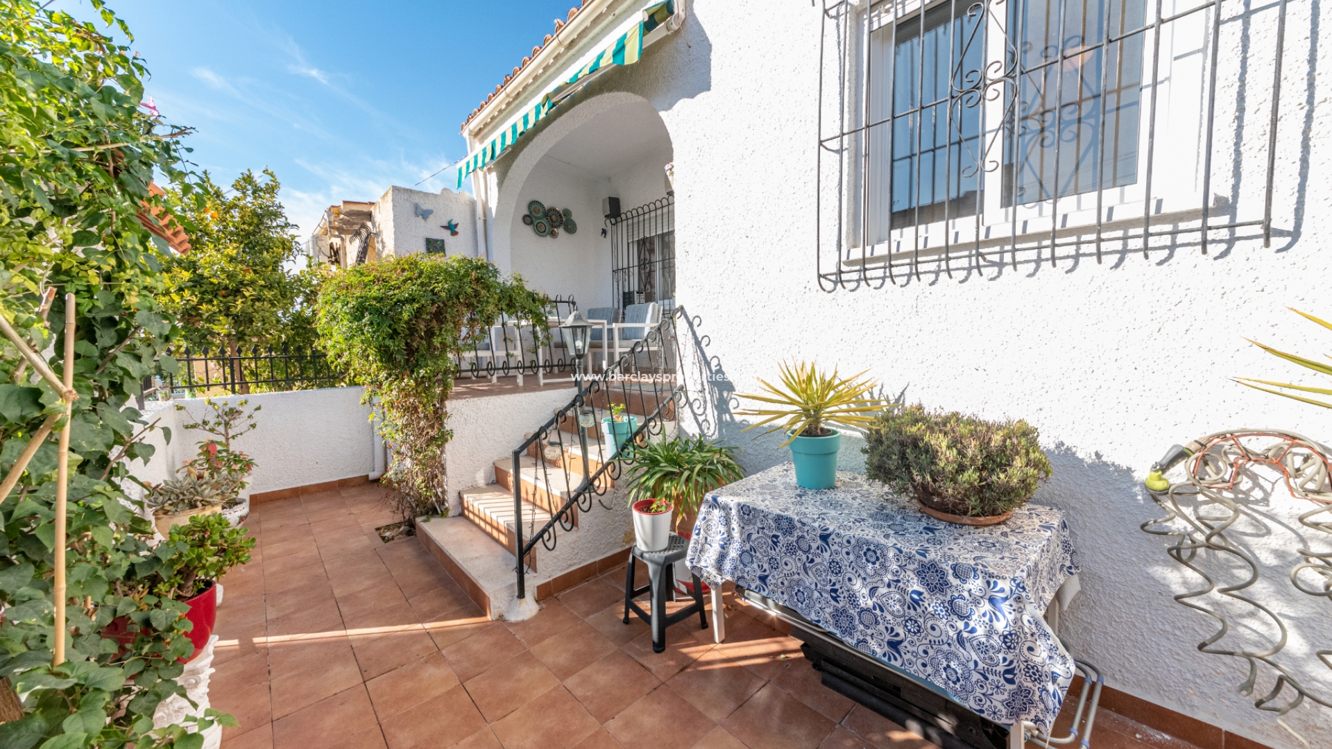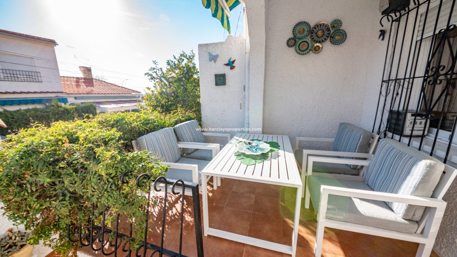 We betreden dit schilderachtige Rijtjeshuis te koop in La Marina vanaf het terras aan de voorzijde. Er groeien mooie planten rond de muur, waardoor dit gebied extra privacy biedt. Enkele treden leiden ons naar een verhoogd terras met een charmante zithoek, die dankzij de zonneschermen, betekent dat u kunt dineren in de buitenlucht op elk moment van de dag. Het is gemakkelijk voor te stellen dat u in deze mooie tuin zit met een kopje koffie in de ochtend, luisterend naar het geluid van de vogels.