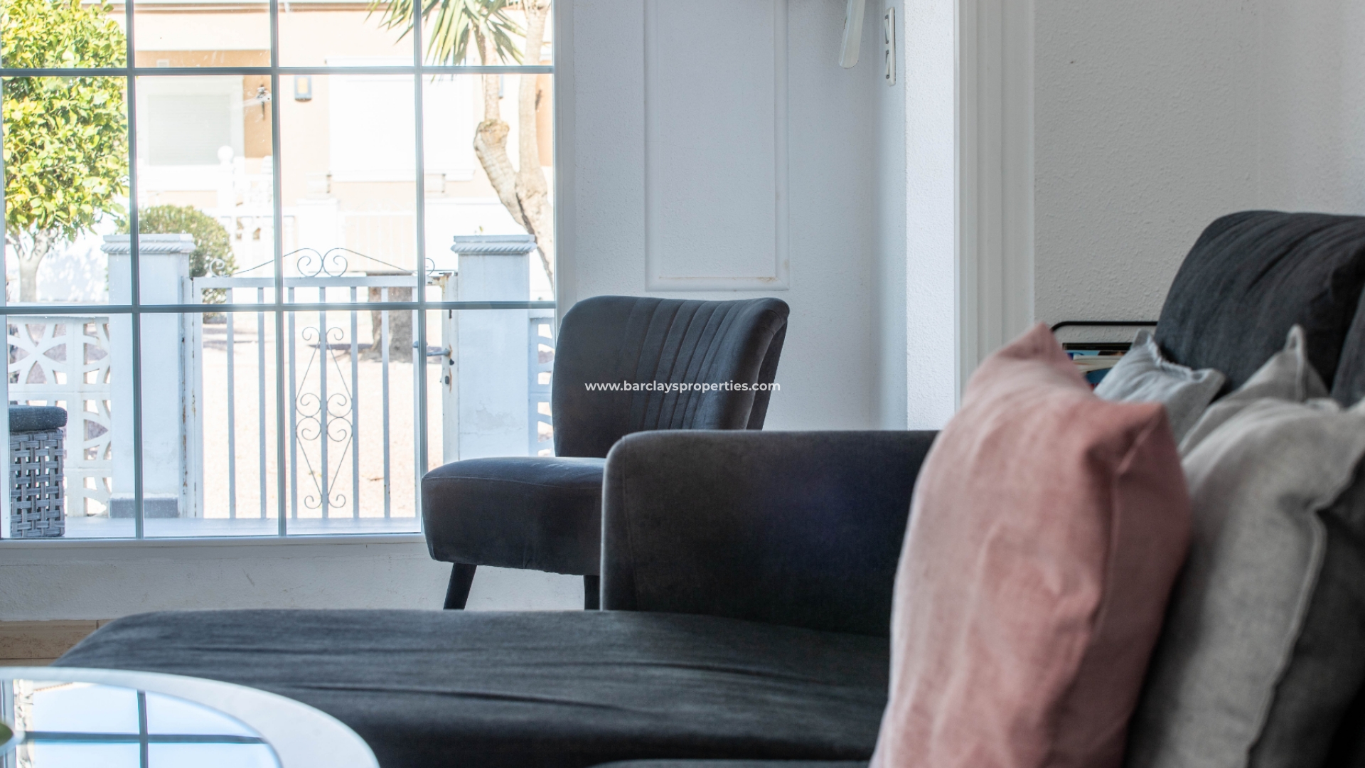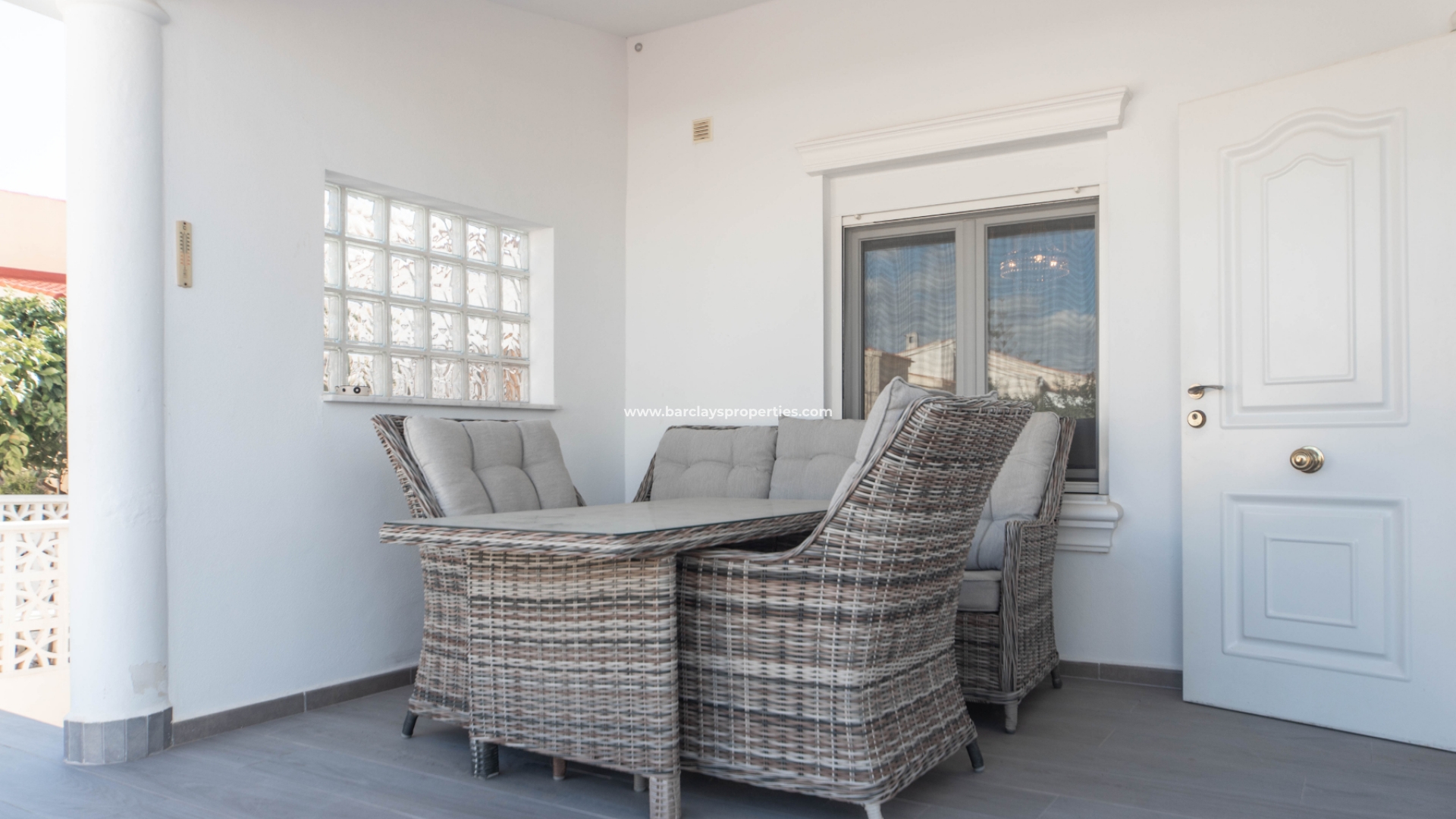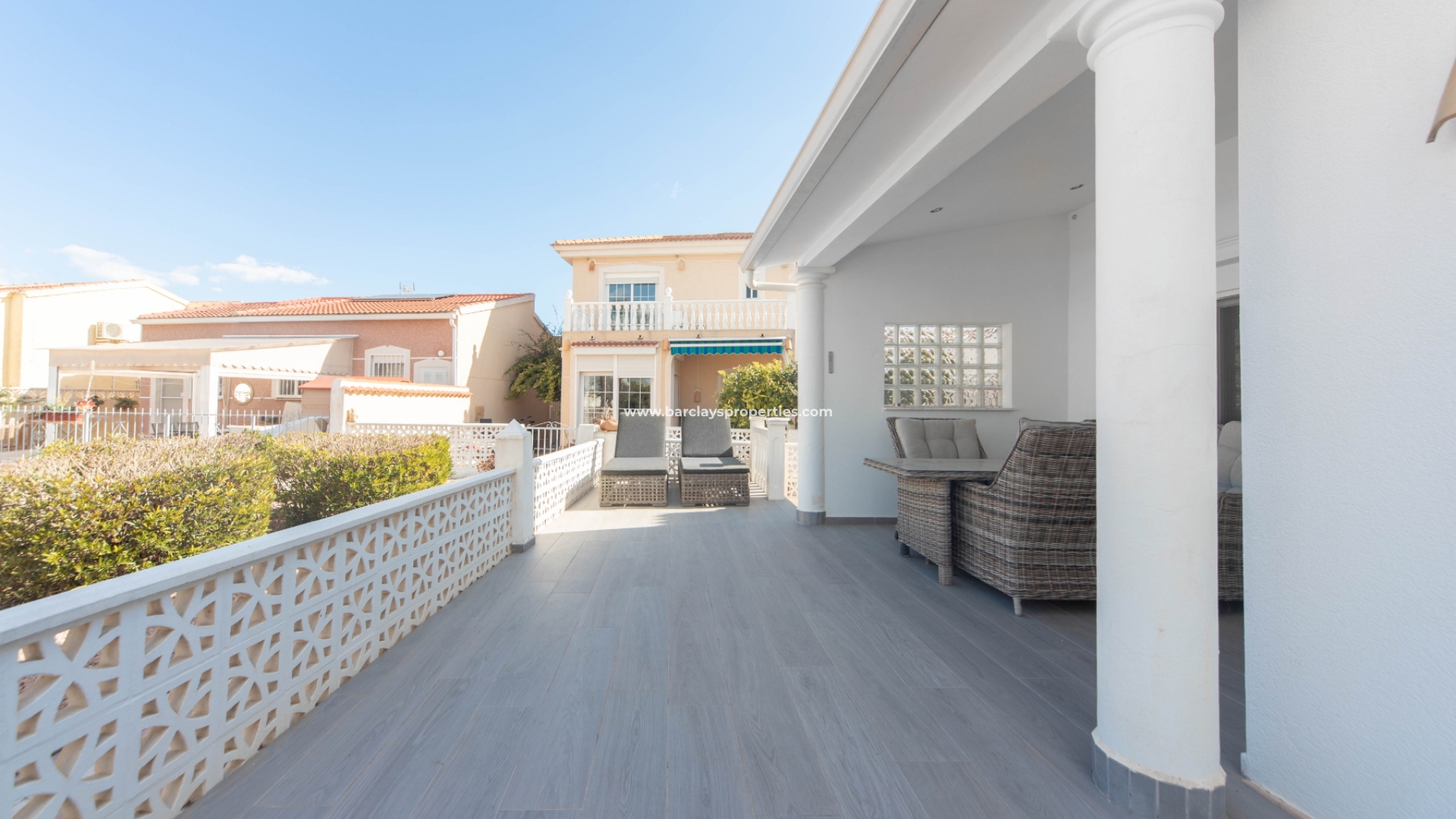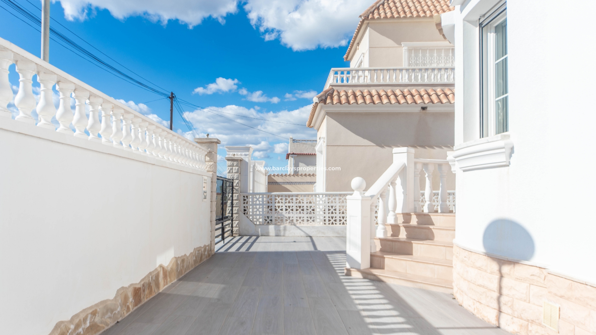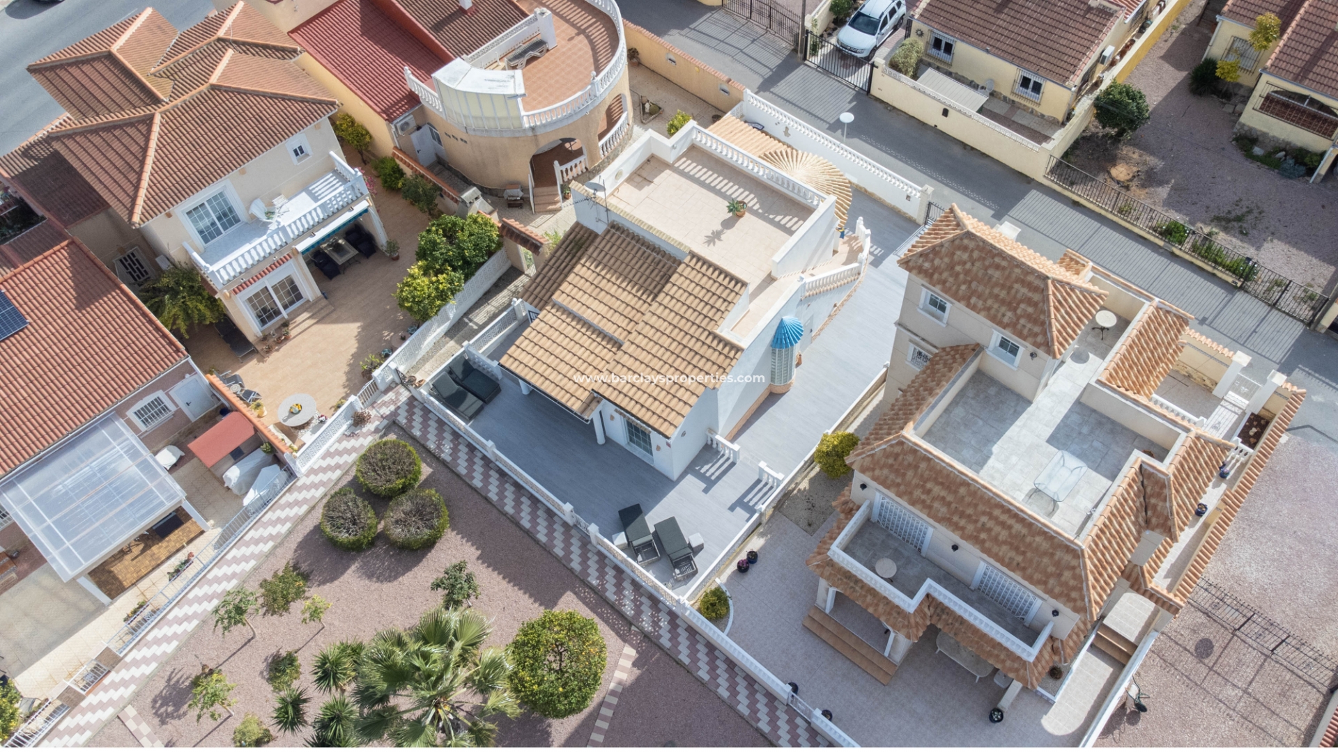 Trots introduceren deze prachtige unieke en volledig gerenoveerde vrijstaande villa die is gevonden in een toplocatie in Urb La Marina, San Fulgencio. Het maakt deel uit van een aantrekkelijke gemeenschap van 14 huizen met toegang tot een goed onderhouden gemeenschappelijk zwembad en onberispelijke tuinen met diverse zonnige en schaduwrijke zitjes. Deze vrijstaande villa, een model "Lola" is uitgebreid en gerenoveerd tot een fantastisch huis.