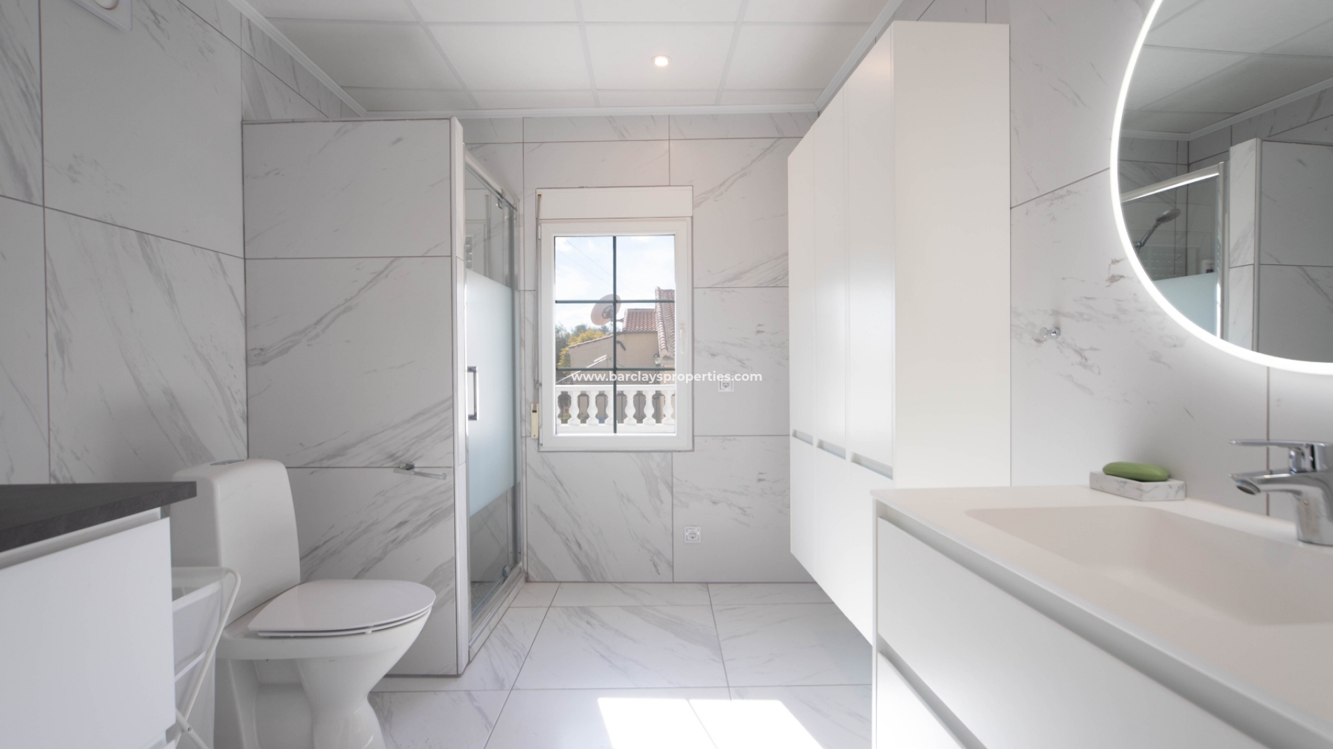 Vanuit de hal vinden we een grote slaapkamer met inbouwkasten, airconditioning en een grote moderne en-suite badkamer met marmeren vloeren en wandtegels, wc, wastafel met LED-cirkelvormige spiegel, een inloopdouche, opbergkasten, geïnstalleerde wasmachine en plafondspots. Naast de master is een badkamer met inloopdouche en nog een tweepersoons slaapkamer met inbouwkasten. Deze prestigieuze villa is uitgerust met vloerverwarming, grenen binnendeuren, aluminium "tilt & turn" ramen met marmeren richels, voor en achter veiligheidsdeuren en wordt gedeeltelijk gemeubileerd aangeboden.