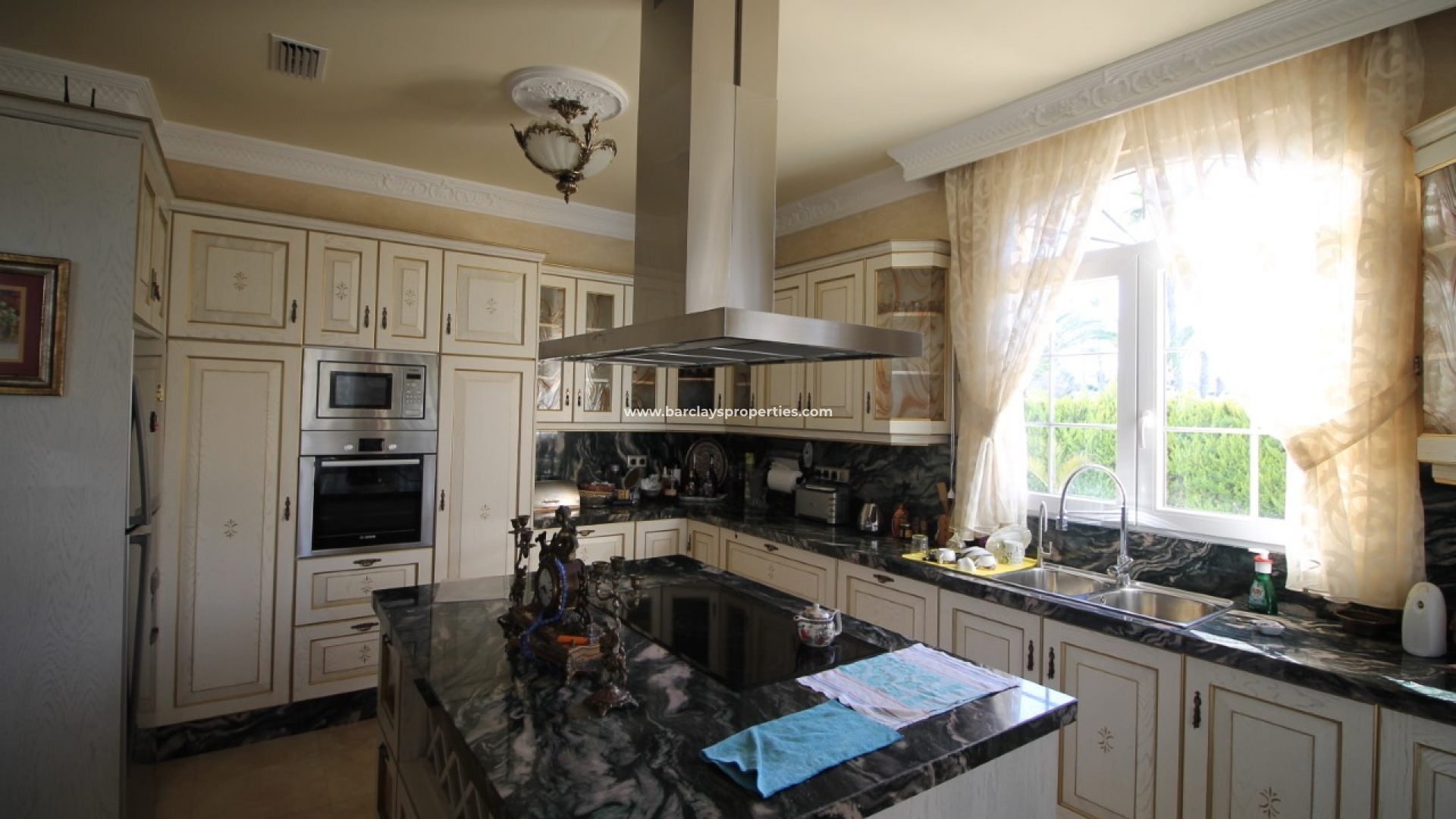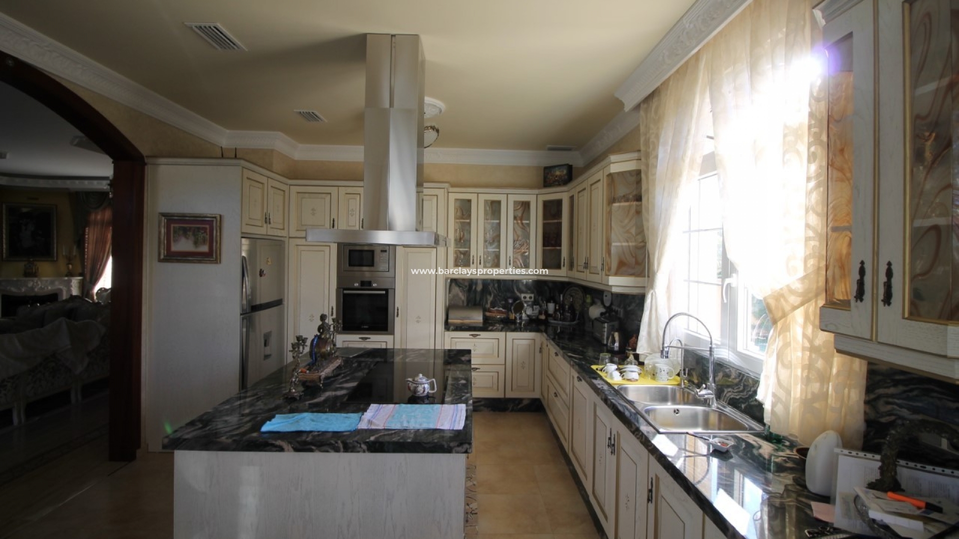Om de hoek van deze ruime woonkamer, is een Amerikaanse keuken uitgerust met high-end witgoed, meubels en prachtige Italiaanse quartz werkbladen.