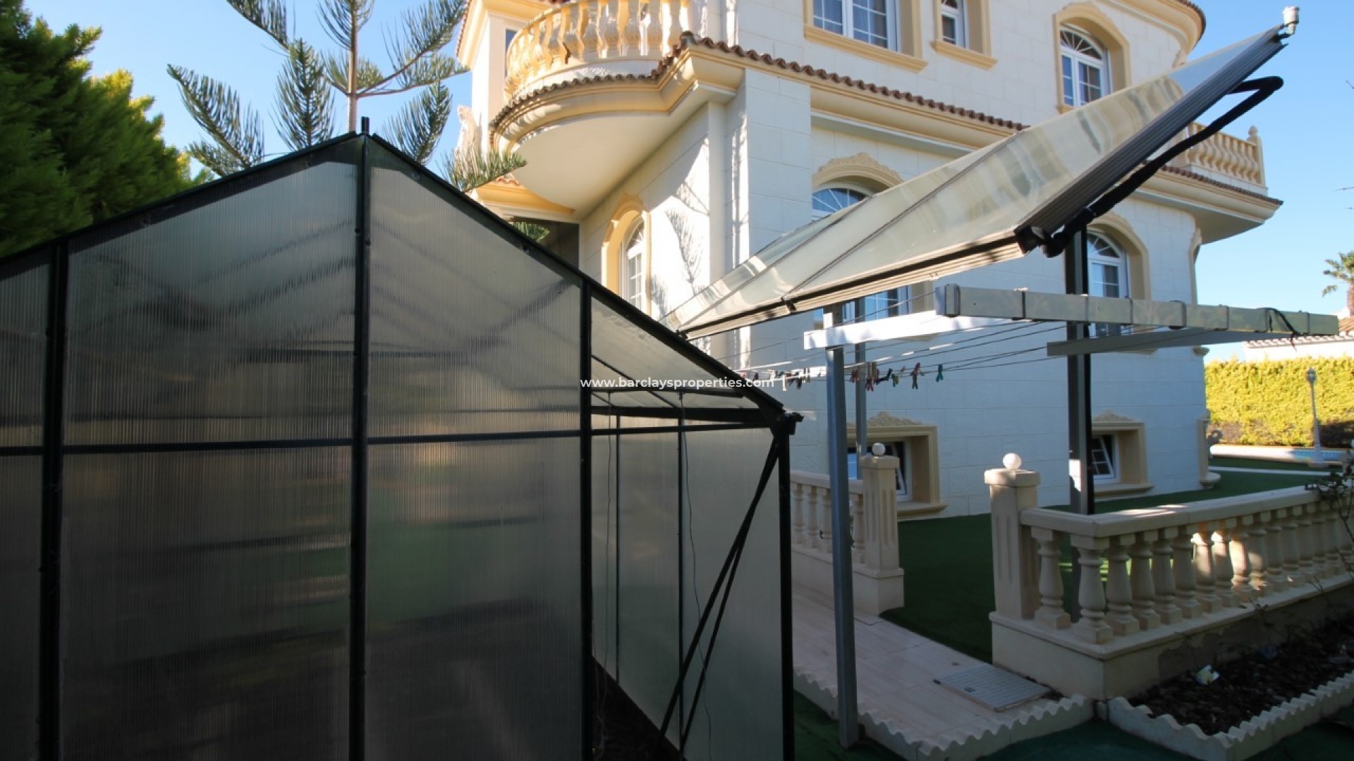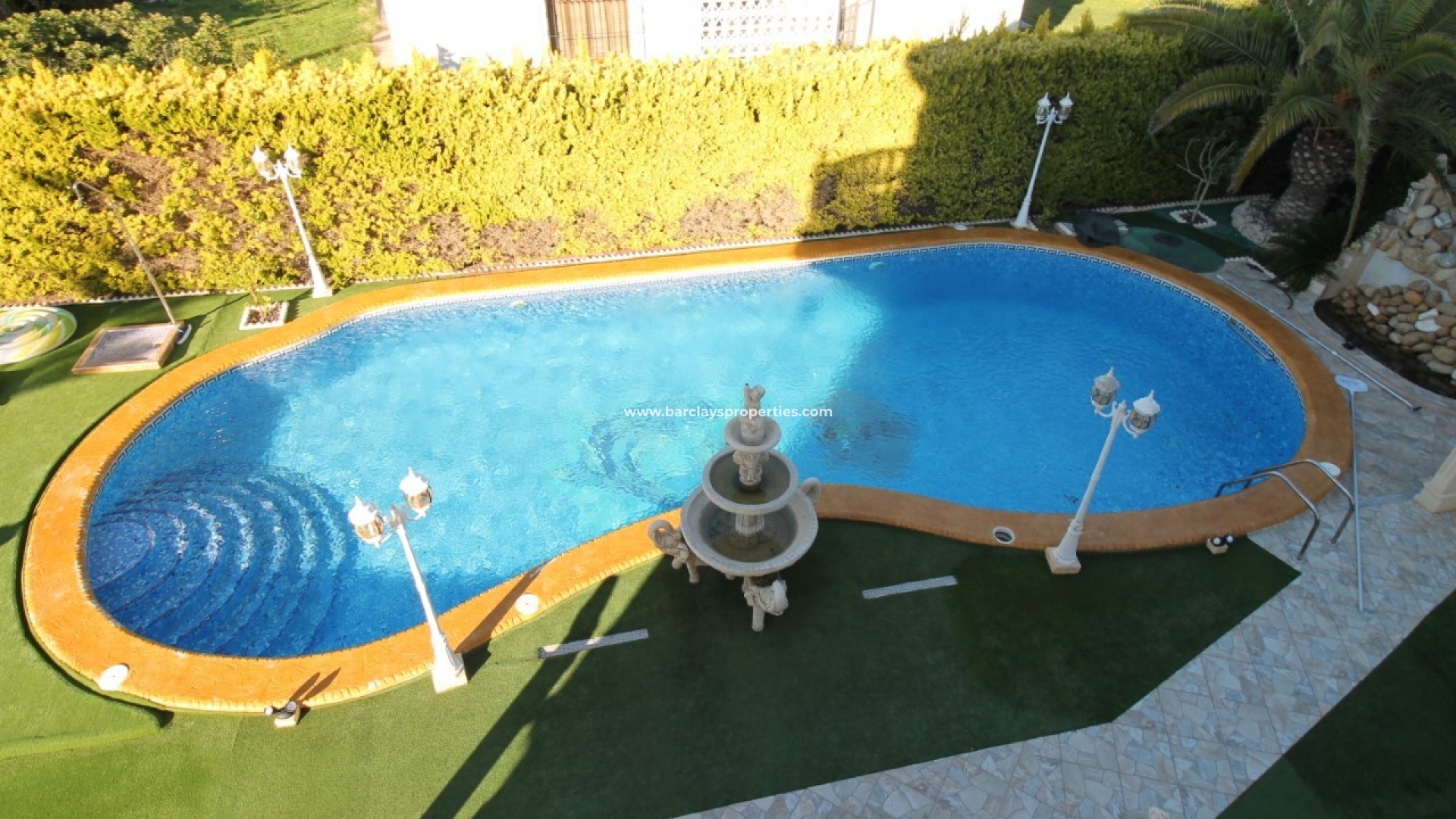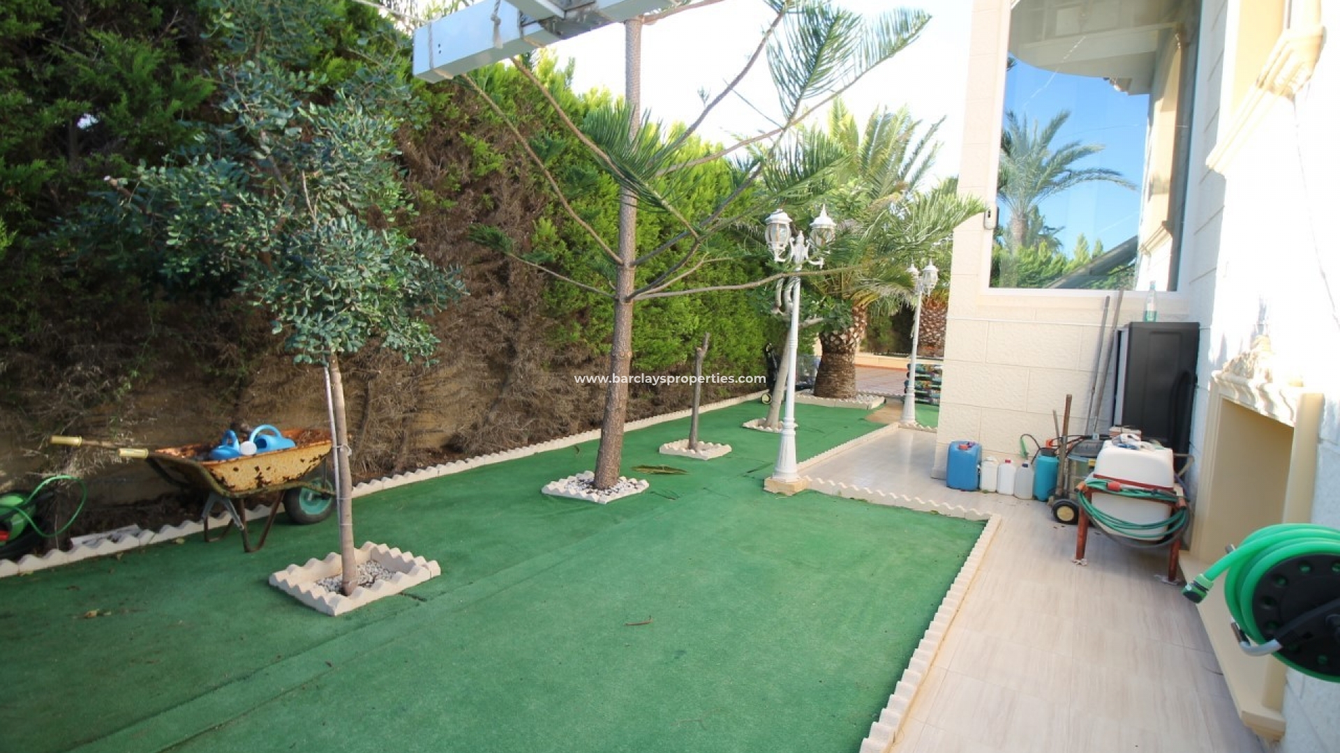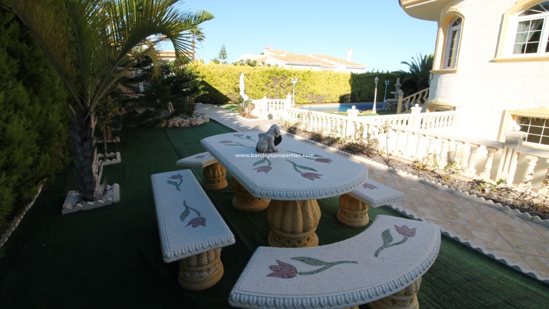 De privé onderhoudsarme tuin biedt alles wat u nodig heeft om te genieten van ons lokale warme Spaanse weer, waaronder een extra groot privézwembad, een met glas overdekte keuken met uitzicht op het zwembad, een stenen fontein, veel buitenleven en zelfs een beetje groen huis.