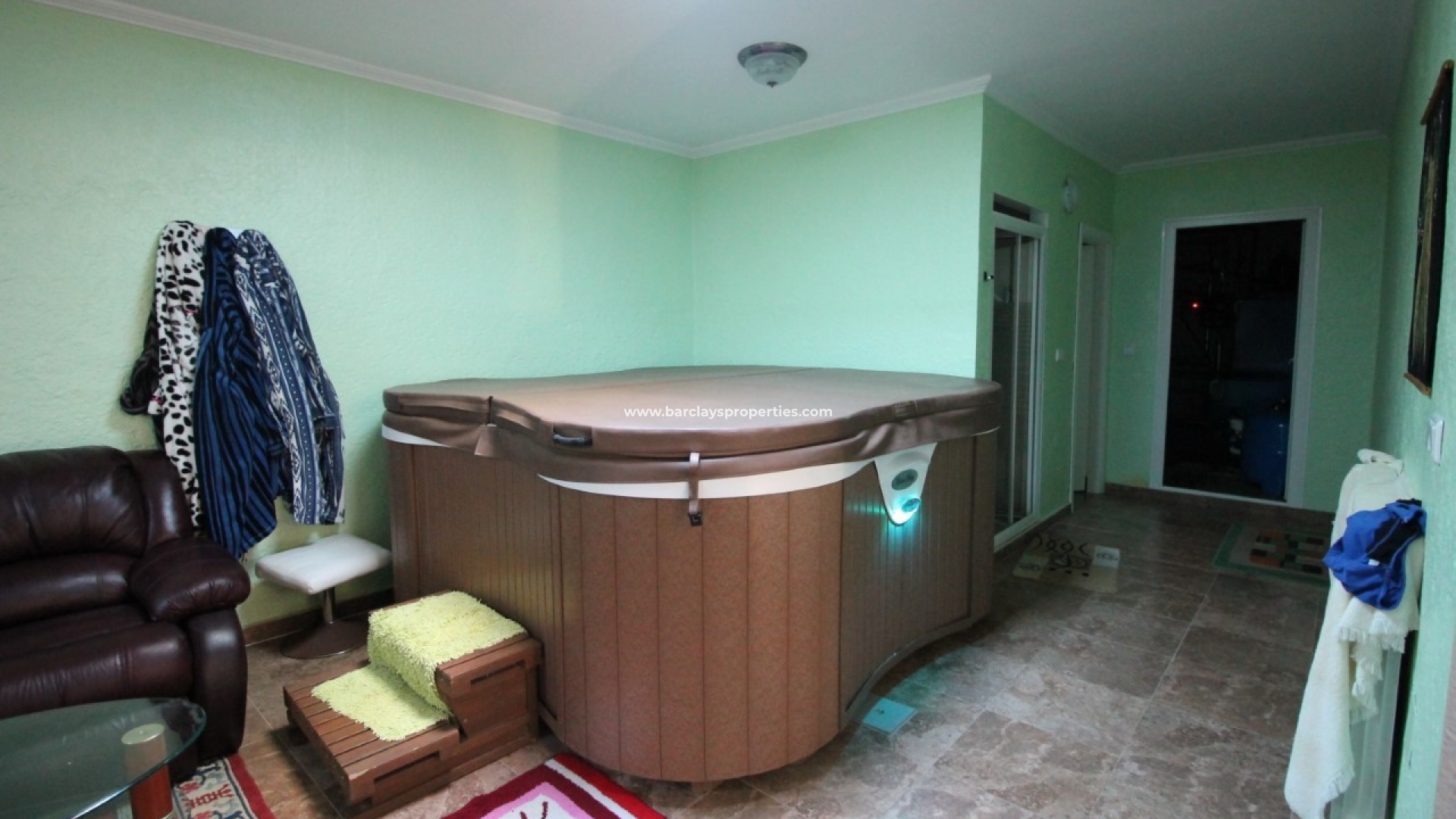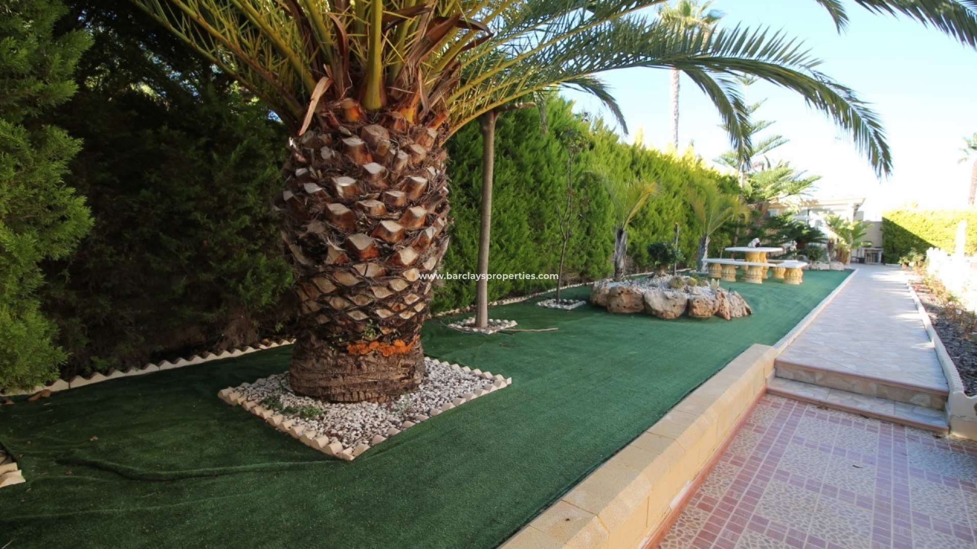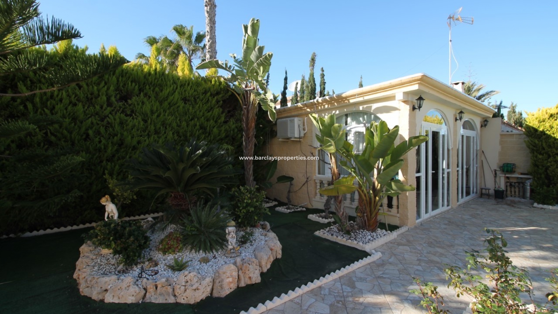 De privé onderhoudsarme tuin biedt alles wat u nodig heeft om te genieten van ons lokale warme Spaanse weer, waaronder een extra groot privézwembad, een met glas overdekte keuken met uitzicht op het zwembad, een stenen fontein, veel buitenleven en zelfs een beetje groen huis.