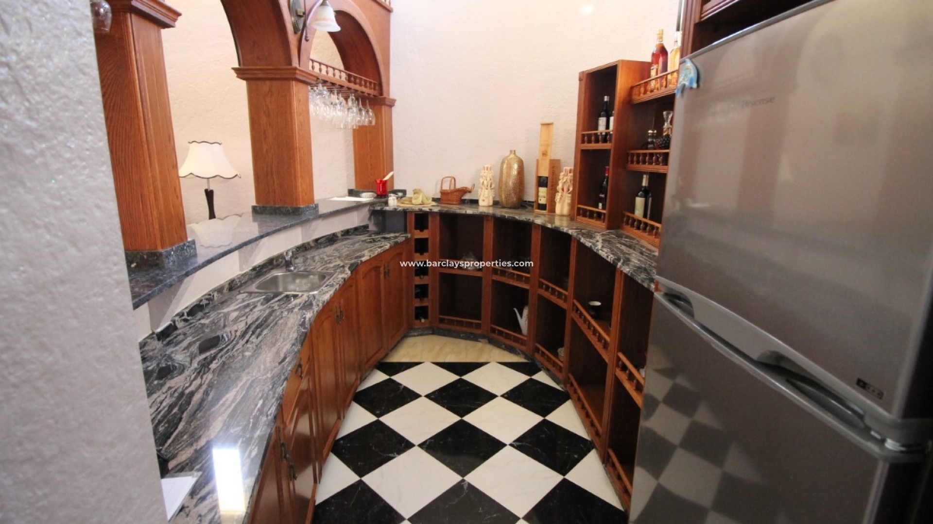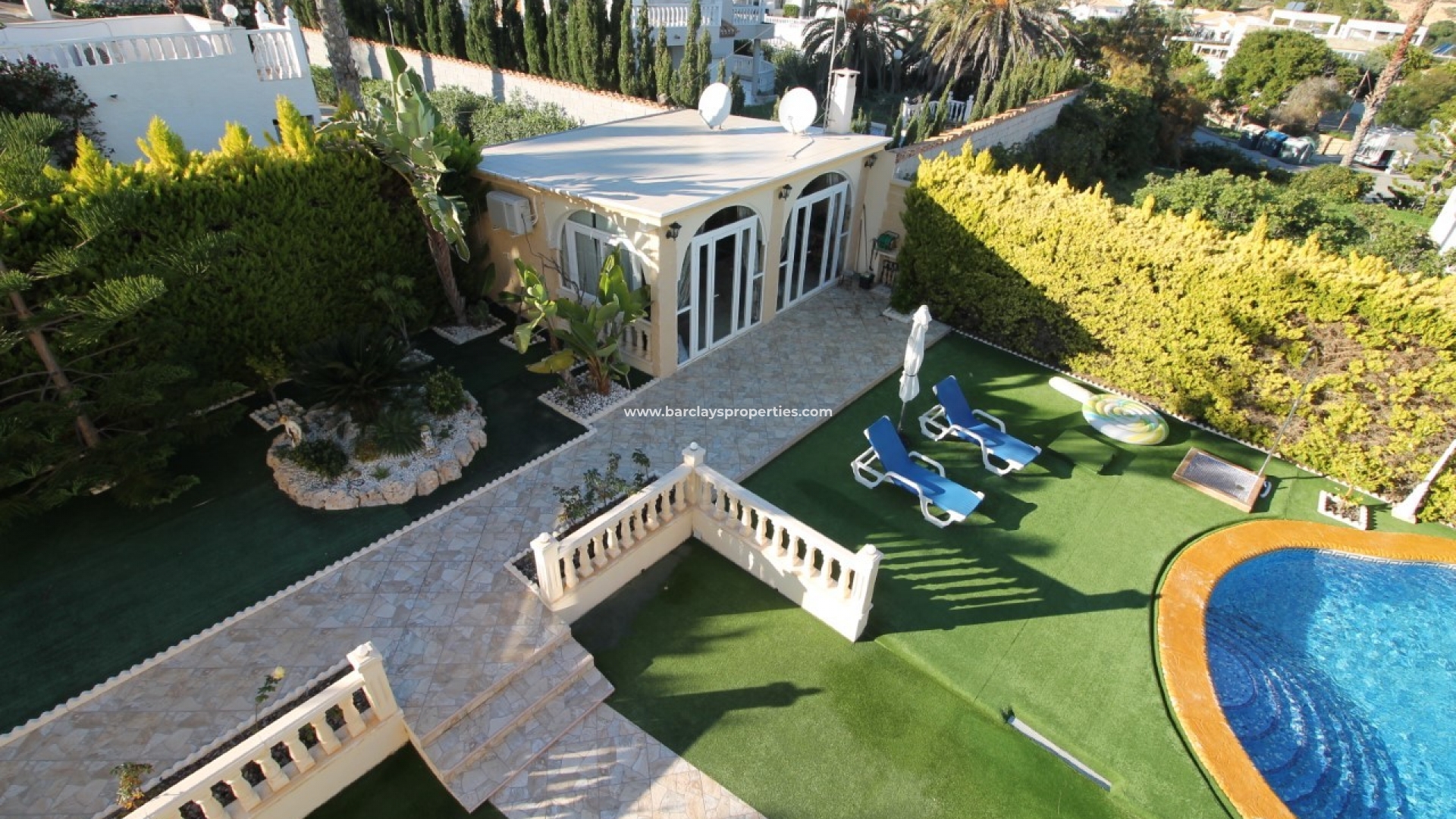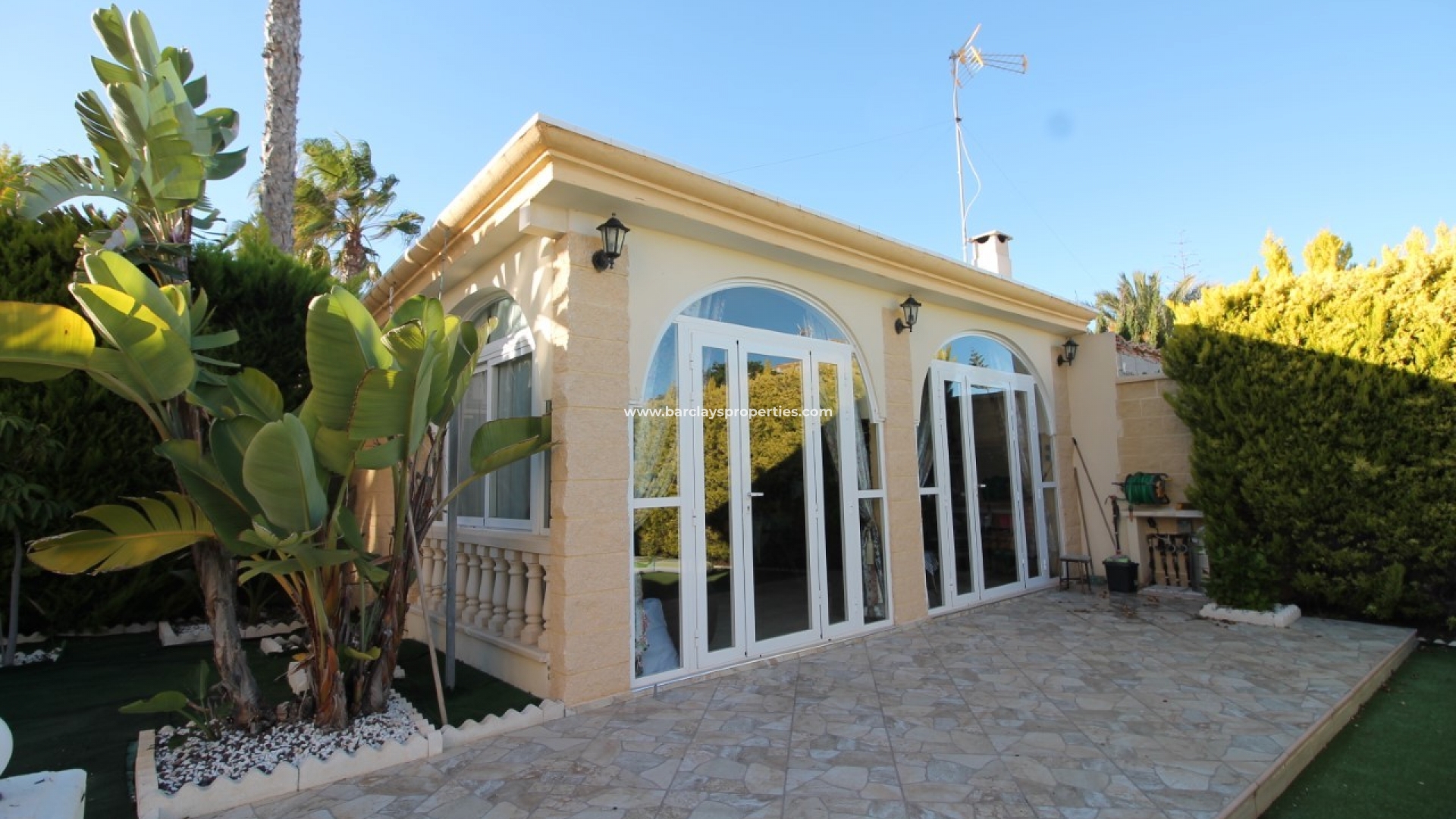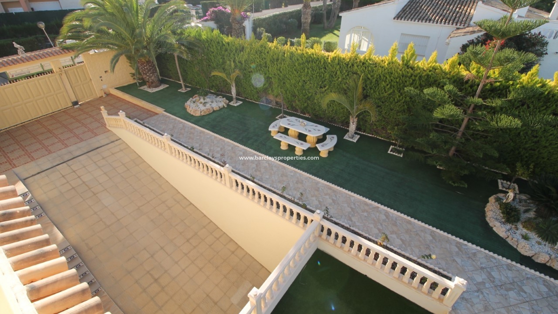 De privé onderhoudsarme tuin biedt alles wat u nodig heeft om te genieten van ons lokale warme Spaanse weer, waaronder een extra groot privézwembad, een met glas overdekte keuken met uitzicht op het zwembad, een stenen fontein, veel buitenleven en zelfs een beetje groen huis.