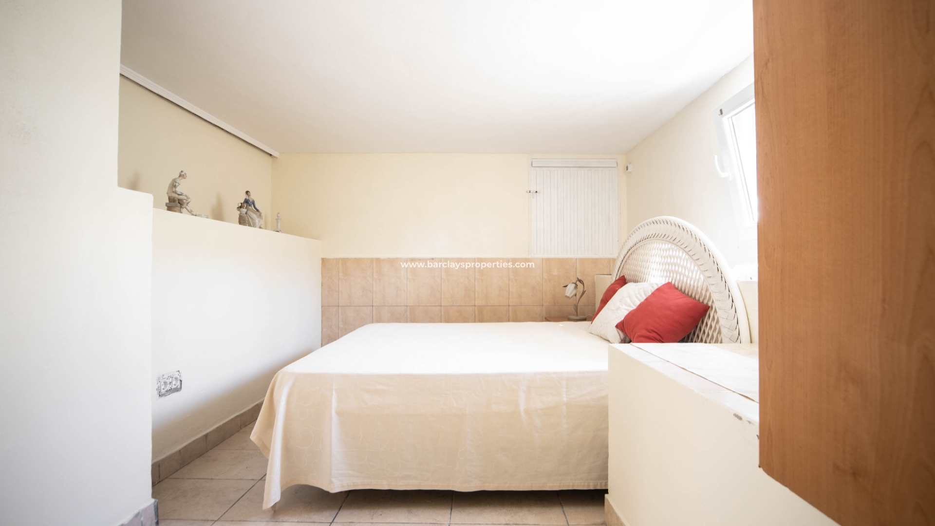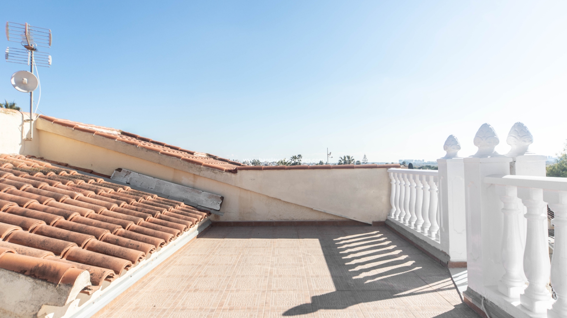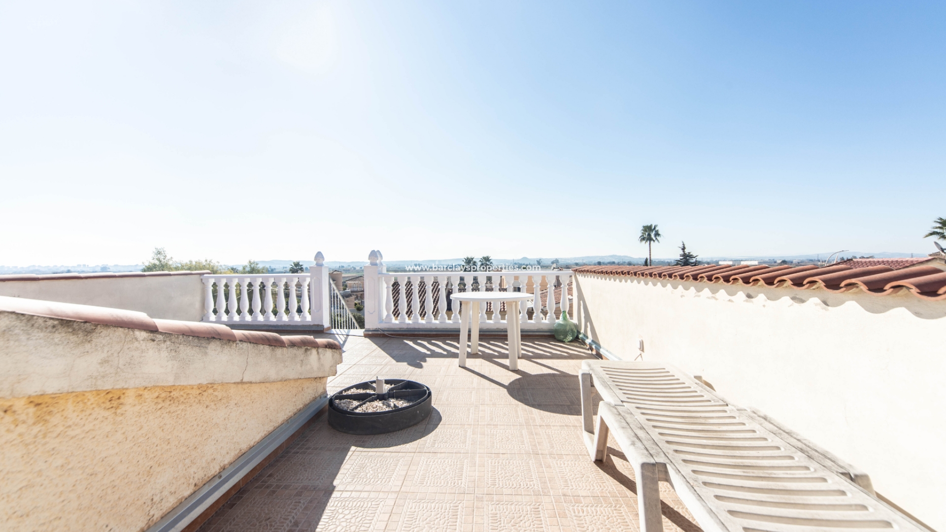 Een buitentrap vanaf het zonneterras aan de voorzijde leidt naar het dakterras waar u kunt zonnebaden en dineren en waar u een spectaculair uitzicht heeft op het platteland en de bergen en op de naburige stad Guardamar Del Segura.