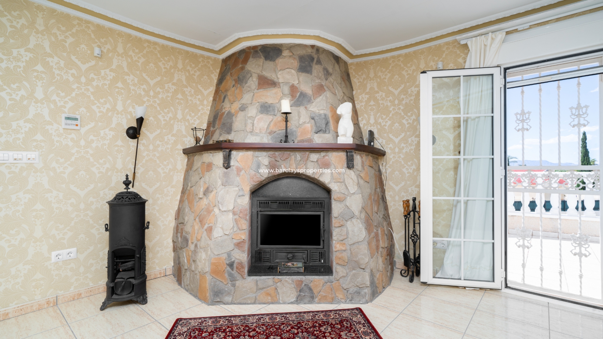 We are welcomed by a large covered front terrace with a relaxing lounge area, dining area and open archways with pool views. From here we enter the villa to find a reception hallway leading to the fully fitted country style kitchen with breakfast bar leading to the spacious living room with feature fireplace and air conditioning. To the rear of the living room is a handy storage room.