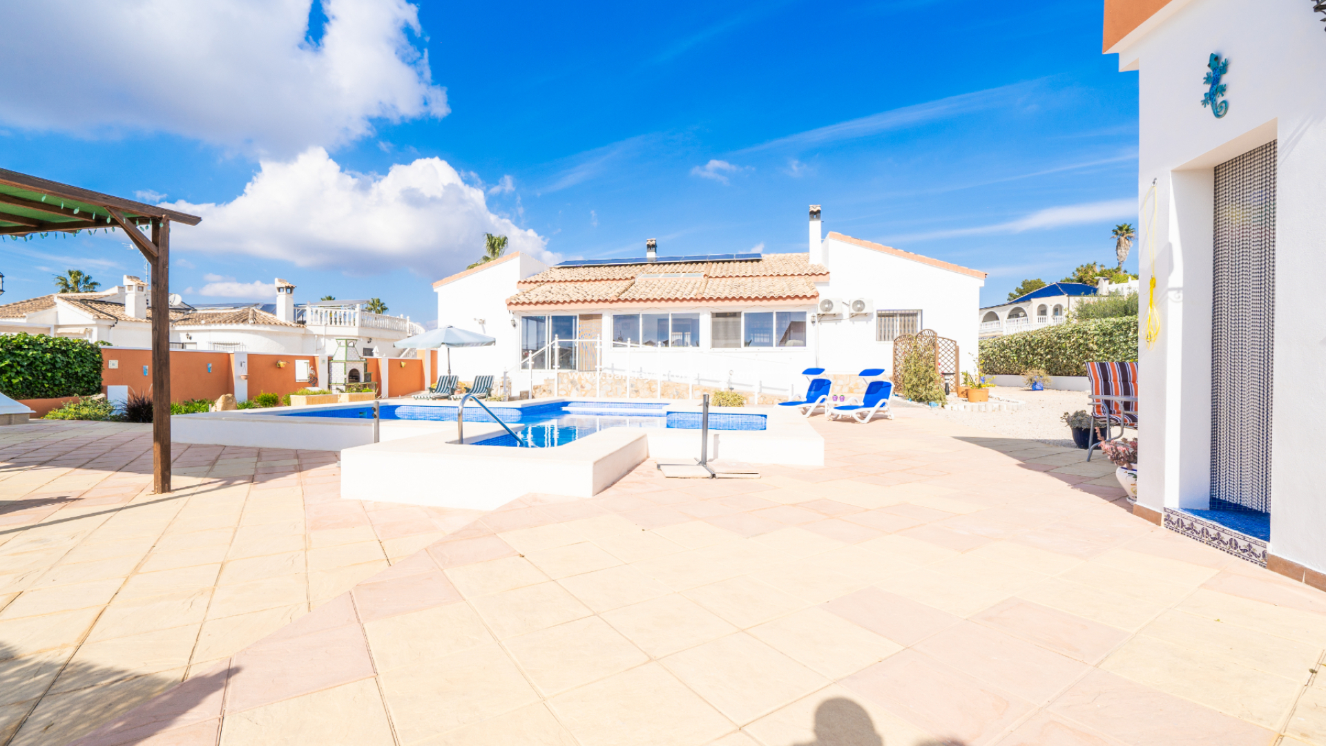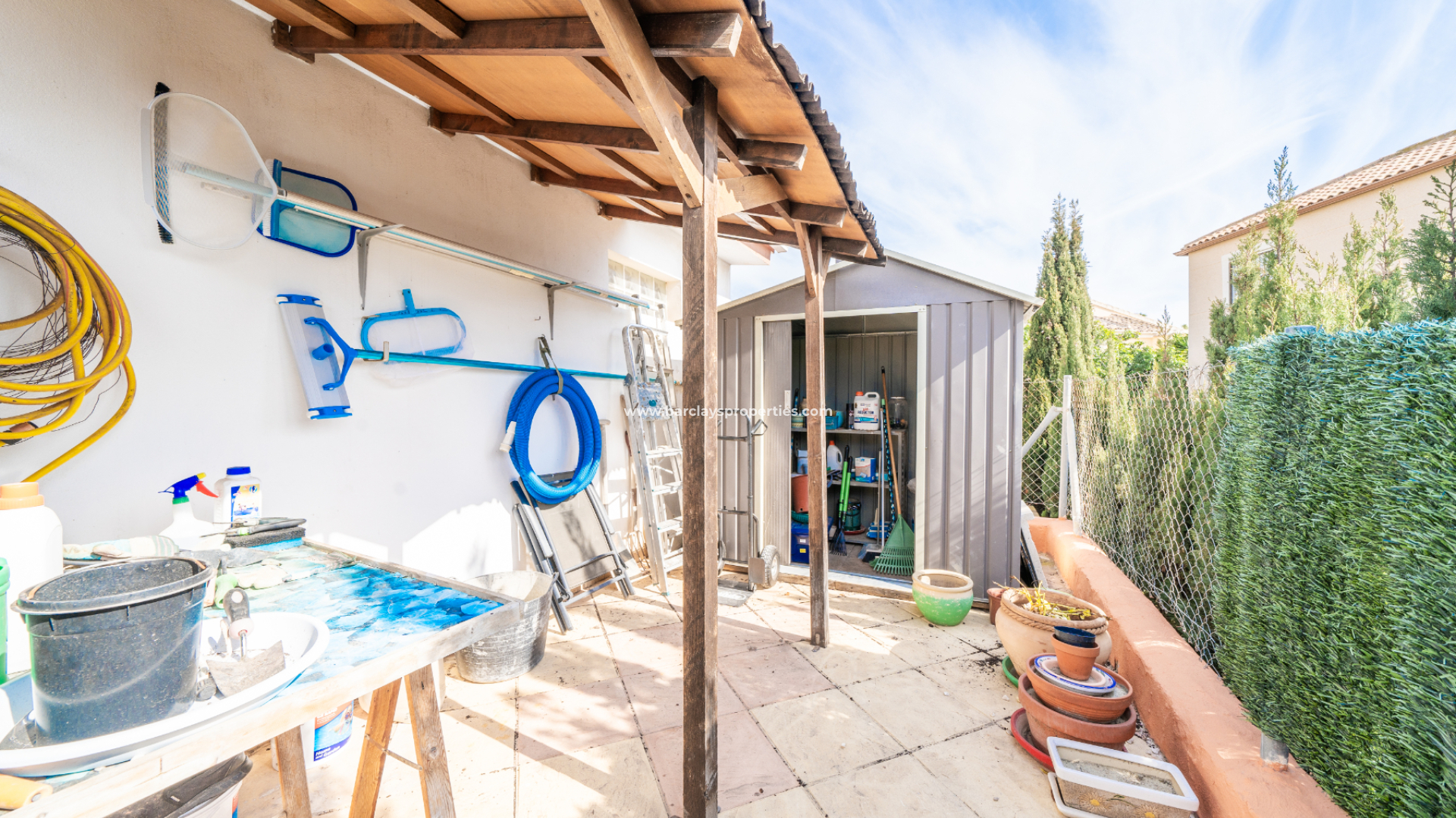 The outdoor spaces are thoughtfully arranged, featuring a ➡️ unique cross shaped designed swimming pool, a charming gazebo, and a BBQ area ideal for entertaining. An office space and utility / laundry room and shower room housed in a separate building, an exterior shed, and 8 solar panels which enhance the villa’s versatility and sustainability. The property also includes ➡️ a private garage and fantastic under-build storage space, ideal for keeping your personal belongings safe and dry.
