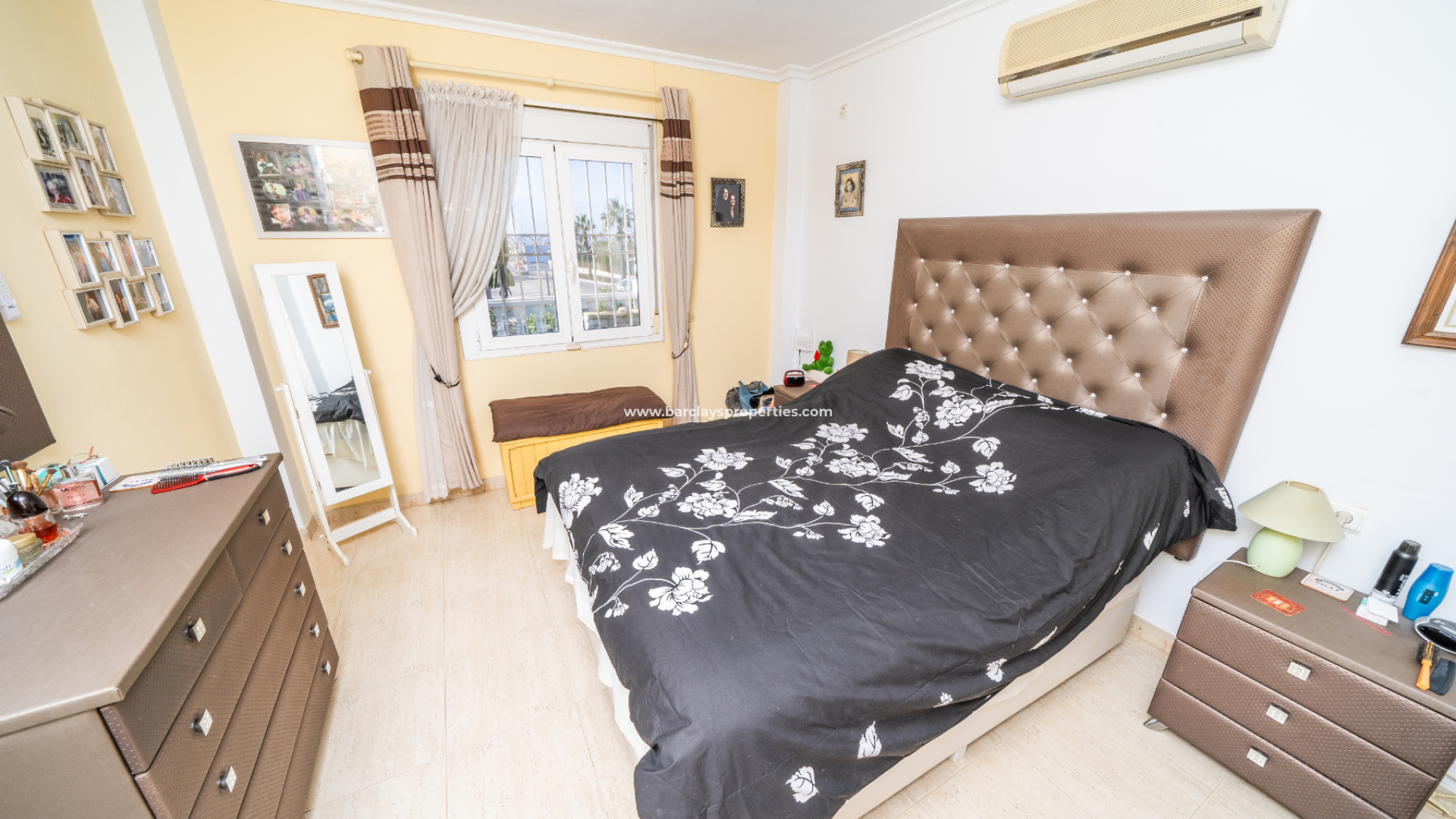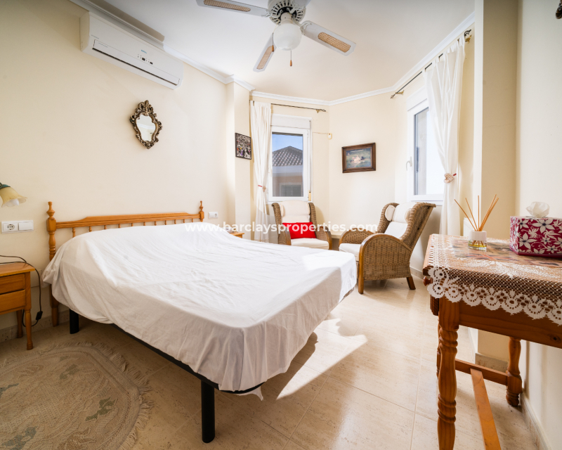 The villa has three bedrooms. The first, currently used as an office, includes twin beds, fitted wardrobes, and a ceiling fan. A bathroom with a walk-in shower, vanity unit, and WC is conveniently nearby. The master bedroom is generously sized, featuring large fitted wardrobes, a ceiling fan, and air conditioning. Its ensuite bathroom includes a full-size bath, WC, and vanity unit.