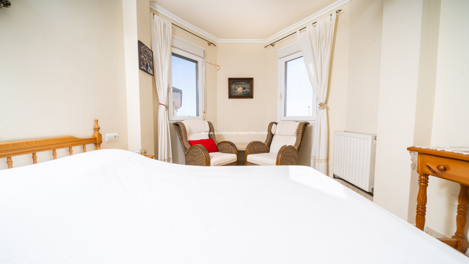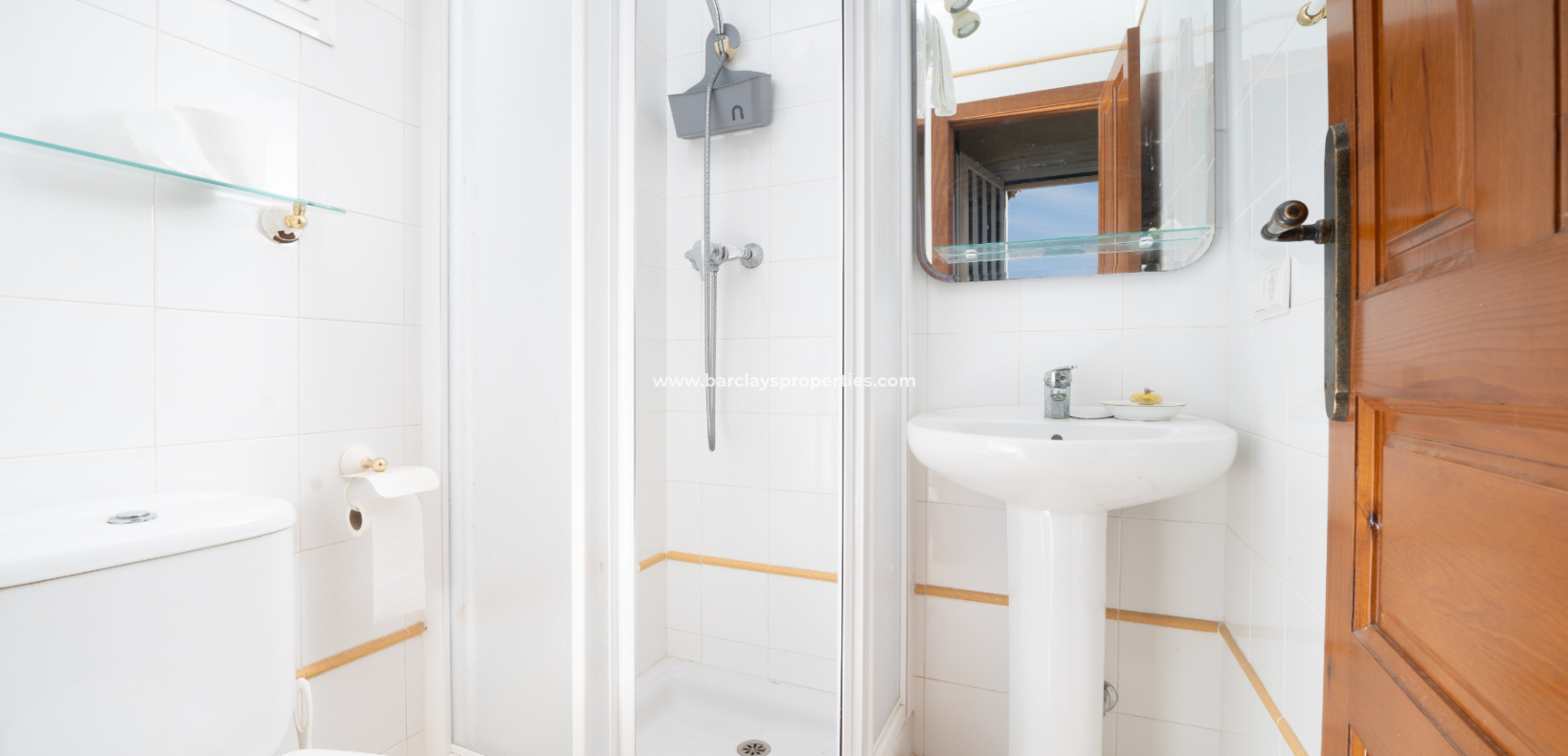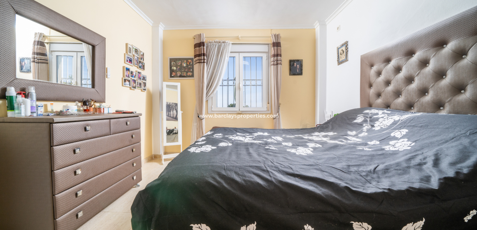 External stairs lead to a sun terrace with ✅breathtaking views of the countryside and mountains. A third double bedroom, also with air conditioning, ceiling fans, and fitted wardrobes, features an ensuite shower room with a WC and sink. This is an ideal guest sleeping accommodation.