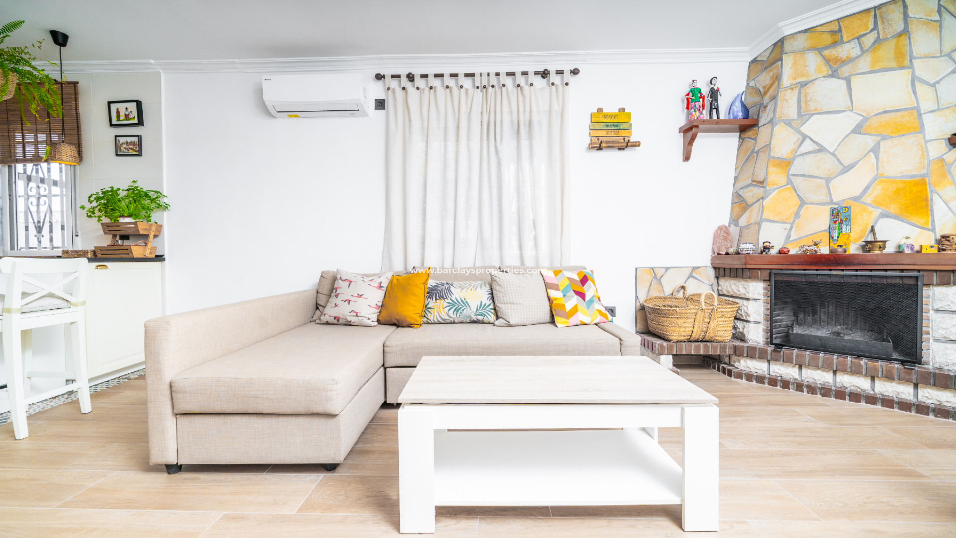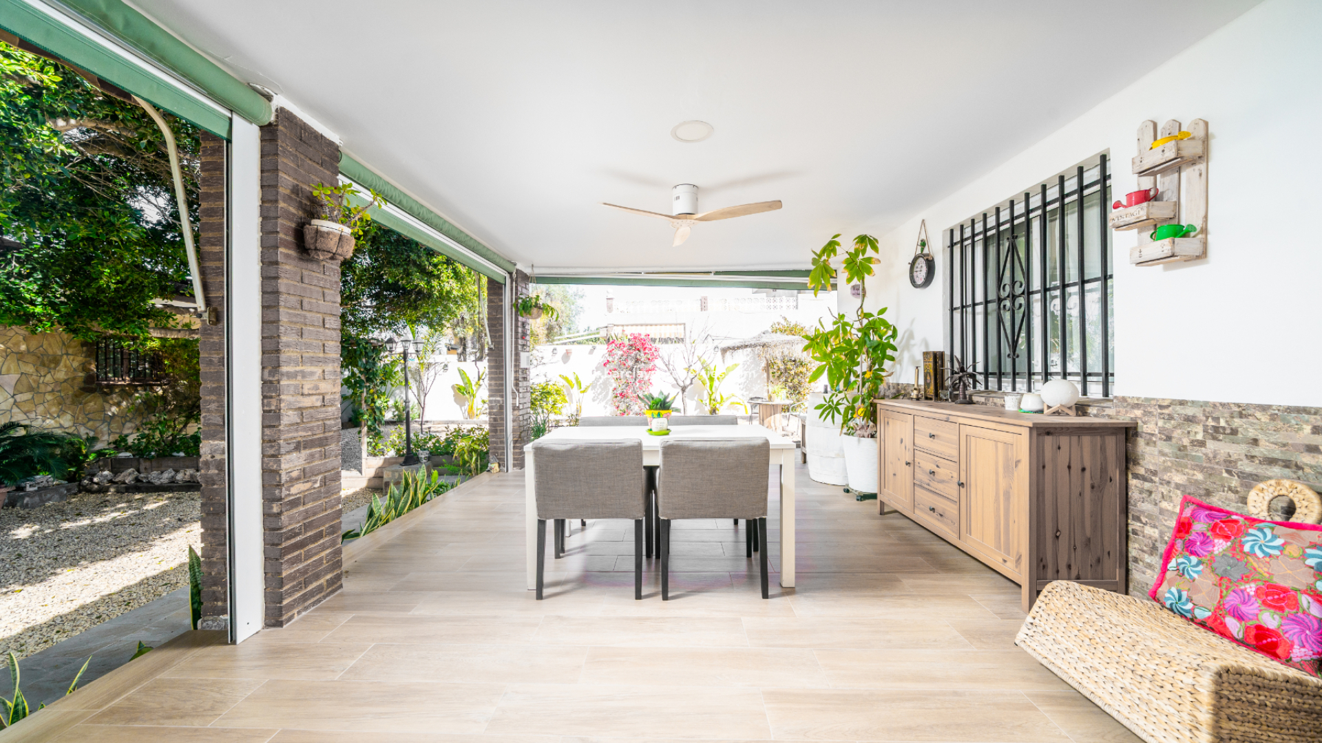 We are welcomed by a generous terrace with sun awnings and a ceiling fan extending the living space, creating the perfect spot to enjoy the surroundings. Inside, the open-plan kitchen and living room are fitted with air conditioning, a ceiling fan and a log fire, offering comfort throughout the year. ➡️ The utility room provides extensive storage and workspace and also serves as a large dressing room.