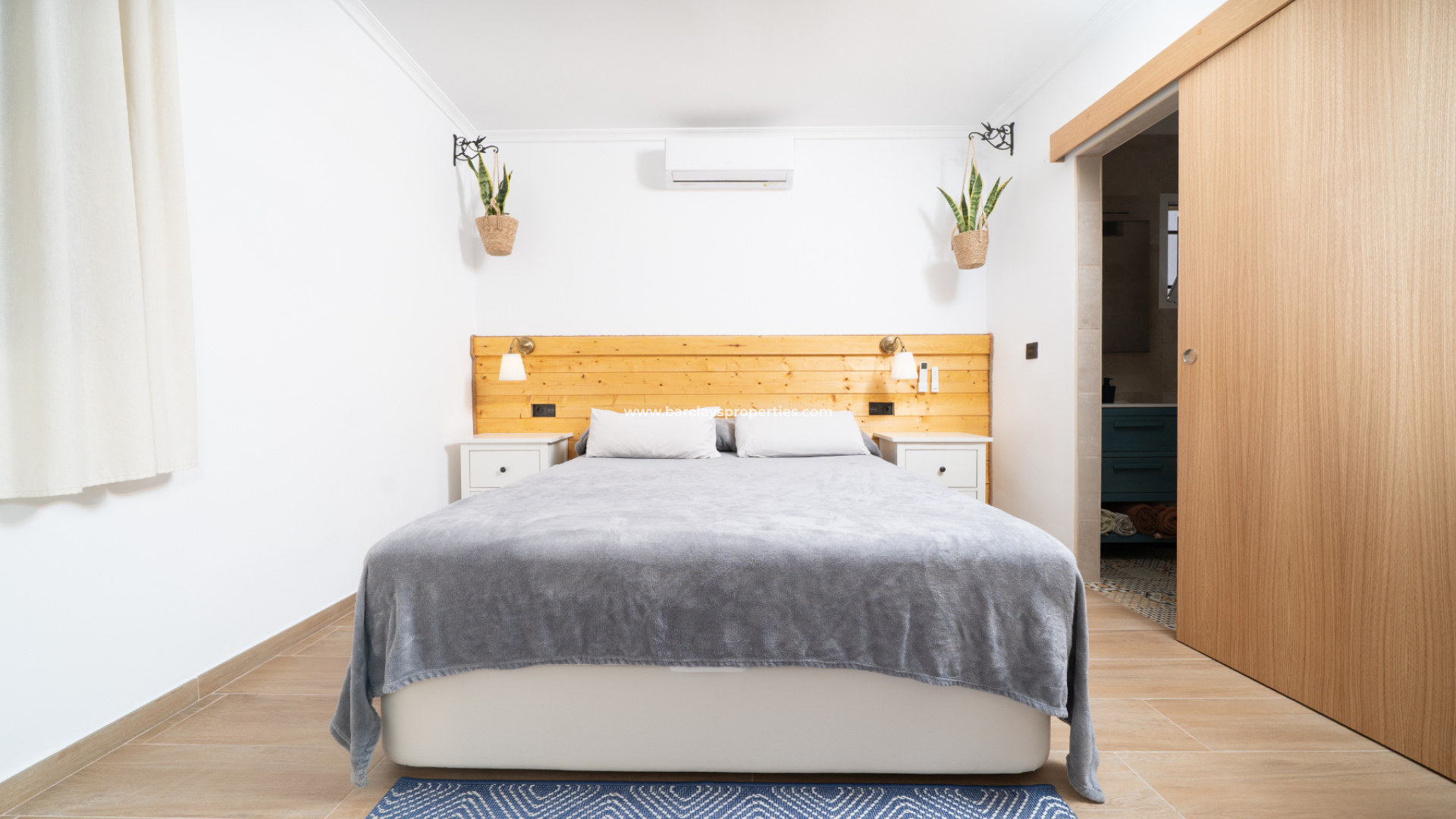 The main bedroom is a spacious double with a ceiling fan, air conditioning, and an ensuite bathroom with a shower, vanity unit, and WC. The second bedroom is a double with air conditioning, and the third is another double with a ceiling fan and air conditioning. A separate bathroom includes a shower, vanity unit, and WC.