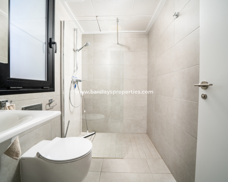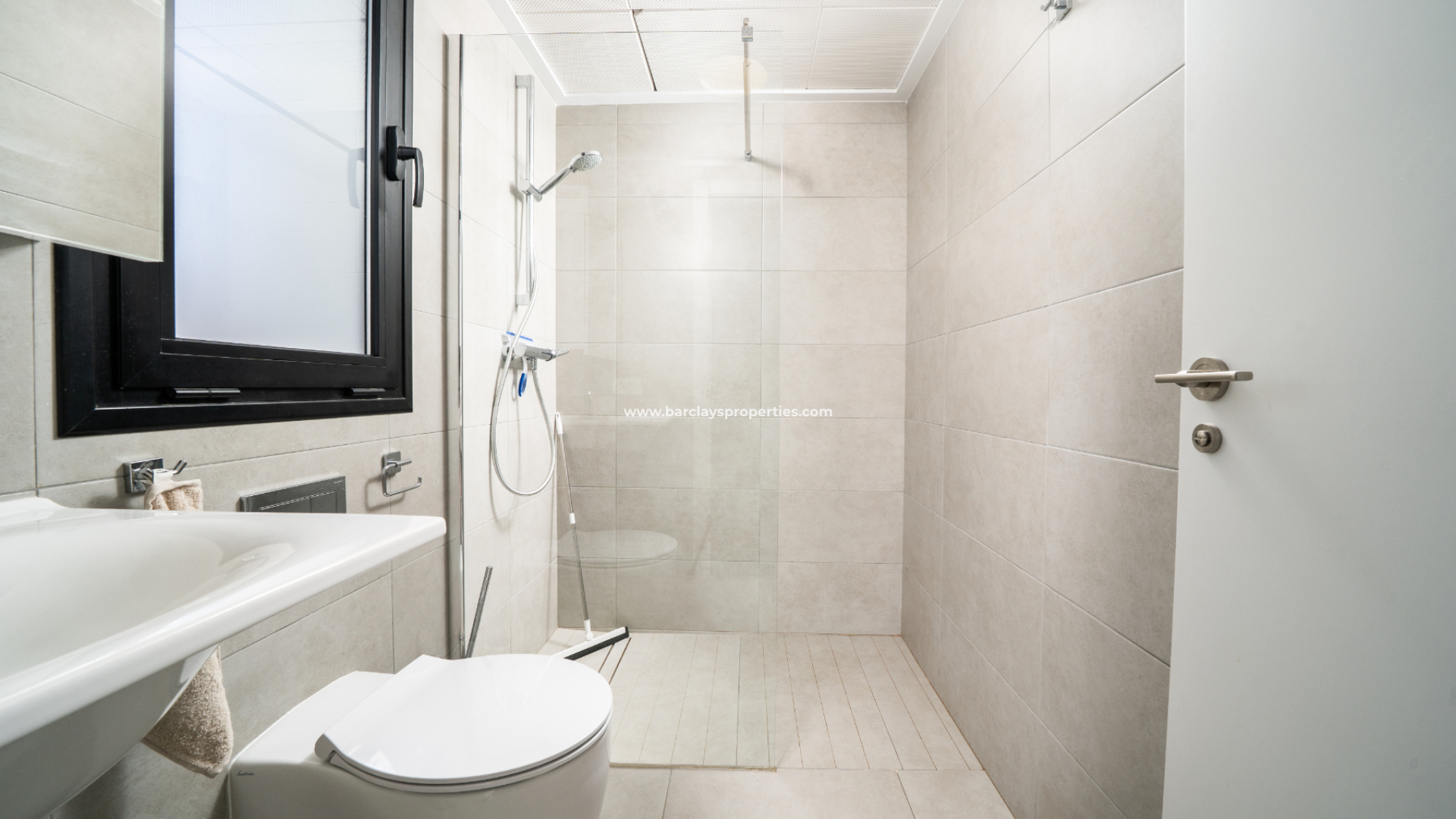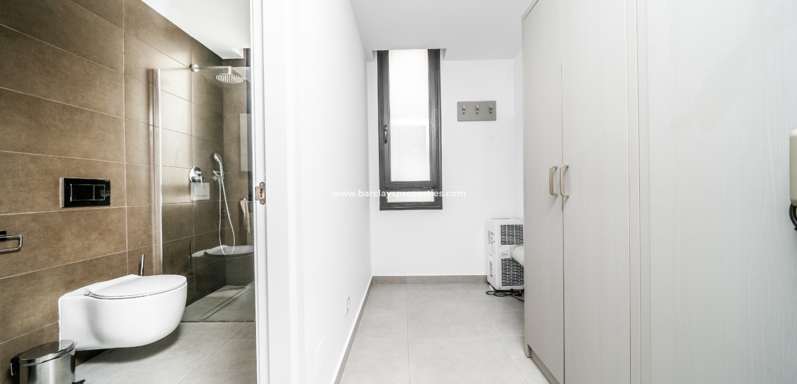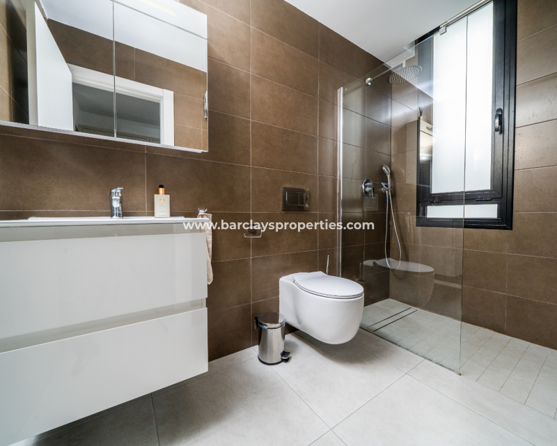 The ground floor features a double bedroom with direct access on both sides to the garden and a bathroom with a walk-in shower, suspended toilet, sink and LED mirror. Upstairs, the second double bedroom includes a wardrobe area, an en-suite bathroom with all modern fixtures and fittings, and patio doors that open to the outdoors. The master suite offers additional privacy with its own en-suite, wardrobe area, and an en-suite bathroom with walk-in shower and modern fixtures and fittings. The master bedroom also has access to the wrap around sun terrace accessible from the other upstairs bedroom as well as a door from the landing.