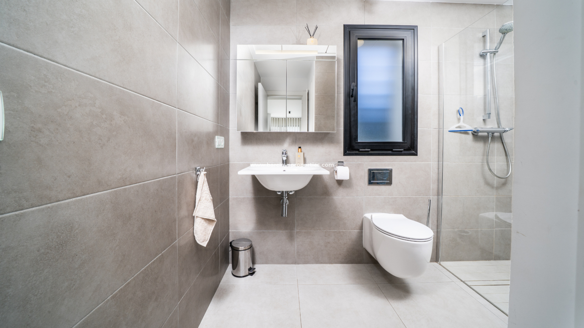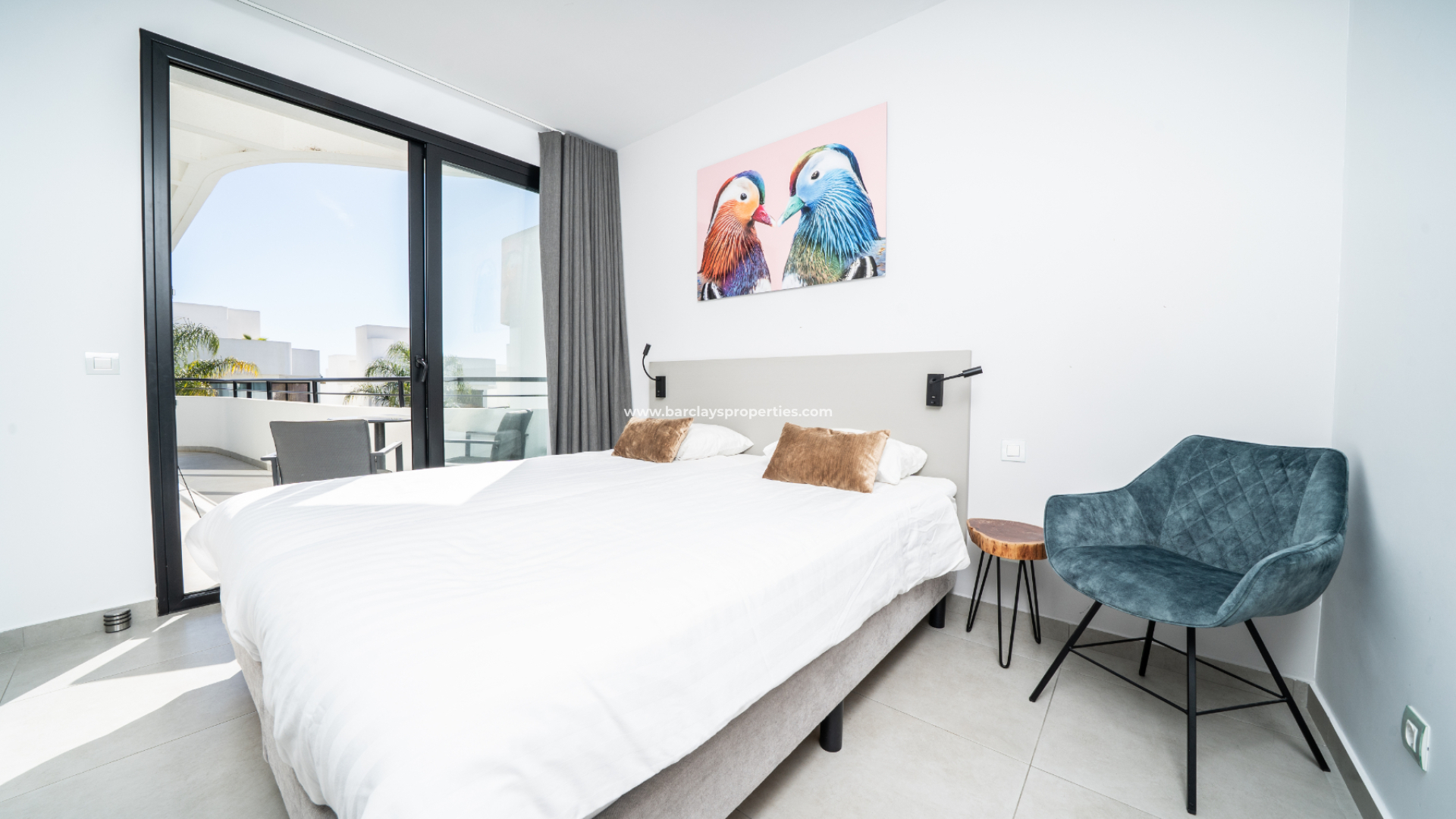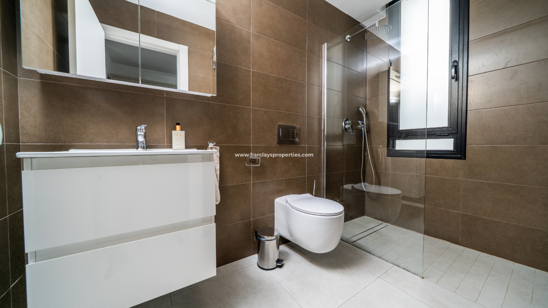 The ground floor features a double bedroom with direct access on both sides to the garden and a bathroom with a walk-in shower, suspended toilet, sink and LED mirror. Upstairs, the second double bedroom includes a wardrobe area, an en-suite bathroom with all modern fixtures and fittings, and patio doors that open to the outdoors. The master suite offers additional privacy with its own en-suite, wardrobe area, and an en-suite bathroom with walk-in shower and modern fixtures and fittings. The master bedroom also has access to the wrap around sun terrace accessible from the other upstairs bedroom as well as a door from the landing.