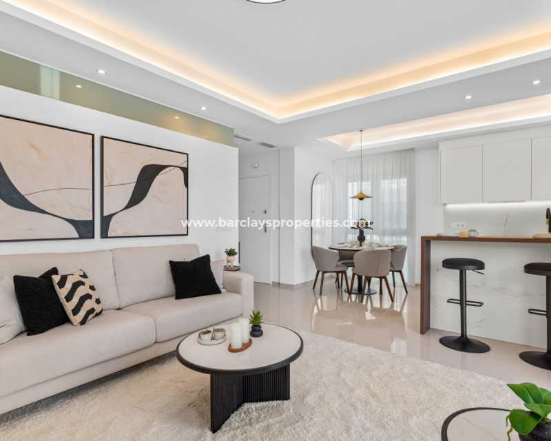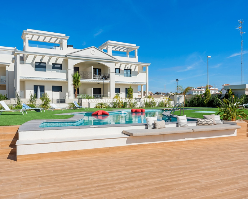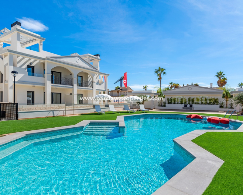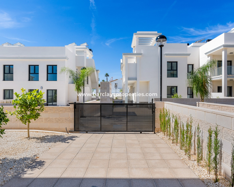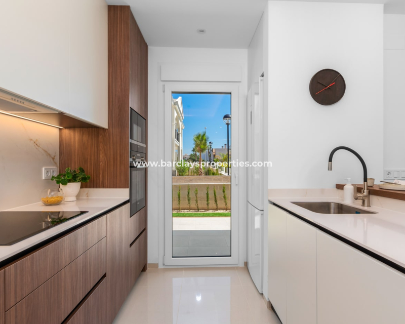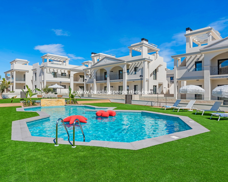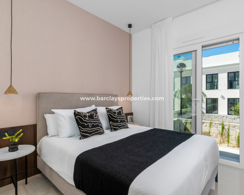 These stylish 2-bedroom, 2-bathroom apartments offer 79 m2 of well-designed living space on one level, featuring an open-plan kitchen, double-glazed windows, ➡️ and access to a beautiful communal swimming pool. Located in a quiet yet well-connected private community just 6 km from the beach, 4 km from golf, 1 km from all amenities, and 54 km from the airport. ➡️ Each apartment includes private parking, and excellent rental potential. Two layouts are available: choose between 2 or 3 bedrooms. Ground floor models come with spacious private gardens ranging from 90 to 155 m2, while first-floor units offer private rooftop solariums—ideal for enjoying the Mediterranean climate.