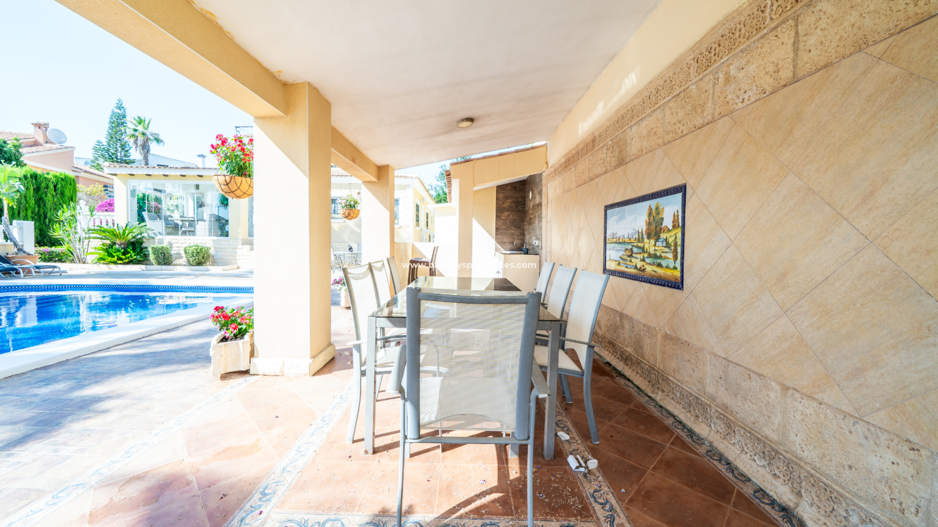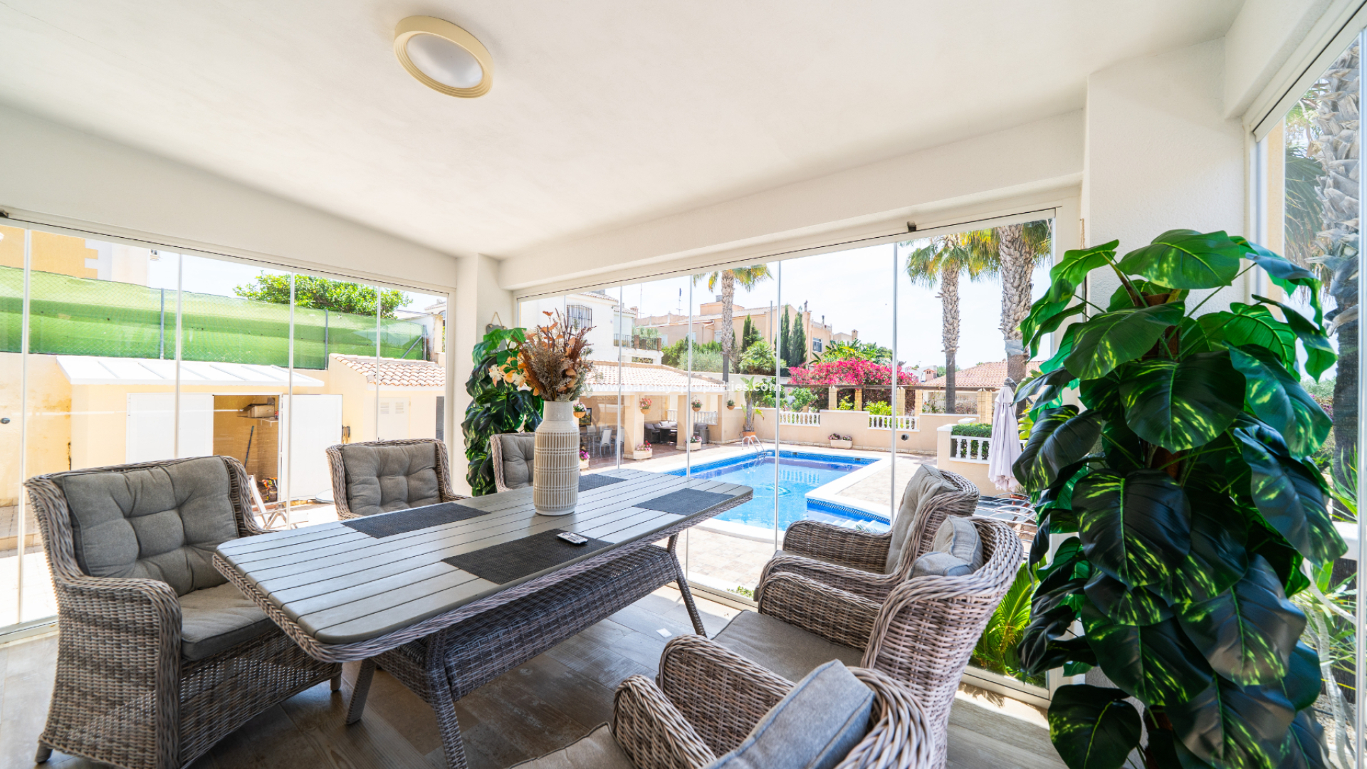 ➡️ Set on a generous 1,393 m² plot, this exceptional detached villa in the sought-after Urbanisation La Marina offers ➡️ 353 m² of built space across two self-contained homes. The main residence features four spacious bedrooms, all with en-suite bathrooms, a bright living-dining area, an independent kitchen, utility room, and a walk-in wardrobe. ➡️ The adjoining guest accommodation includes two additional bedrooms with en-suite bathrooms, a modern open-plan kitchen and living area—ideal for visitors or as a rental unit. Outdoors, the property boasts ✅ a private pool, exterior shower, BBQ area, garden bar, storage room, and an enclosed terrace with pool views, perfect for year-round enjoyment. Additional features include ✅ air conditioning, double-glazed windows, electric gate, off-road parking, and quiet surroundings just 1.5 km from amenities. With excellent rental potential, this extended home combines privacy, comfort, and convenience near the beach and airport.