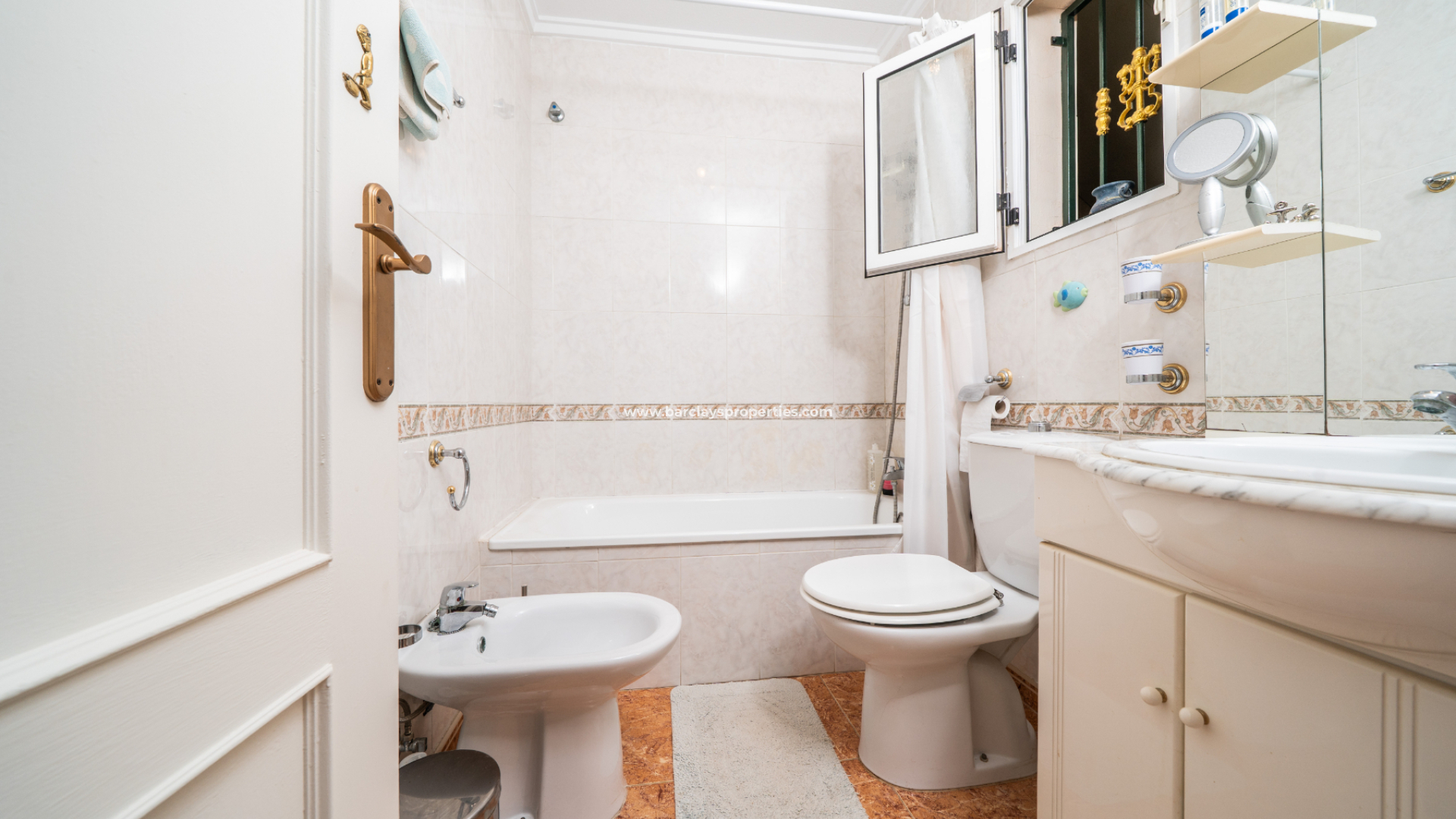 From the bathroom there are three double bedrooms. The main bedroom includes a fitted wardrobe, ceiling fan, and an en-suite bathroom with walk-in shower, WC, and vanity unit. The second bedroom, currently used as a dining room, has a fitted wardrobe, while the third bedroom comes with a ceiling fan. A family bathroom with bath, WC, bidet, and vanity unit completes the interior layout.