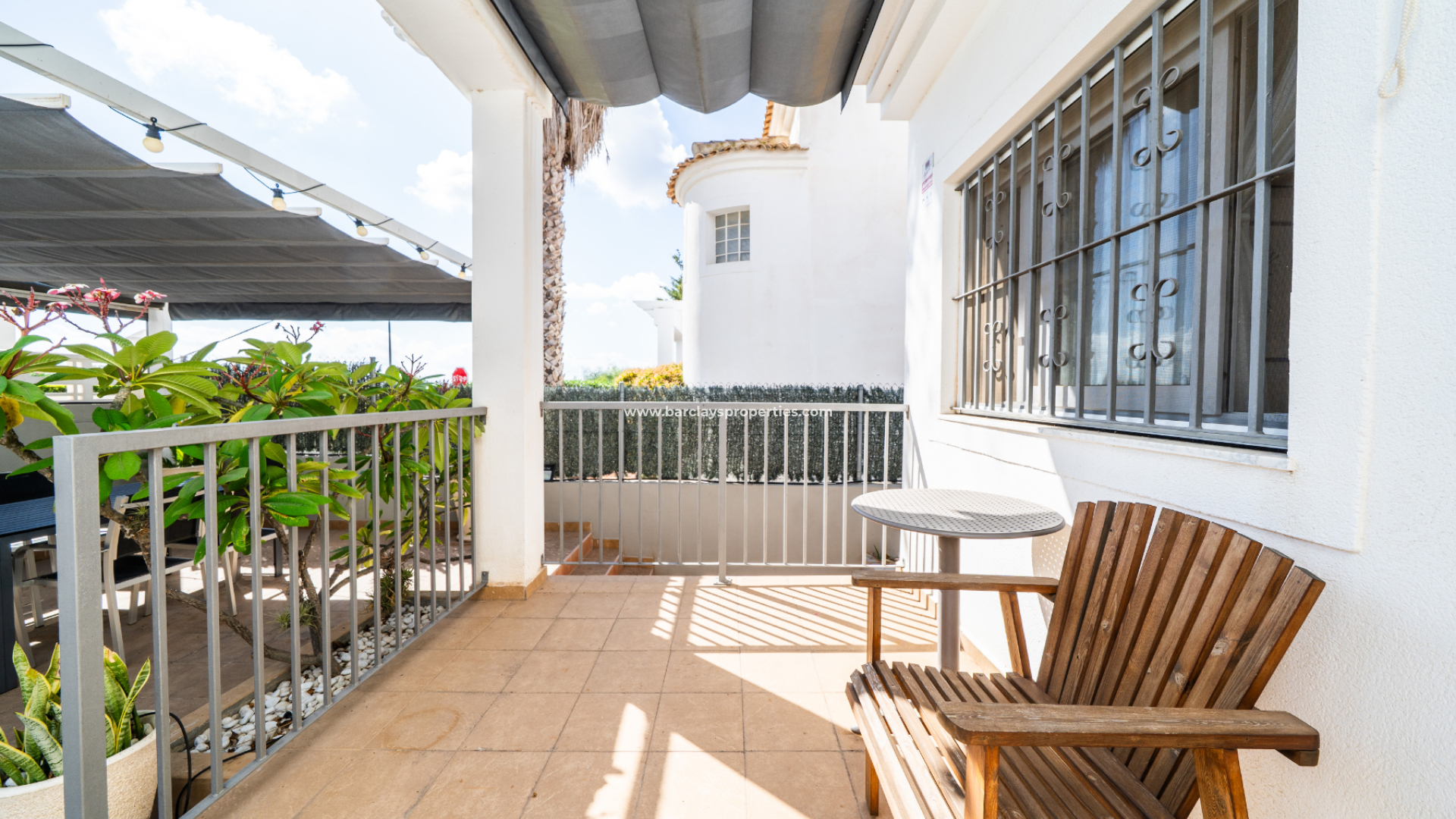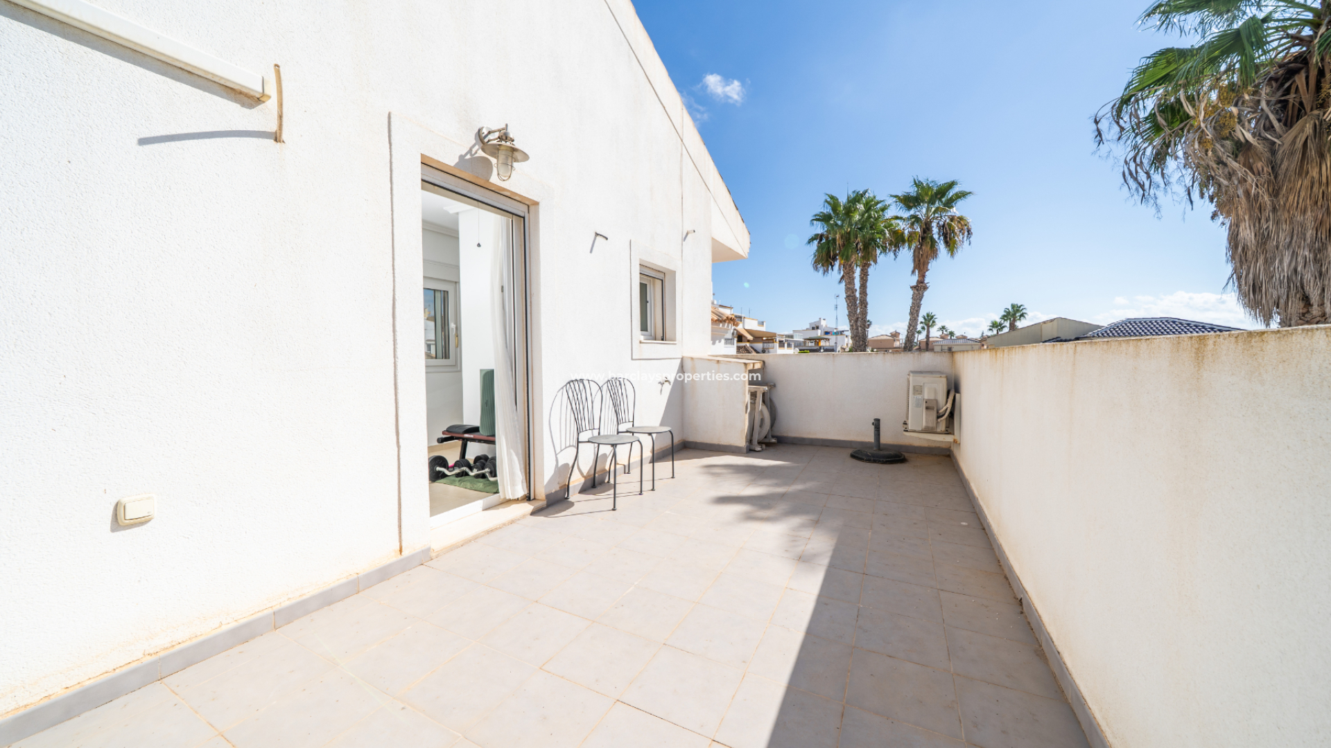 The exterior includes a gravelled garden with a lemon tree, palm trees and shrubs adding a splash of colour, a front terrace with sun awnings, and a BBQ area, ideal for outdoor living and dining.