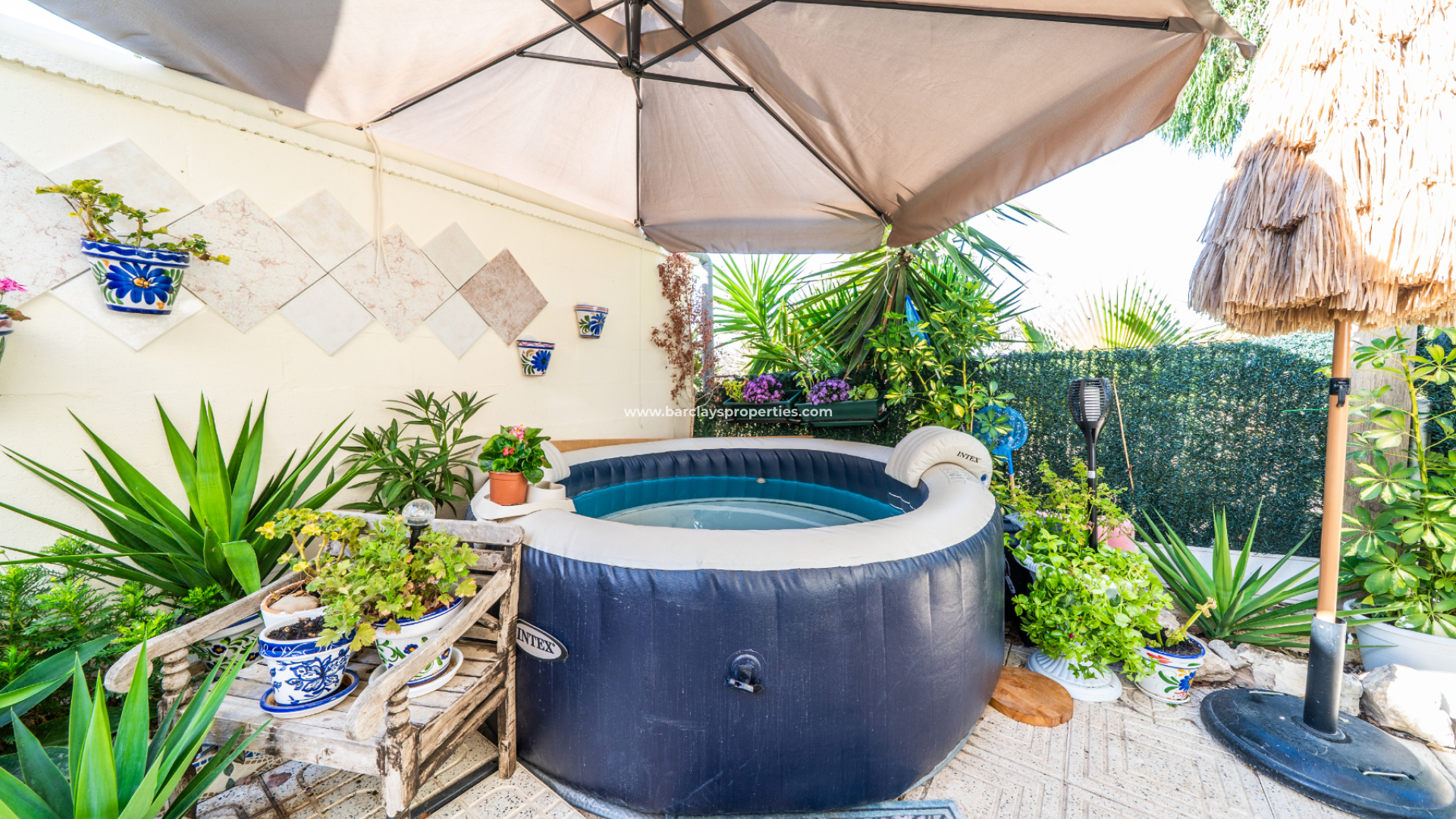 The garden is designed for easy upkeep and relaxation, featuring a blow-up jacuzzi, parasol, and outdoor shower. The self-contained annex provides a generous double bedroom with en-suite bathroom, making it perfect for guests, extended family, or even as a rental opportunity to generate extra income.