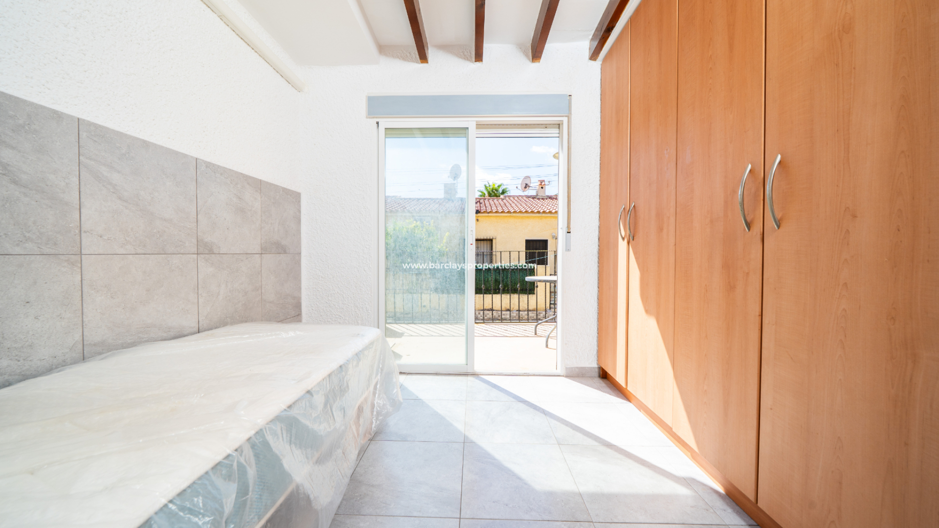 The home features a bright living room in its original layout with tilt and turn windows fitted with mosquito nets. The newly fitted modern look open plan kitchen is fully electric, designed to maximise convenience and space. The first bedroom includes air conditioning. The bathroom is fitted with a shower, WC, and vanity unit with LED mirror. A versatile middle room also benefits from air conditioning, while the second bedroom has been converted to provide extra space and plenty of storage with fitted wardrobes and access to the rear sun terrace.
