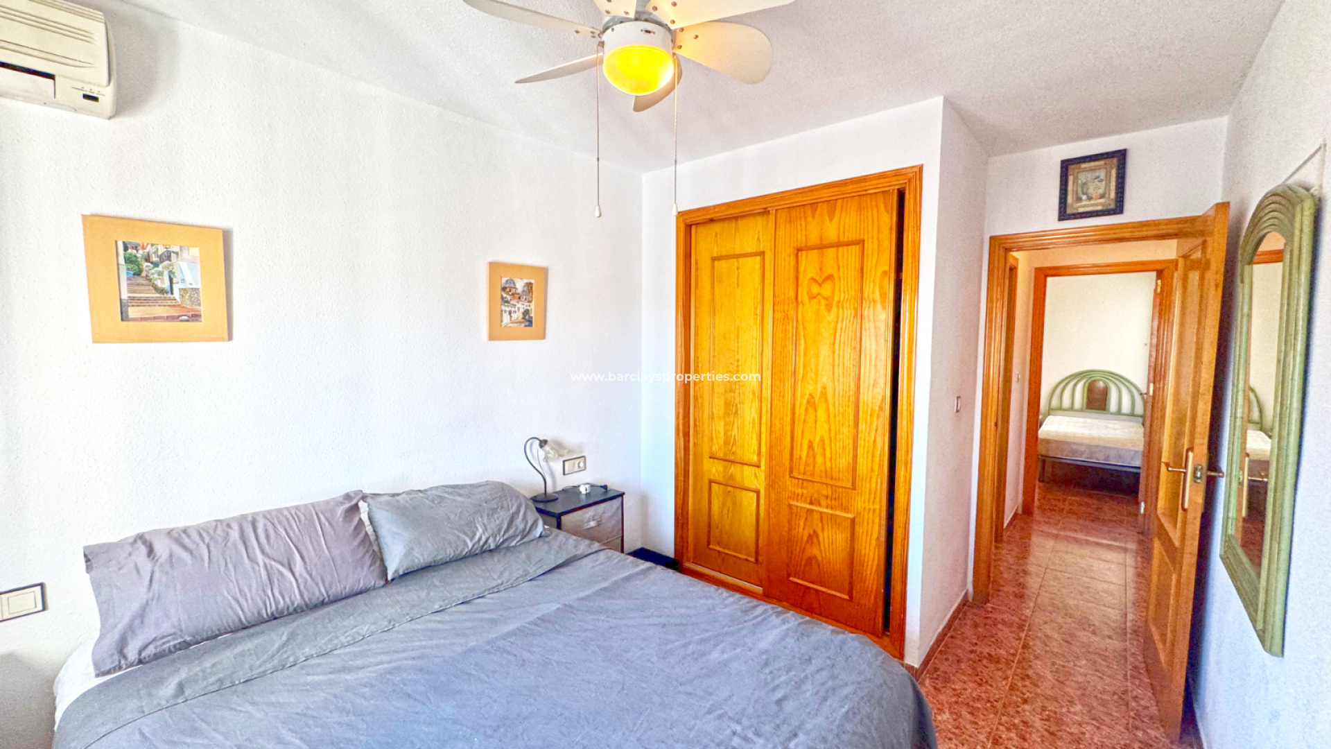 Inside, the living room leads to two comfortable bedrooms. The main bedroom includes a double bed, air conditioning, a fitted wardrobe, and a ceiling fan, while the second bedroom has twin beds and a fitted wardrobe.