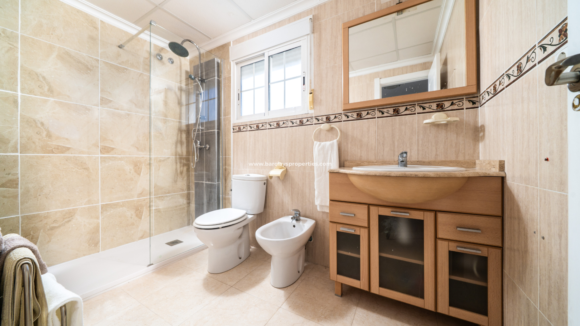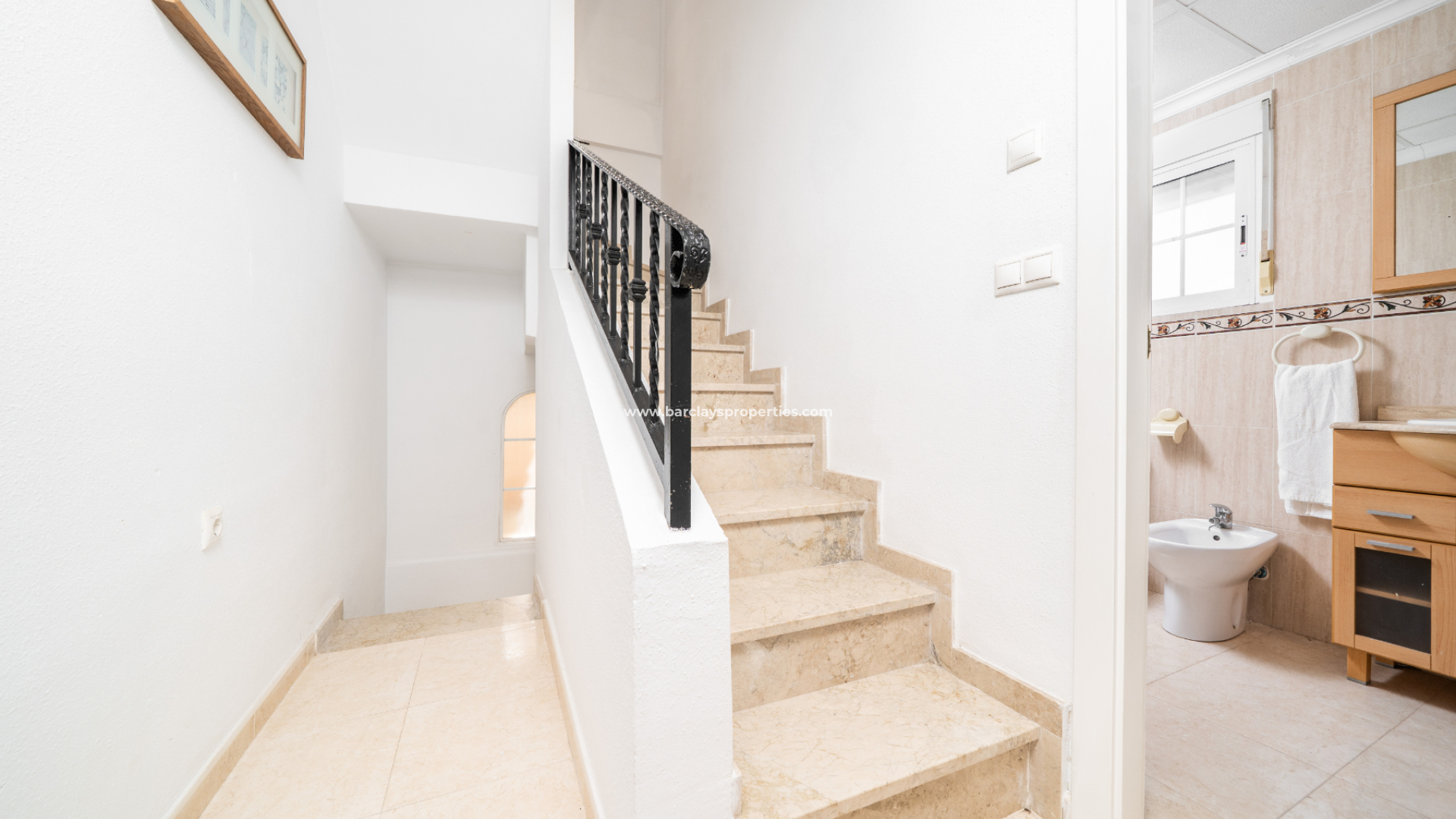 Upstairs, there are two further bedrooms, each with access to a private balcony, along with a second bathroom. The villa’s position provides plenty of morning sunshine and a light-filled atmosphere throughout the day. Residents benefit from a beautifully kept communal pool, perfect for unwinding or spending time with family and friends during the warmer months. Combining a peaceful setting with excellent access to amenities, this property also represents a fantastic opportunity for rental investment.
