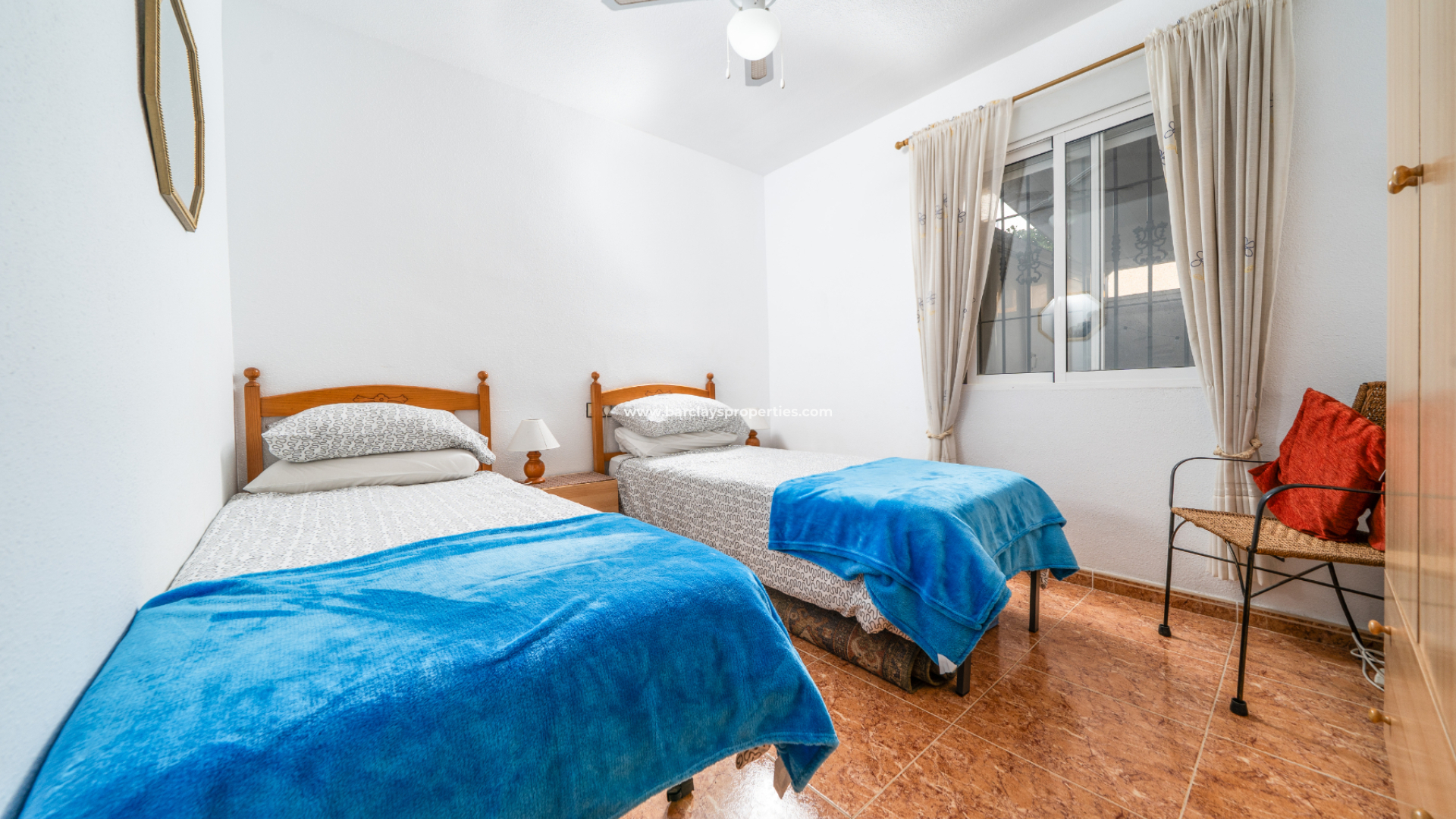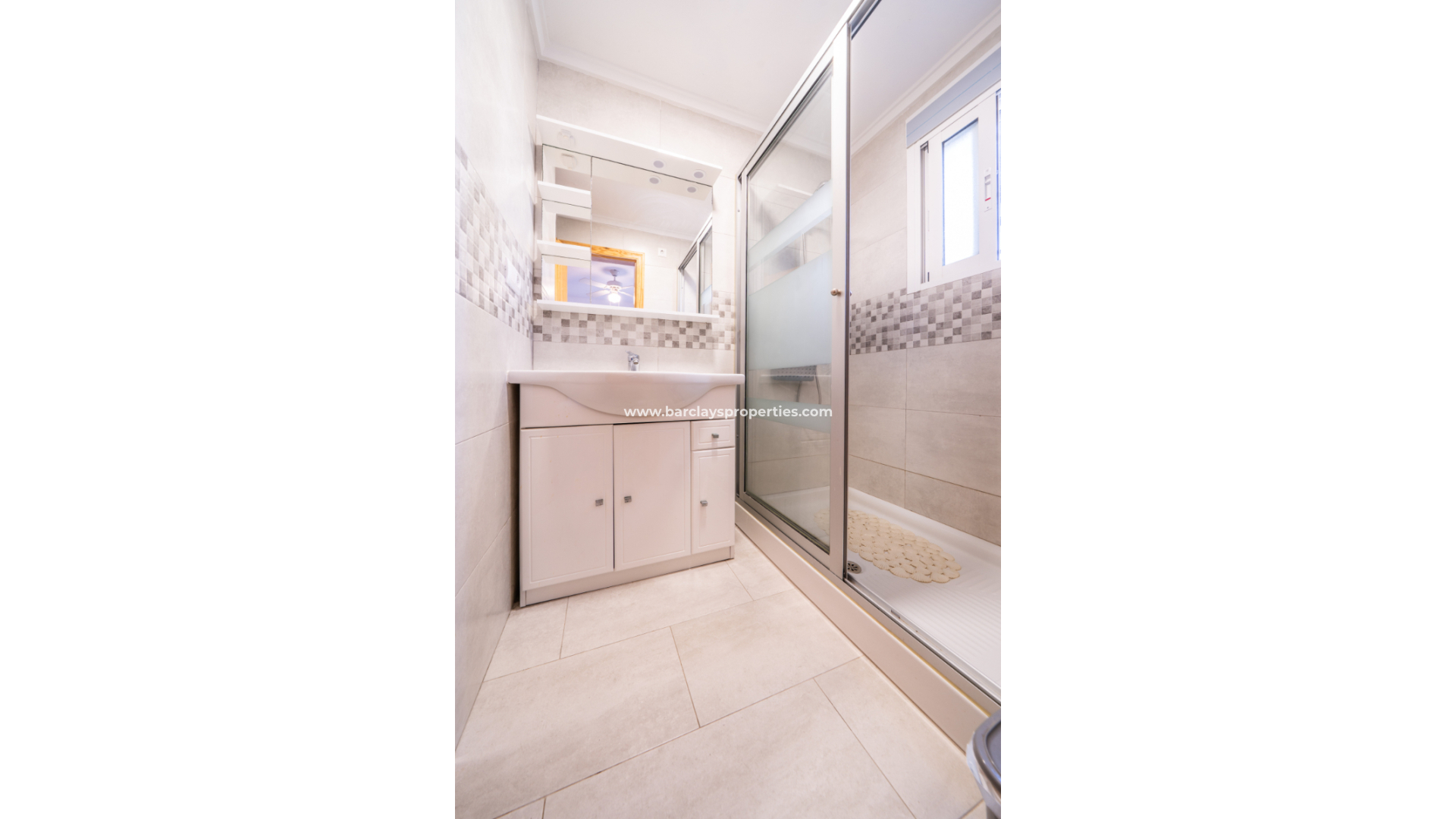 There are three bedrooms in total. The main bedroom is a spacious double with fitted wardrobes, ceiling fan and a modern en-suite bathroom complete with walk-in shower, vanity unit and WC. The second bedroom is also a double with fitted wardrobes and ceiling fan, while the third bedroom is a twin room with ceiling fan, ideal for guests or family. A separate bathroom serves the remaining bedrooms and includes a shower, WC and vanity unit.