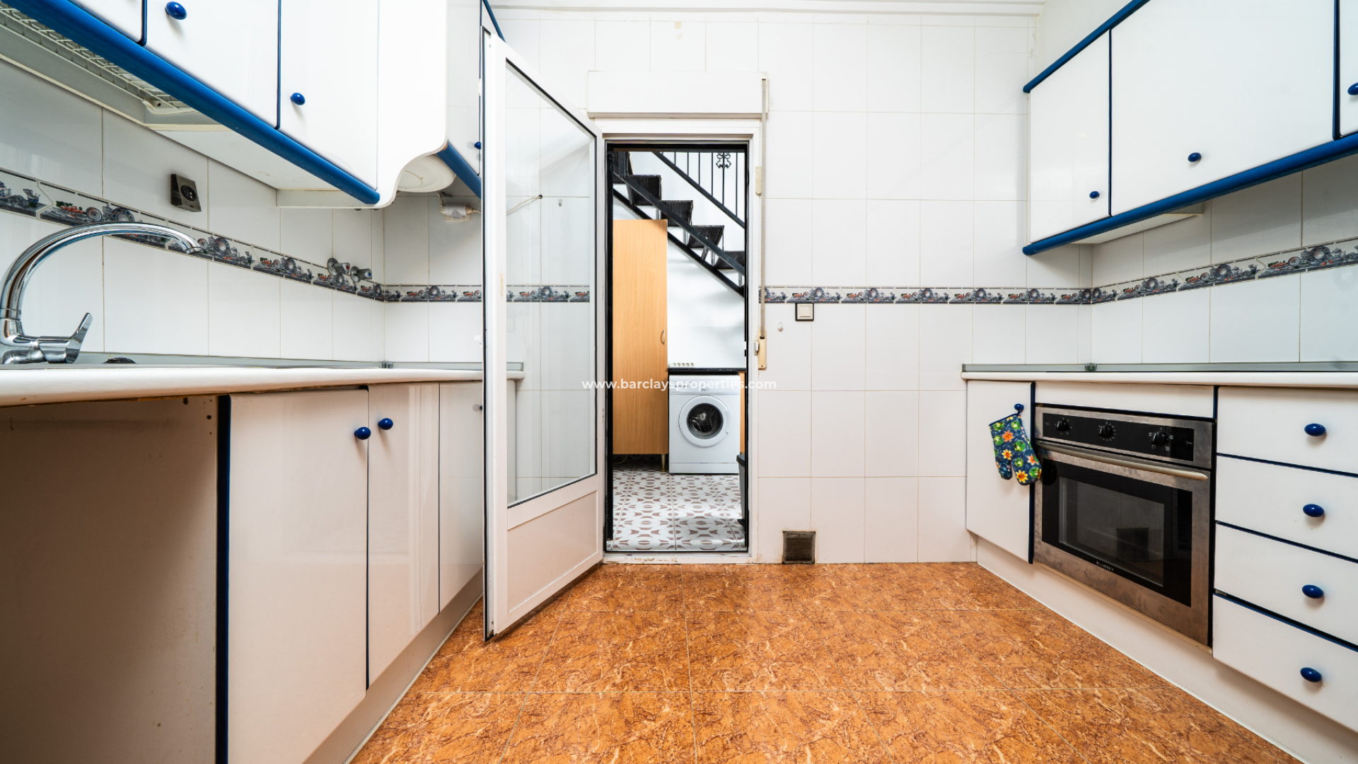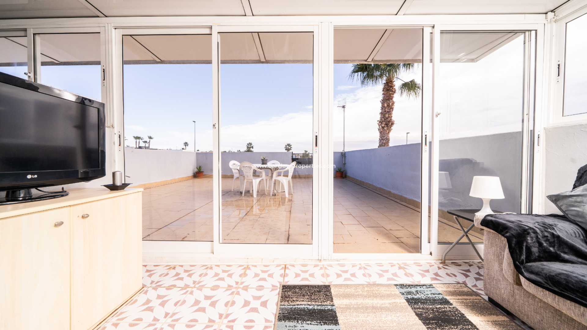 The fitted kitchen is fully electric and leads to the interior patio /utility area. We go upstairs to find a conservatory and spacious solarium with open views over the countryside towards Guardamar and the sea.