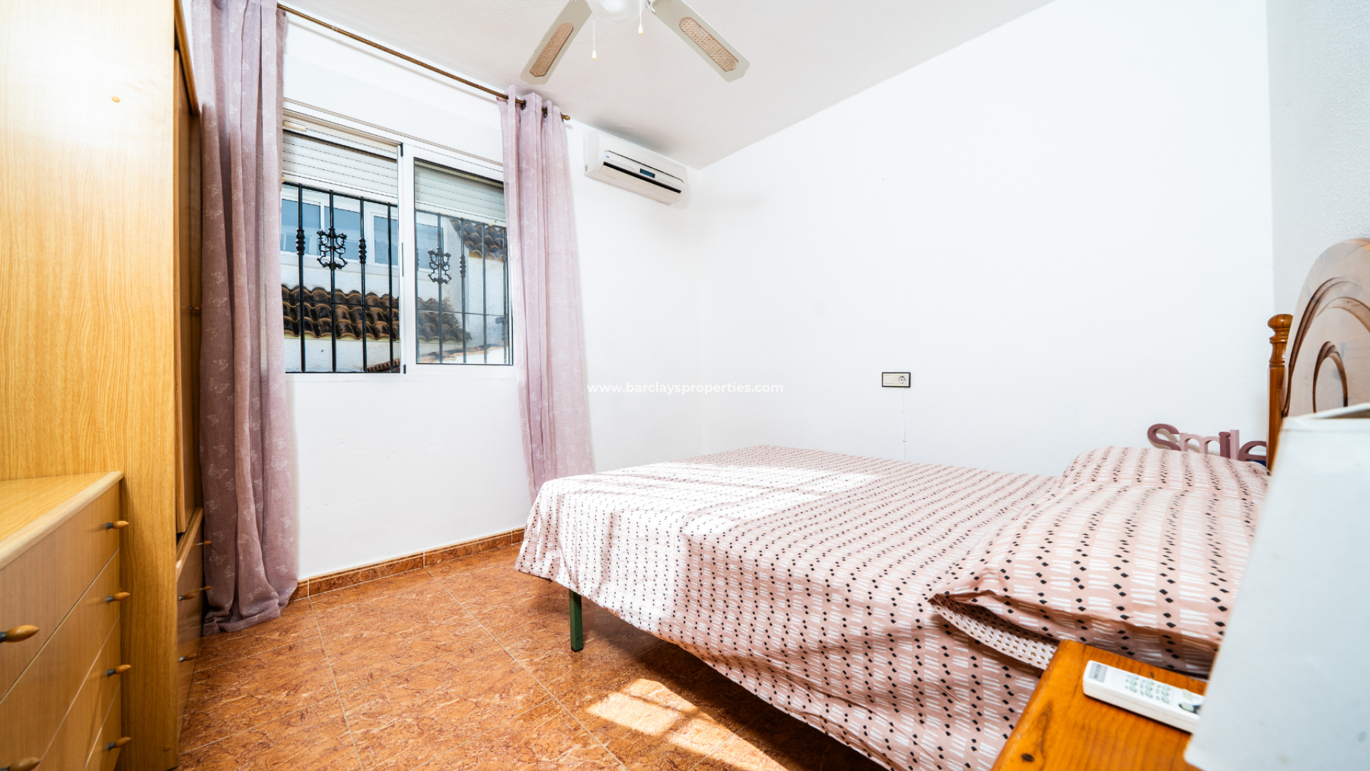 There are three bedrooms in total. The first bedroom is a double with fitted wardrobes, ceiling fan, and air conditioning. The second bedroom is a twin room, also with fitted wardrobes, ceiling fan, and air conditioning. The third bedroom is another double, equipped with a ceiling fan and air conditioning. The bathroom includes a bath, WC, vanity unit, and an electric towel rail.
