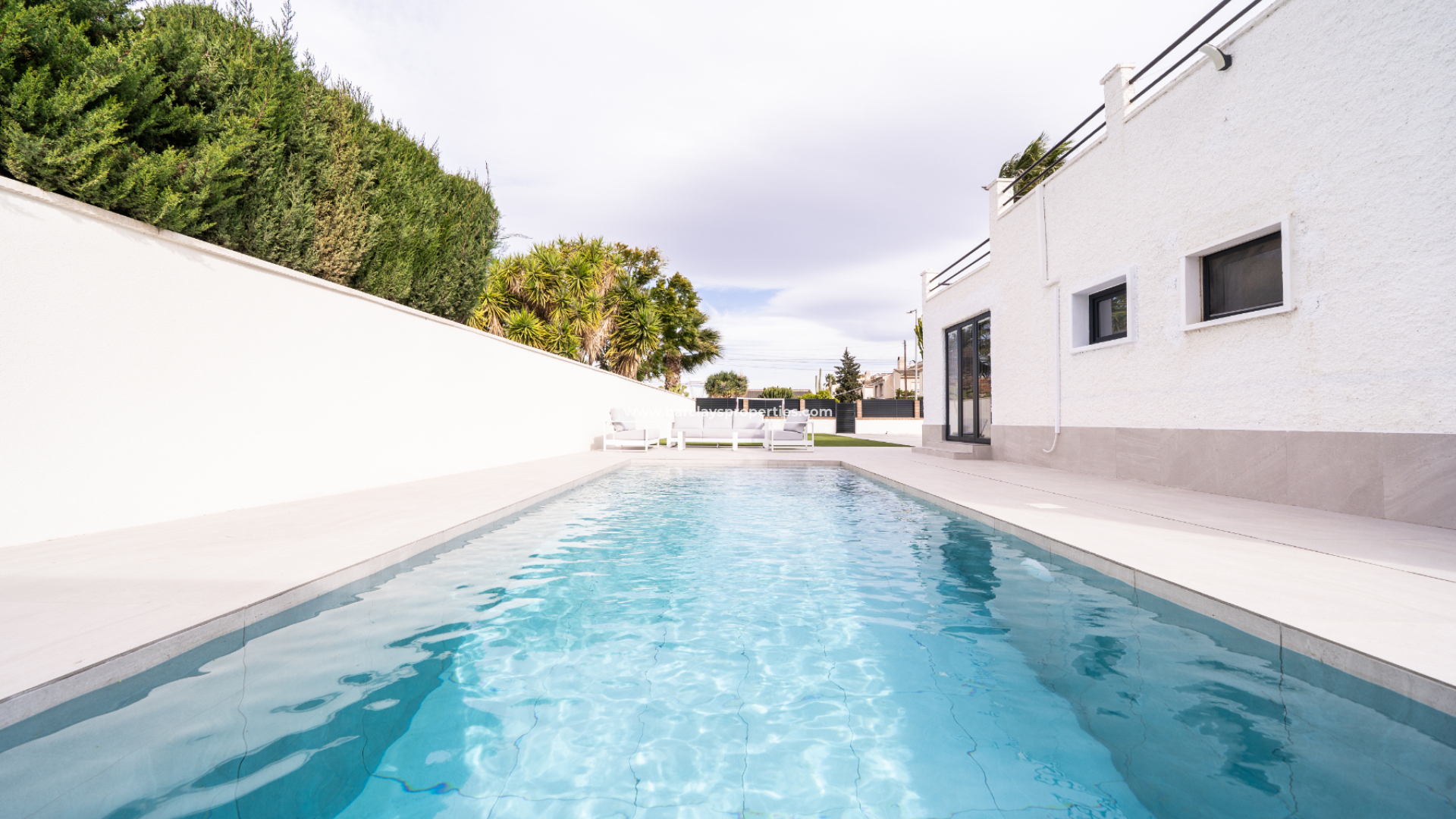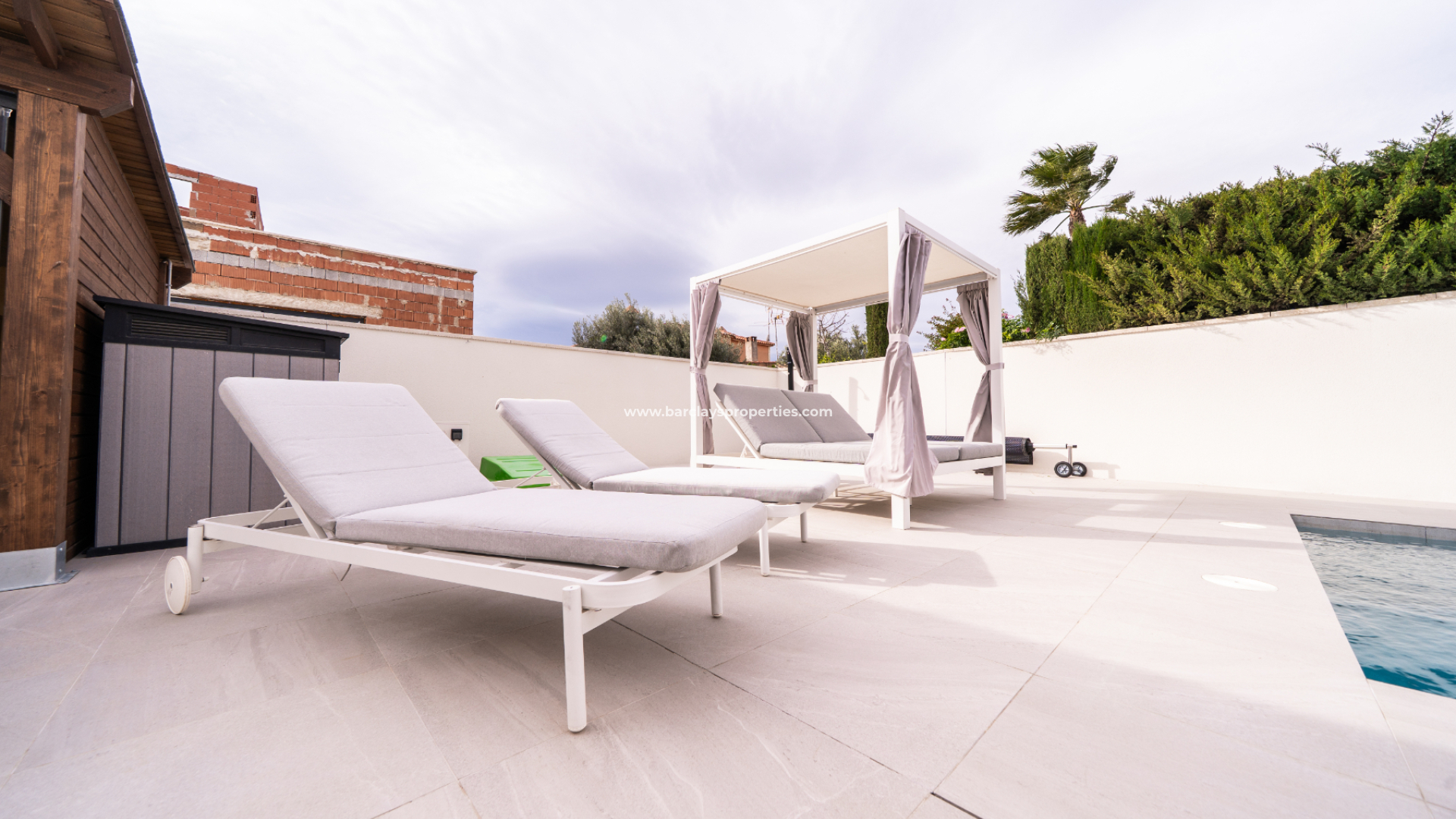 Outside, the property continues to impress with ➡️ a heated 8 x 4 swimming pool and solar shower, perfect for enjoying the Mediterranean climate throughout the year. A pergola provides shaded seating, while a large wooden room serves as a dedicated chill-out area. The garden is designed for low maintenance with artificial grass, a selection of mature trees, and an aluminium shed for additional storage.