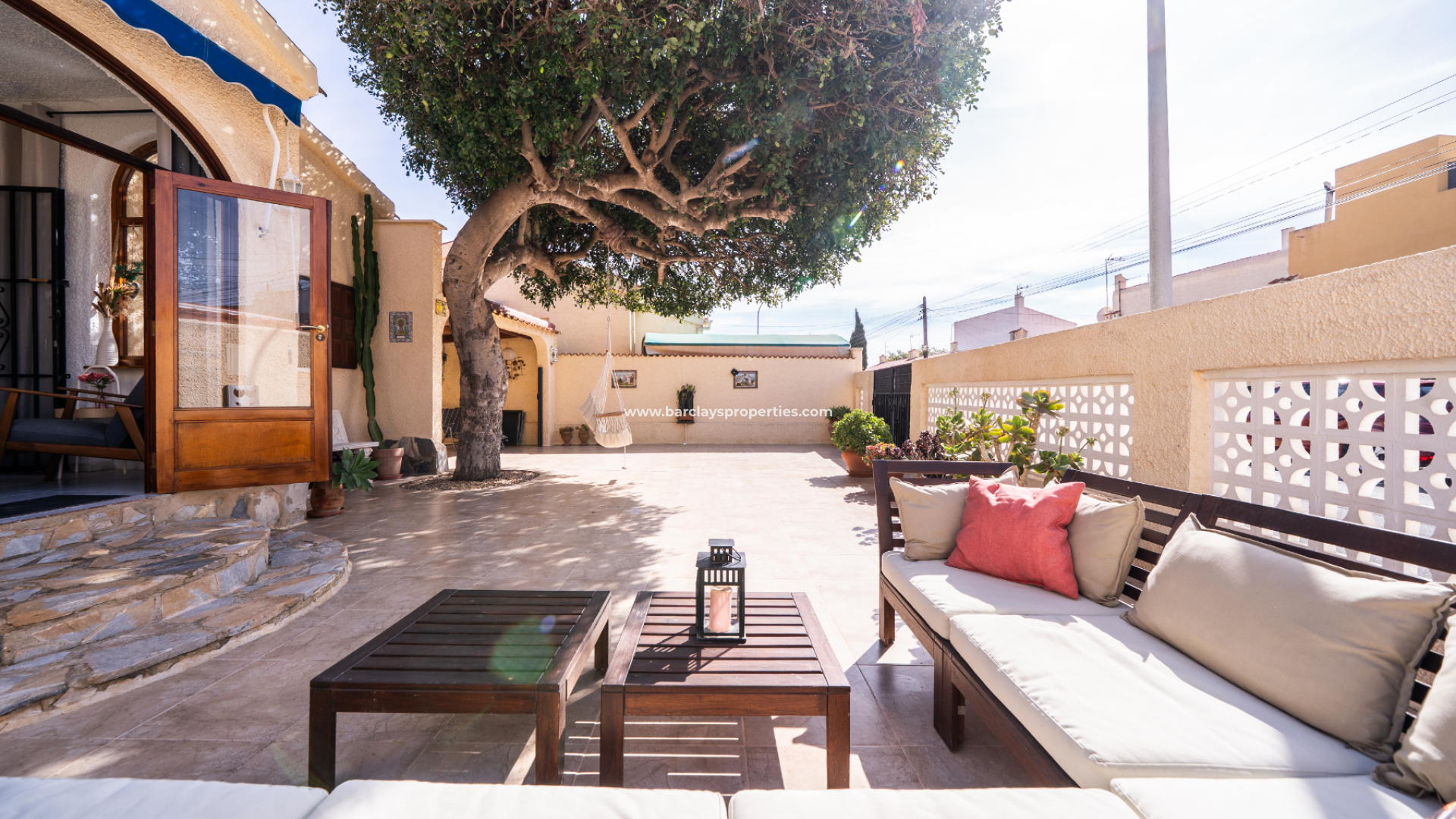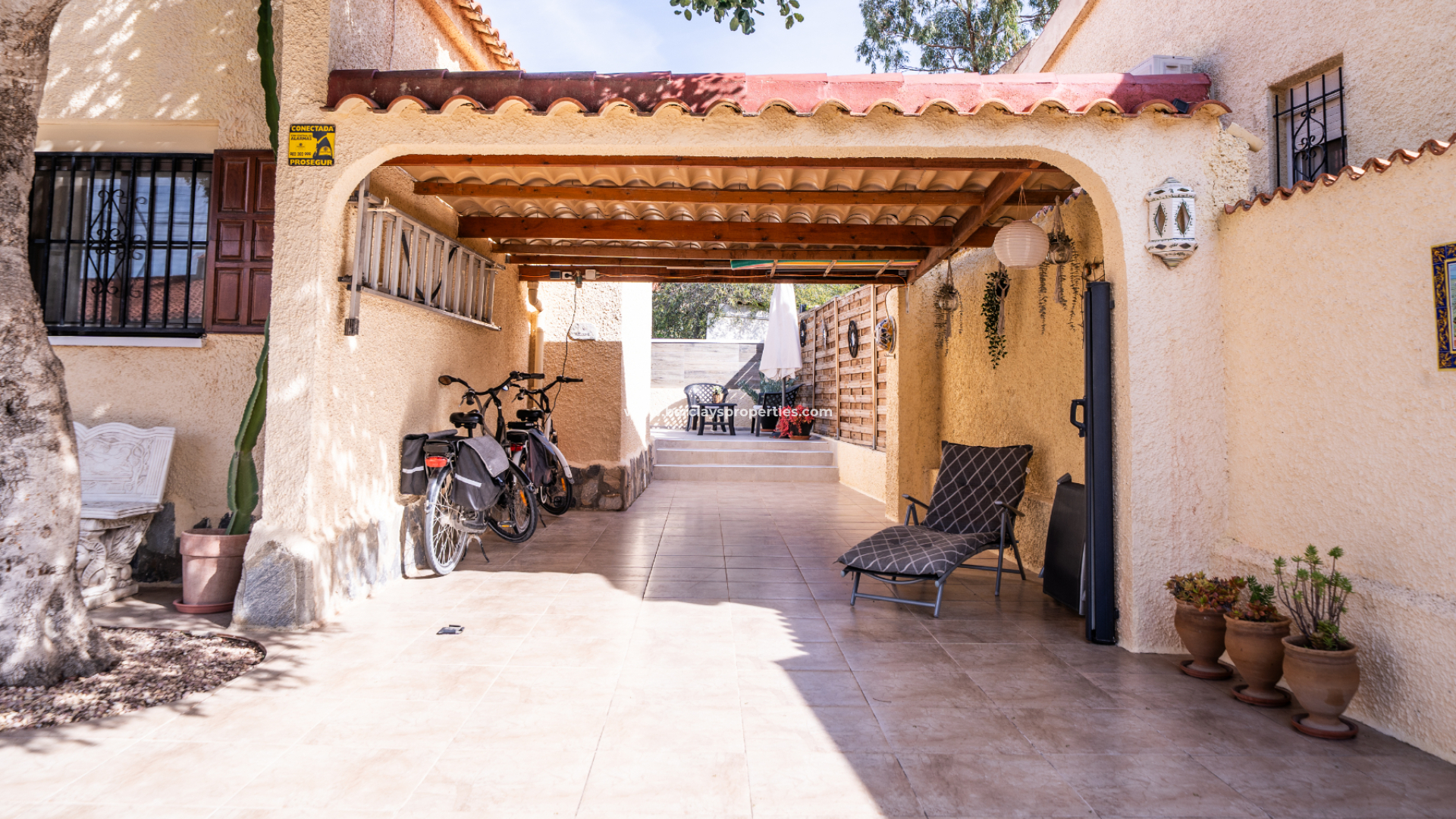 Set on a fully tiled plot for low maintenance, the garden includes an established tree that provides natural shade, creating a pleasant outdoor seating area. There is also a car port, offering convenient off-road parking and space to construct a private swimming pool if one so desired.