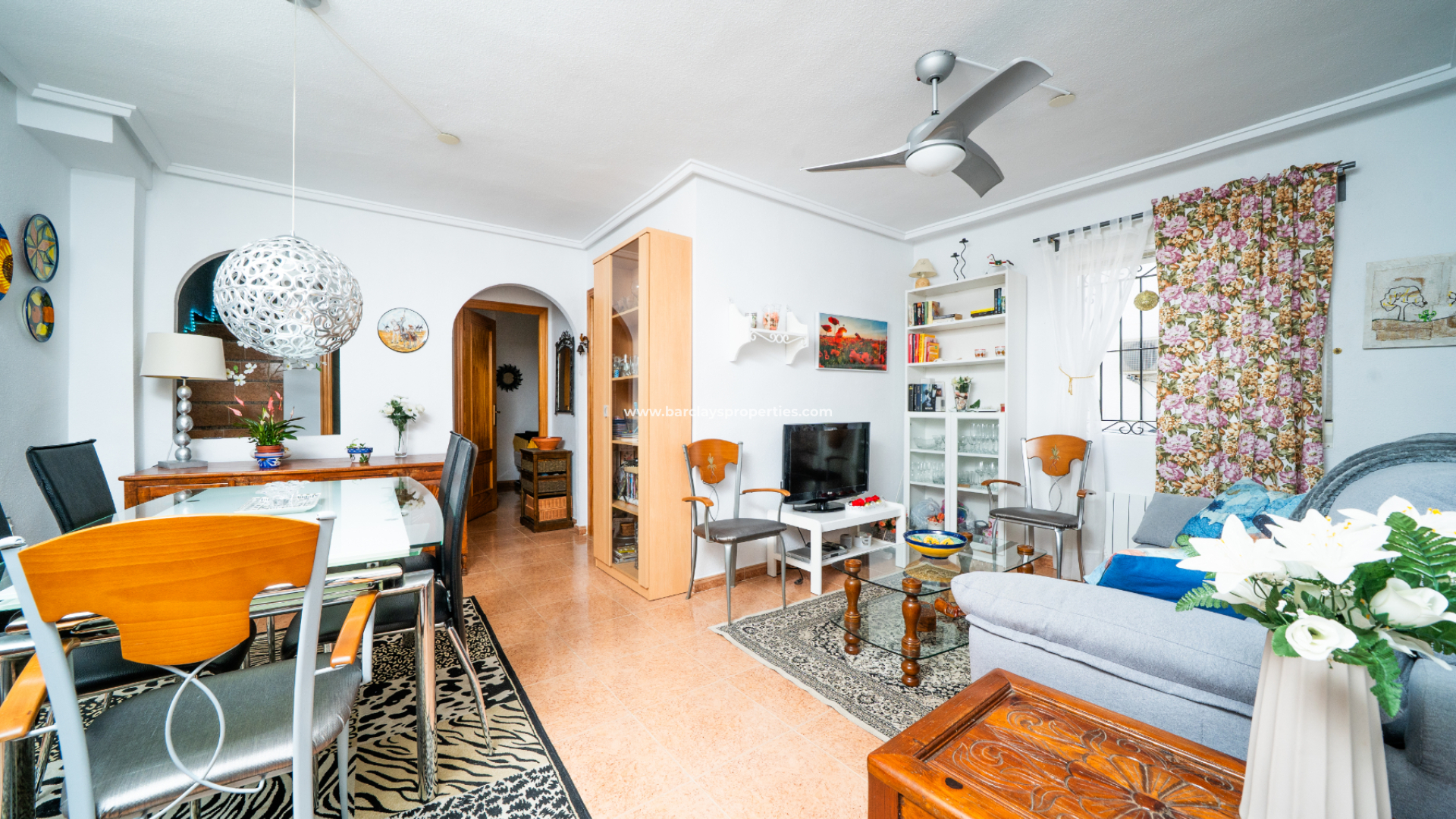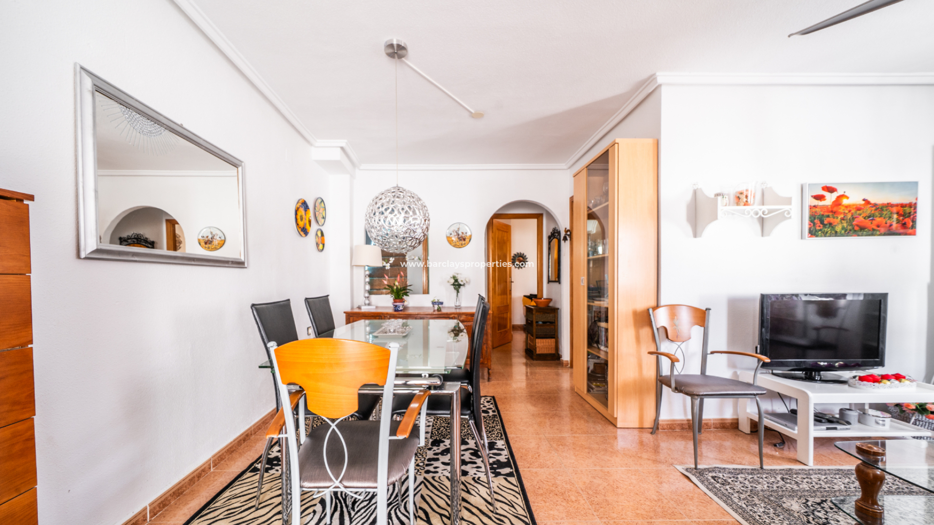 Inside, the spacious living room features air conditioning, a ceiling fan, and a dedicated dining space, creating a comfortable and practical area for everyday living. The independent kitchen is fully fitted and offers direct access to the rear terrace.