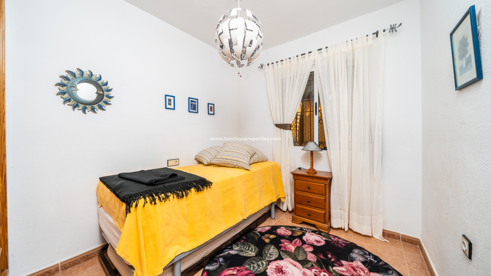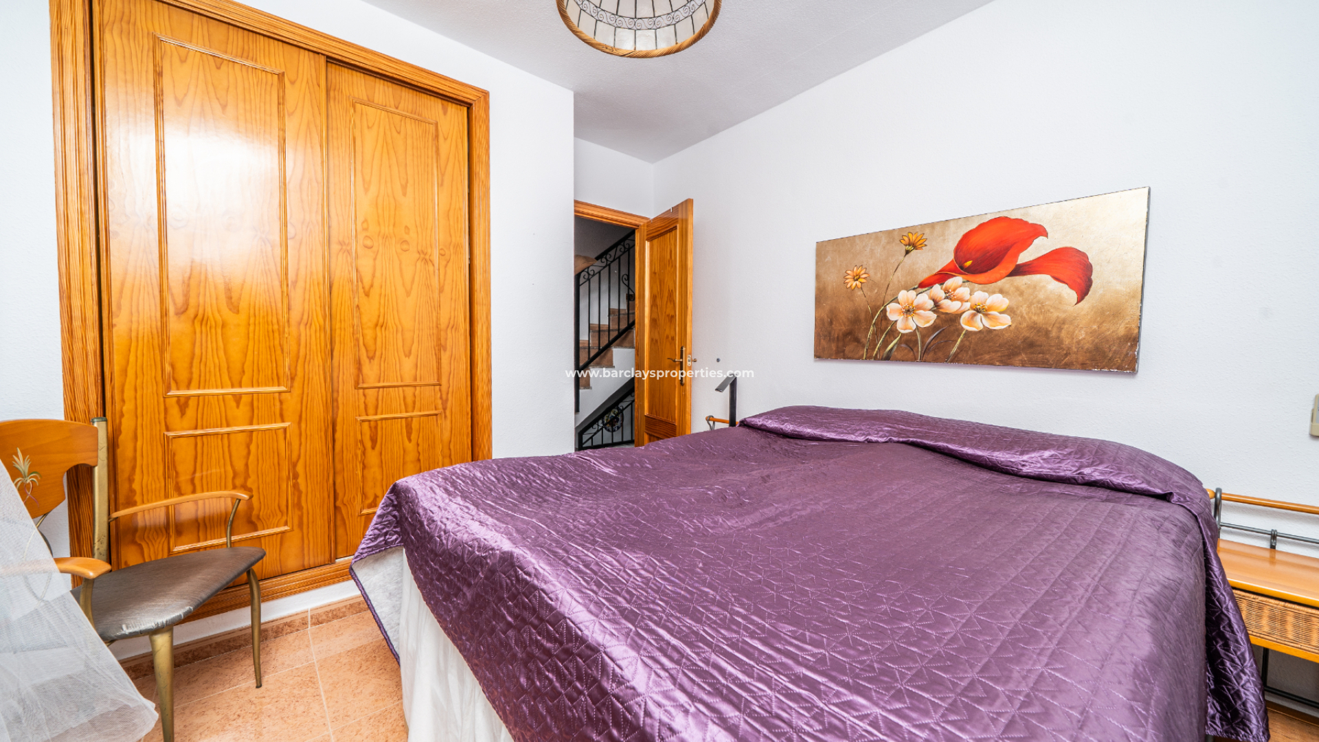 The accommodation includes three well-proportioned bedrooms. Bedroom one is a twin room with fitted wardrobes, while bedroom two is also a twin room and benefits from air conditioning and fitted wardrobes. The master bedroom is generously sized, with air conditioning, fitted wardrobes, and patio doors opening onto a private balcony.