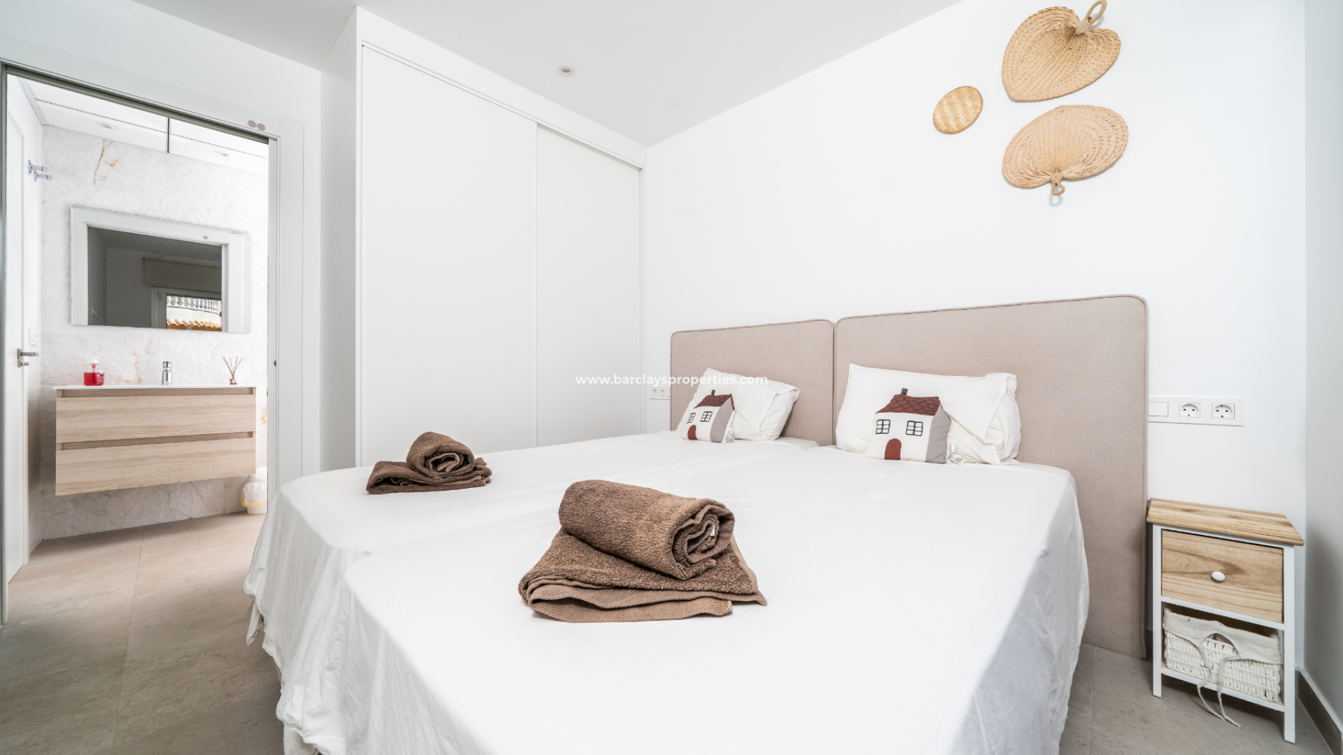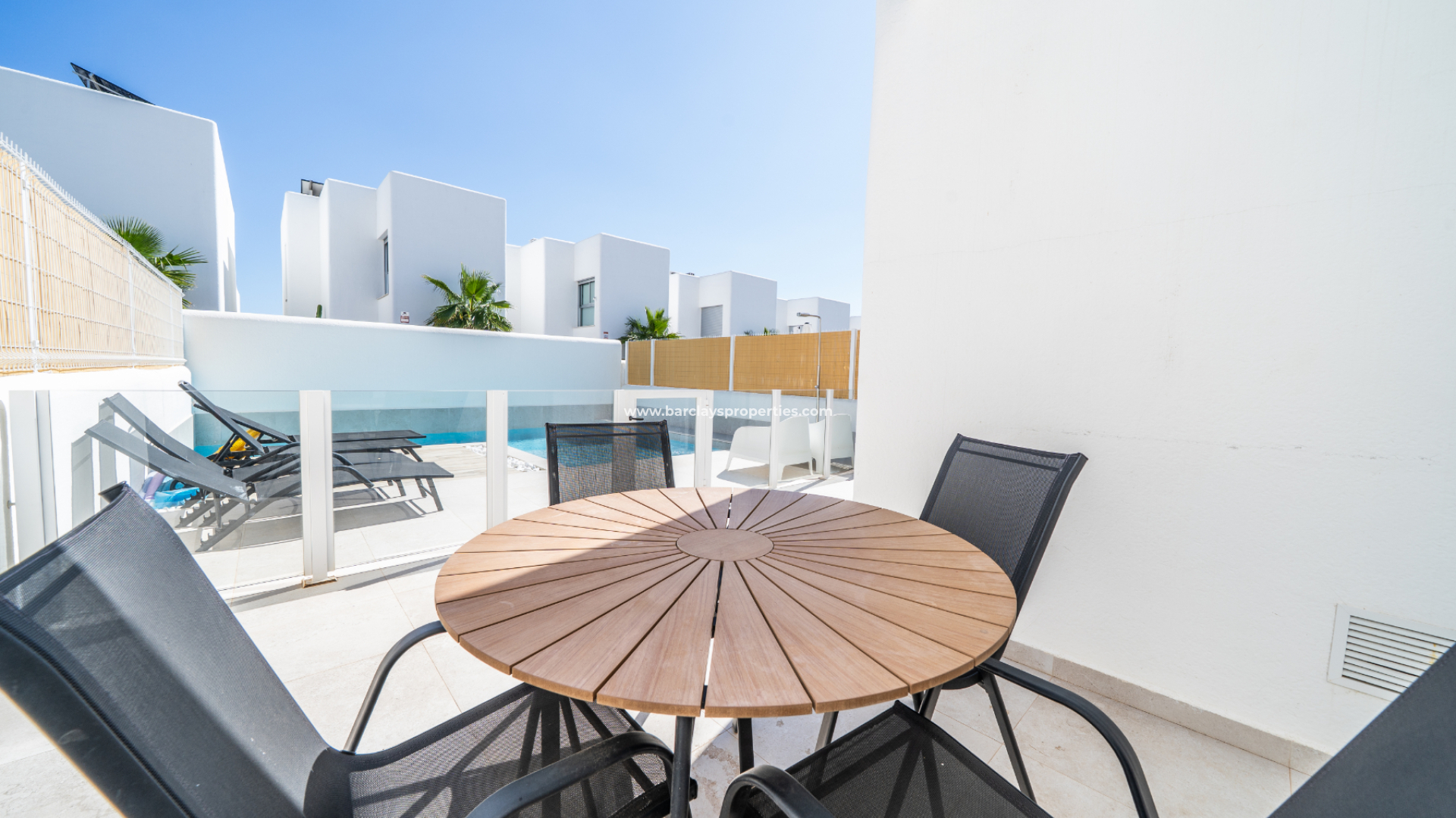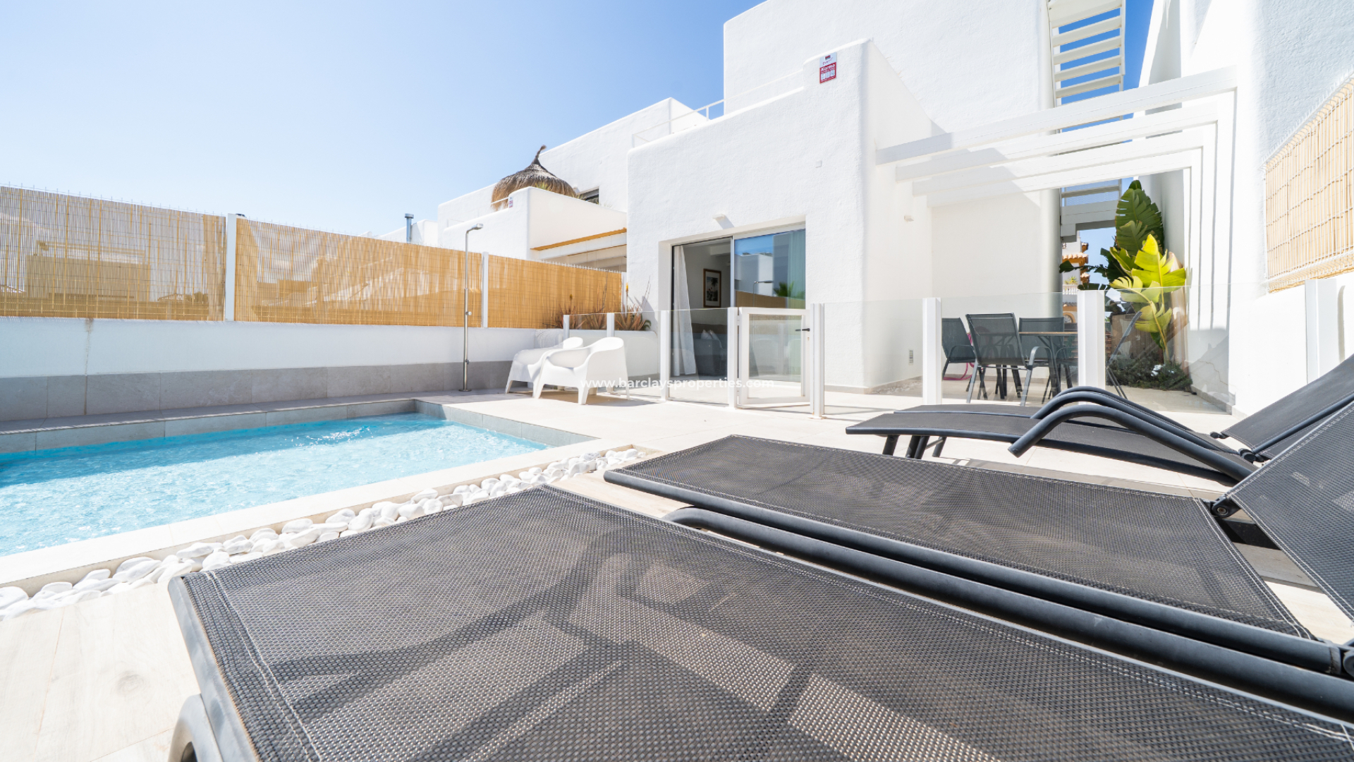 Outdoor living is enhanced by a ✅private swimming pool with security gated glass surround and sun-drenched terrace space, ideal for relaxation or entertaining. The location is ideal for beach lovers, with the blue flag “Playa de La Marina” just five minutes away. Alicante Airport is conveniently reached in approximately 25 minutes, and golfers will appreciate being only 14 minutes from a top-rated course.