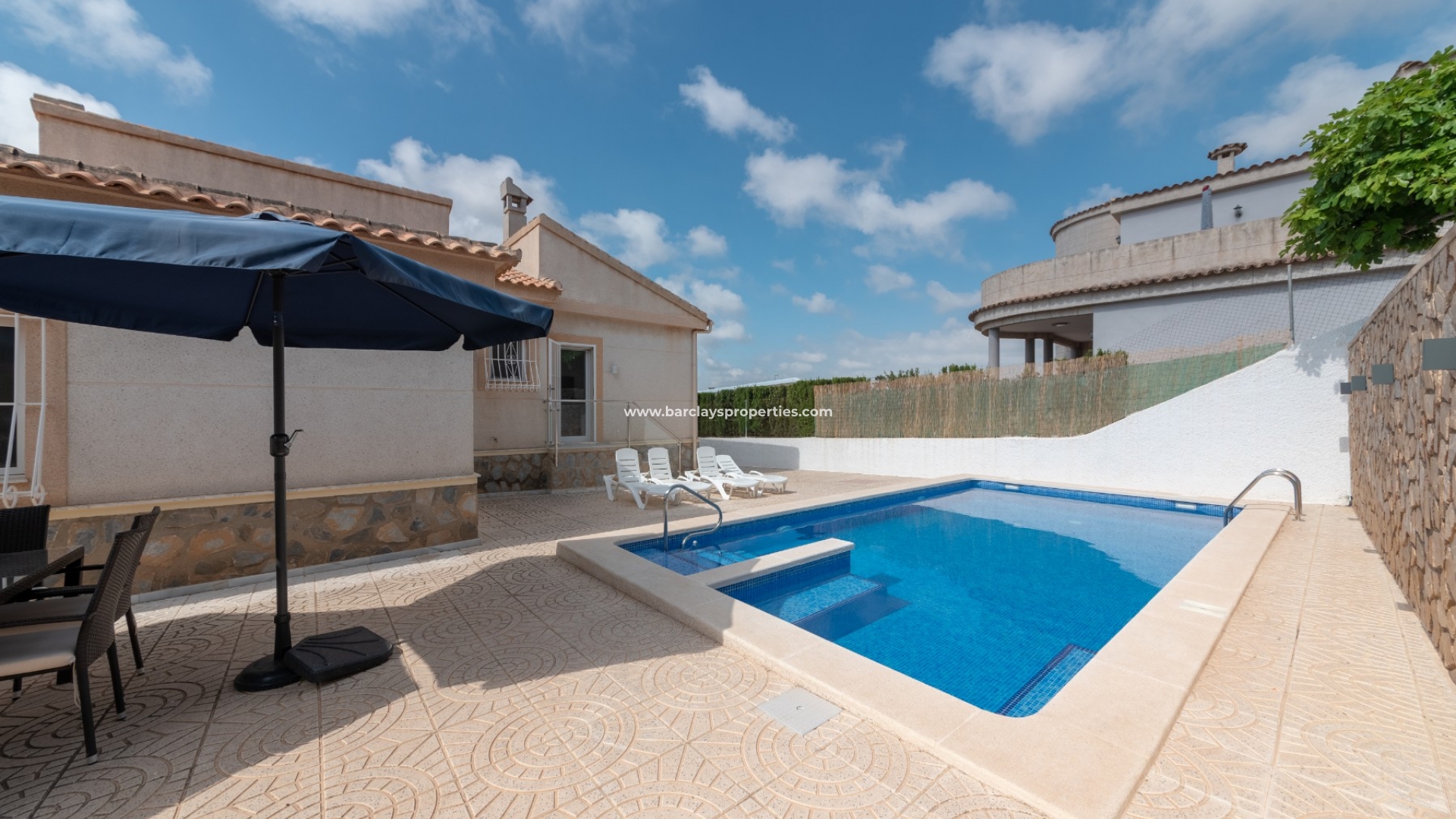 This beautiful property is south facing benefiting all day round sunshine, ideal for relaxing by the pool on those warm summer days / evenings or entertaining friends in the winter sunshine using the inbuilt barbecue and dining "al fresco" in the exterior dining area.