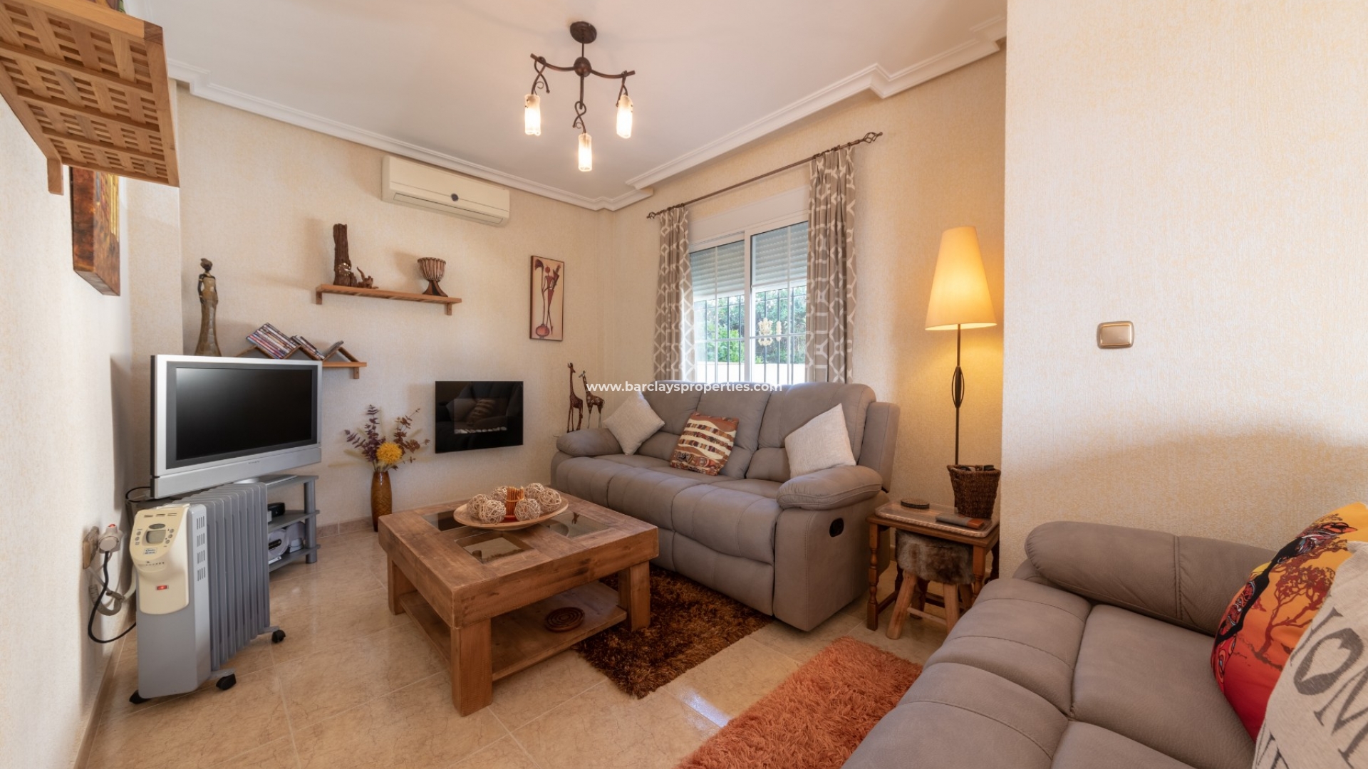 The immaculately presented garden which is paved, tiled and gravelled welcomes us with various plants including a beautiful palm tree which is located near the 7 x 4 private pool area where we find and exterior seating area and exterior shower. Stairs lead to a raised front terrace with an exterior seating / dining area where one can enjoy a morning coffee or dine "al fresco" watching the world go by. From here we enter the villa to find an attractive living room with dining area with neutral tones and natural light from the large windows, a modern electric wall mounted fire and air conditioning. The independent fully fitted kitchen with granite work surfaces is accessed from the living room and has an access door leading to an outside terrace / utility area with modern glass brick design side wall. This terrace overlooks the swimming pool and has a little security gate giving access to this area of the garden.