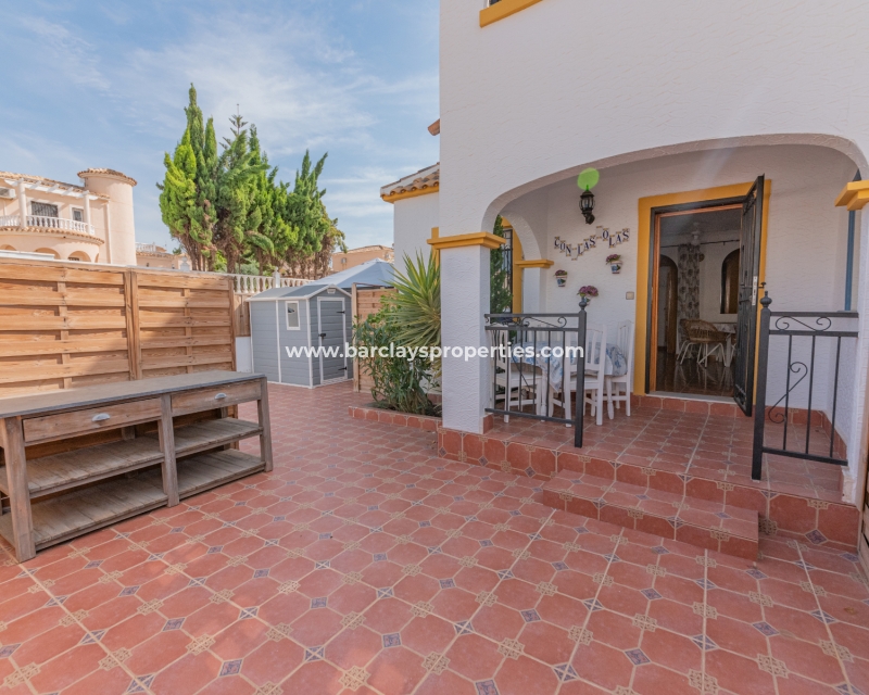 We can enter this charming Quad Property for sale in La Marina either from the pedestrian gate or the double gate which leads to a car port for off road parking. The garden is both gravelled and paved meaning it has the added advantage of being low maintenance. A raised front terrace with sun awnings offers a delightful place to sit with a cup of tea or coffee at any time of day, enjoying the fresh air.