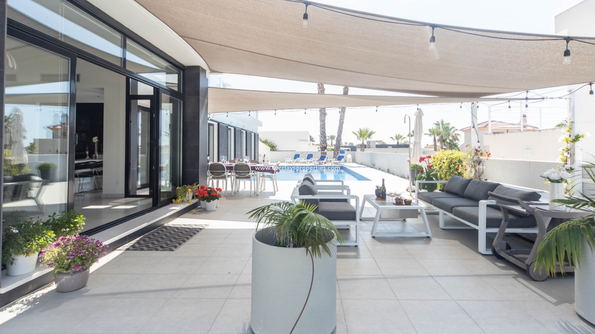 Välkommen till denna exklusiva moderna lyxvilla med söderläge, en sann symbol för elegans och komfort. Med fyra sovrum och tre badrum erbjuder denna bostad gott om utrymme för dig och dina nära och kära att njuta av en lyxig livsstil. Villan är belägen i ett lugnt område på den populära urbaniseringen La Marina. Närliggande bekvämligheter finns inom gångavstånd till två olika kommersiella områden med olika butiker, banker, barer, kaféer och restauranger, så det behövs ingen bil - njut av livet i din egen takt.