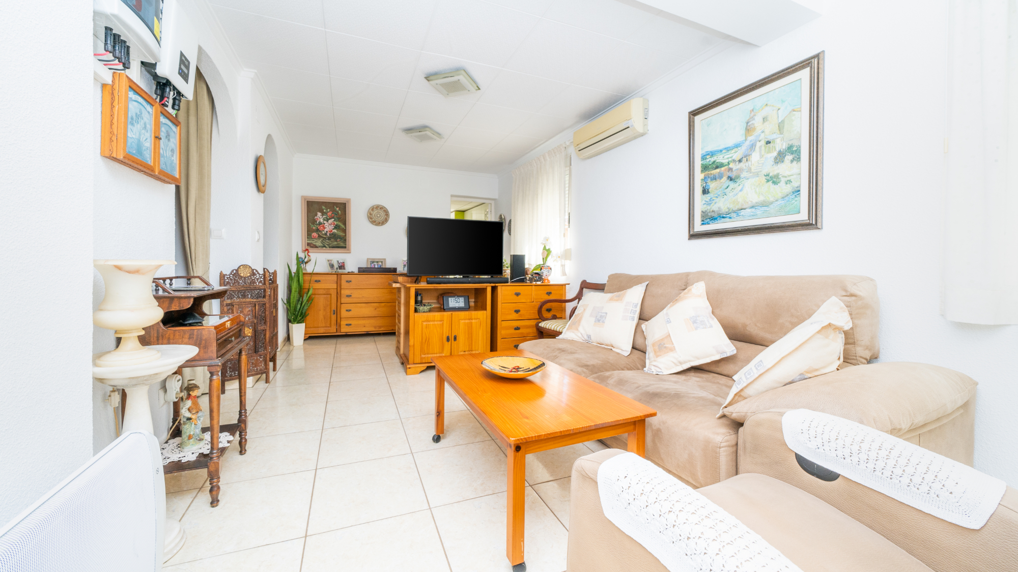 Vardagsrummet, utökat för ökad komfort, har luftkonditionering som ger lindring under varma sommardagar. Intill vardagsrummet erbjuder matsalen en mysig plats för gemensamma måltider och sammankomster.