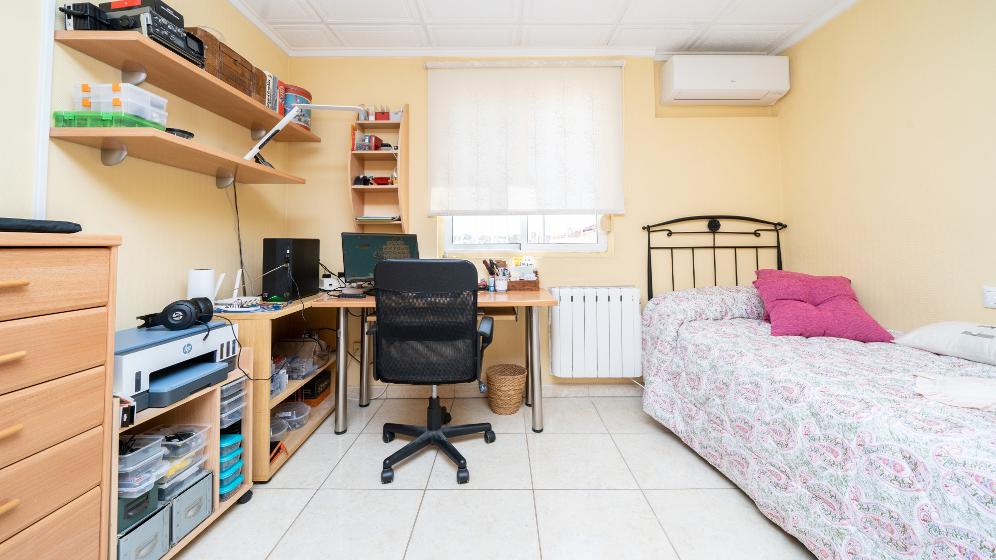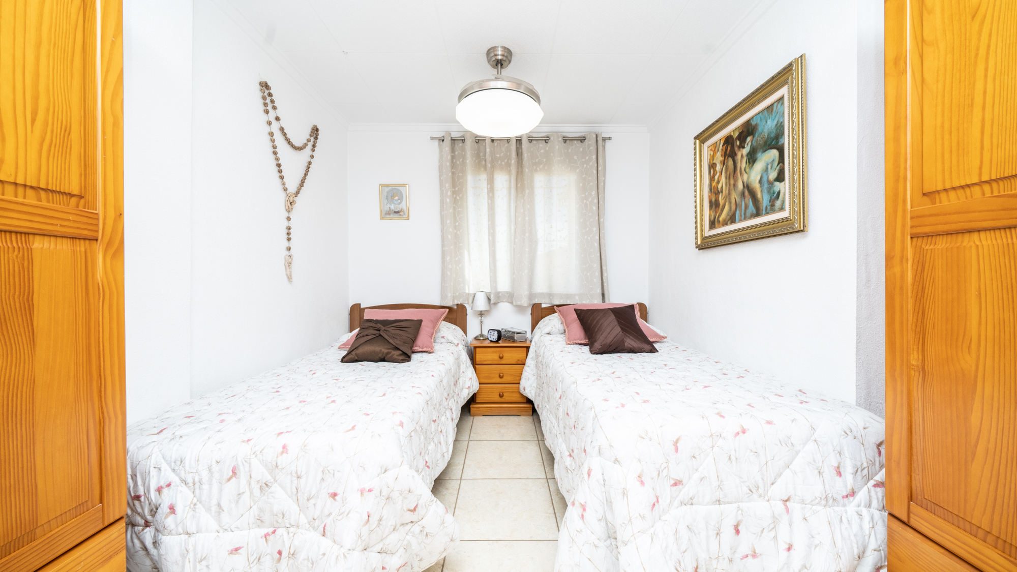 Sovrum 1 erbjuder en rymlig layout med två enkelsängar och Sovrum 2, anpassningsbart som dubbelrum eller enkelrum, har luftkonditionering och tillgodoser individuella preferenser.