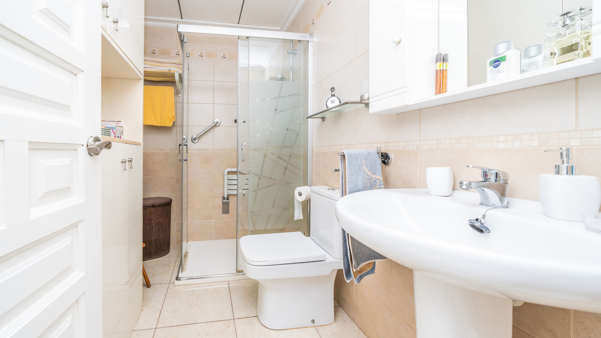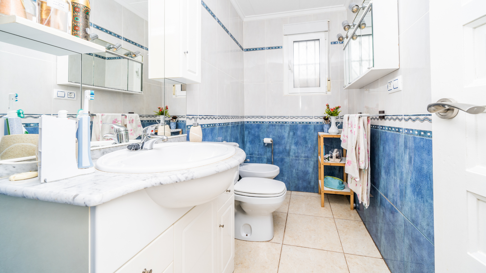 Fastigheten inkluderar två badrum för ökad bekvämlighet. Det första badrummet skryter med en WC, bidé och tvättställ, medan det andra badrummet har tvättställ, wc och hörndusch.