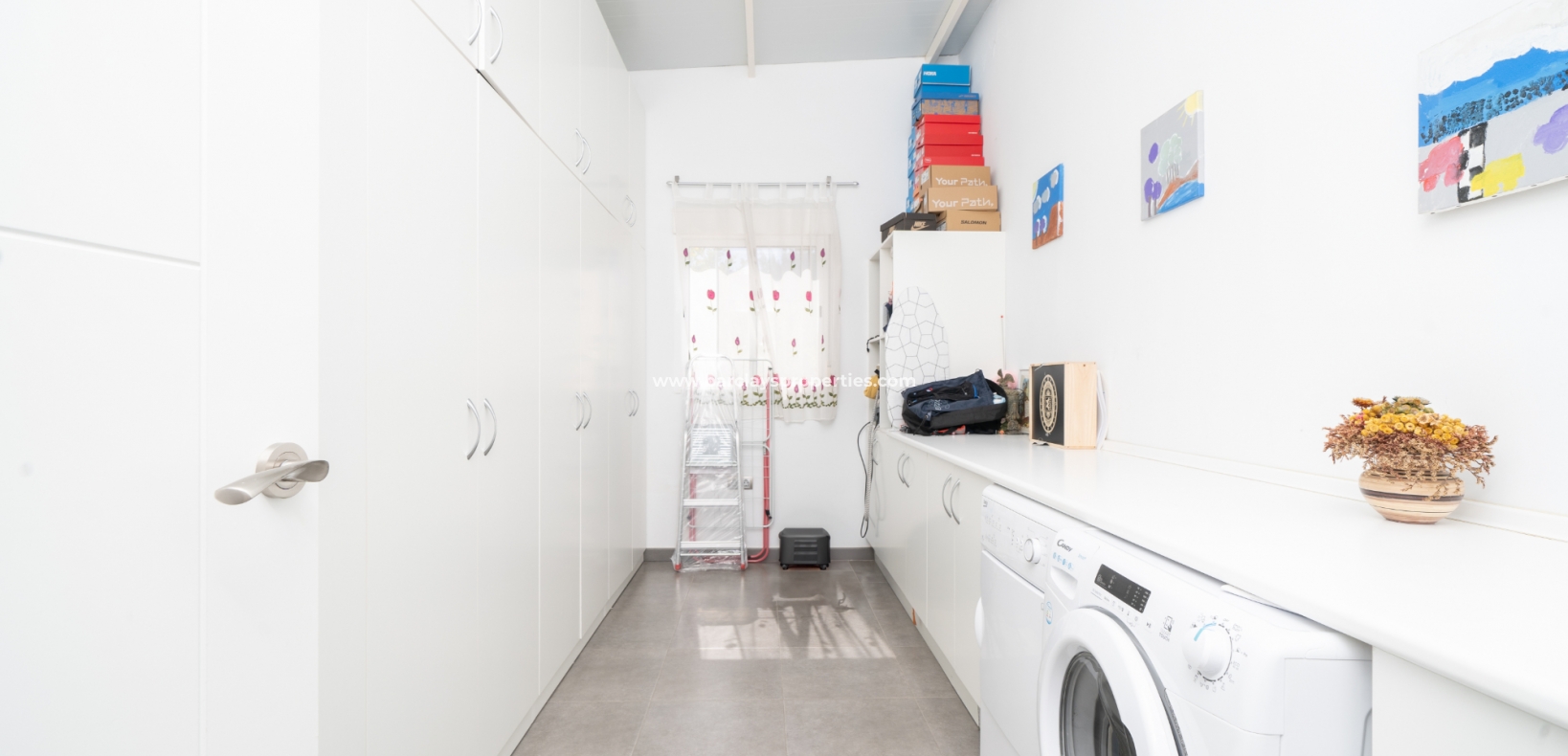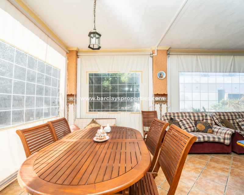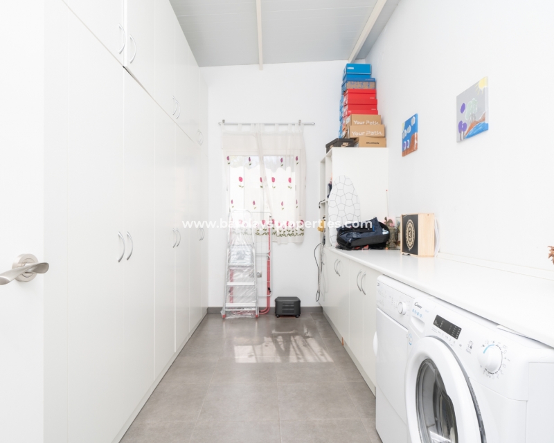 Villan har en stor, härlig veranda utrustad med infällbara markiser med genomskinliga fönster och många sittplatser som ger en bekväm utomhusplats. Vardagsrummet inkluderar ett inbjudande vardagsrum upplyst av spotlights och ett rymligt, helt elektriskt öppet kök utrustat med ✅luftkonditionering. Ett rymligt tvättrum erbjuder extra funktionalitet med tvättmaskin, torktumlare, varmvattenberedare och gott om förvaring.