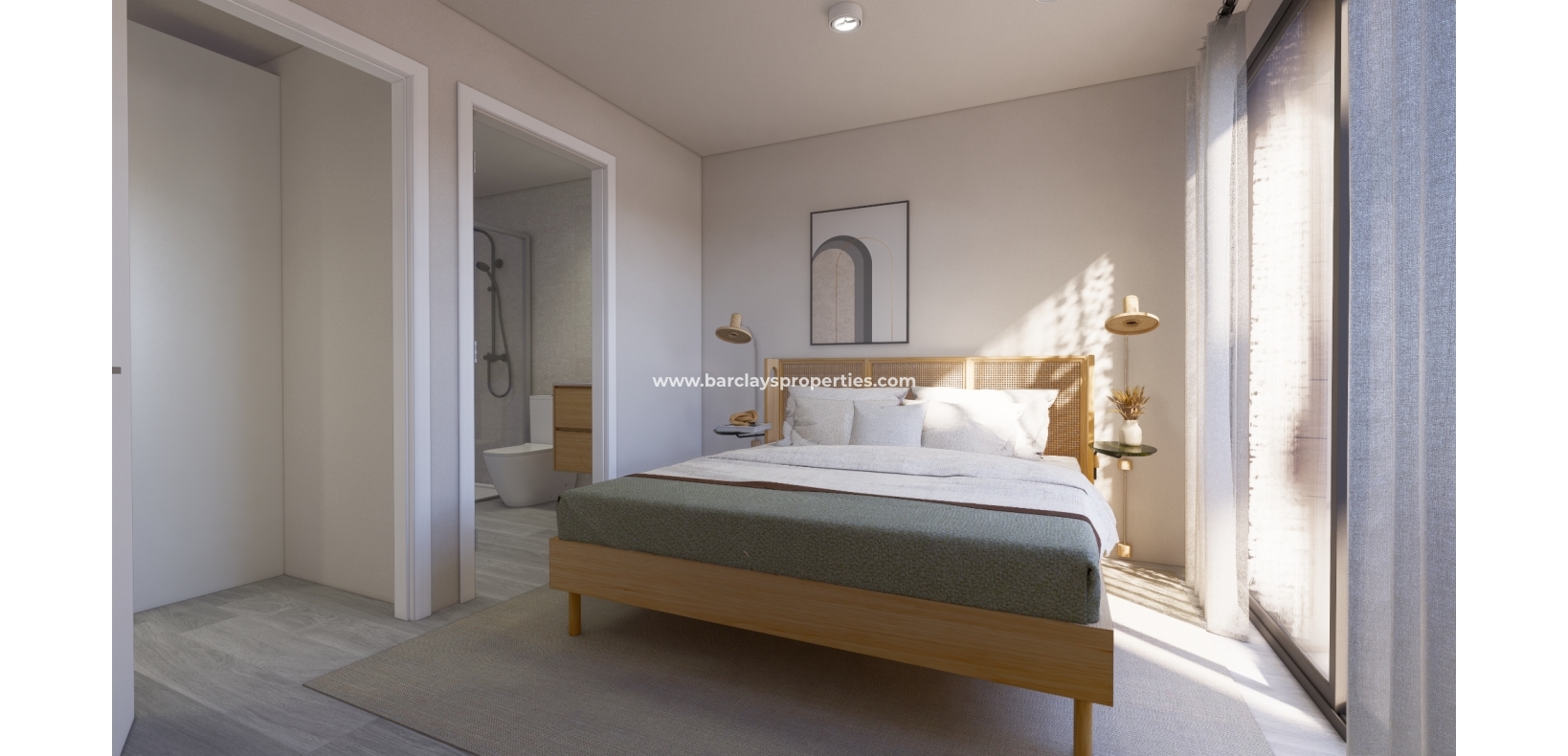 Rymliga Garderober & Kök: Inbyggda garderober i vitt lack med lådor, hyllor och klädställningar finns i alla sovrum. Köken är utrustade med glänsande lackerade dörrar, metallhandtag, naturstensbänkskivor (som Silestone eller liknande) och integrerade högkvalitativa vitvaror, inklusive keramisk spishäll, fläkt, ugn, mikrovågsugn, kyl/frys och diskmaskin.