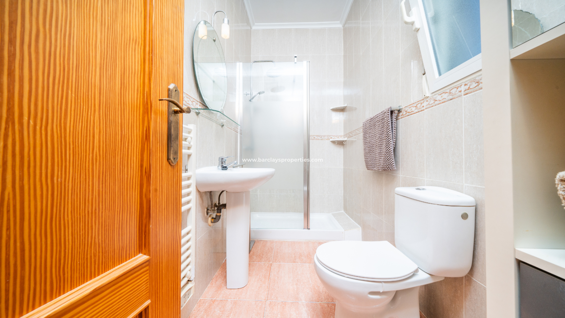 Huvudsovrummet har inbyggda garderober och takfläktar, samt ett eget badrum med dusch, handfat och toalett. Två ytterligare sovrum – ett med kingsize-säng och ett dubbelrum, båda med inbyggda garderober – säkerställer gott om sovplats för familj eller gäster. Familjebadrummet har ett fullstort badkar, toalett och handfat.