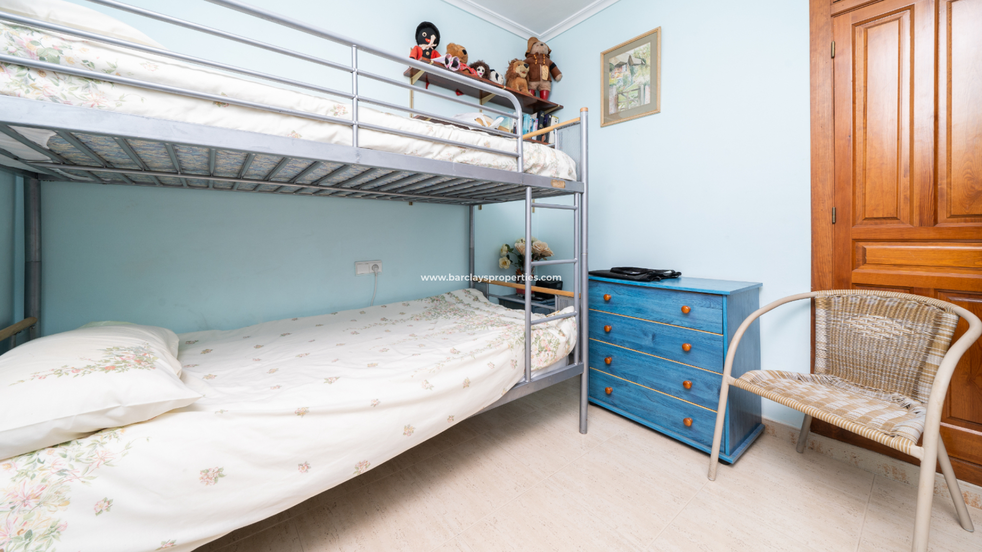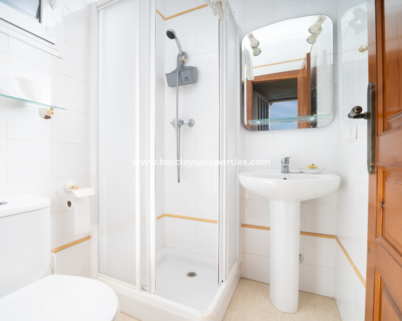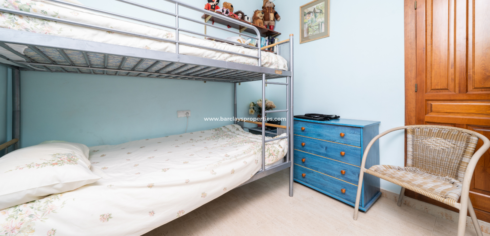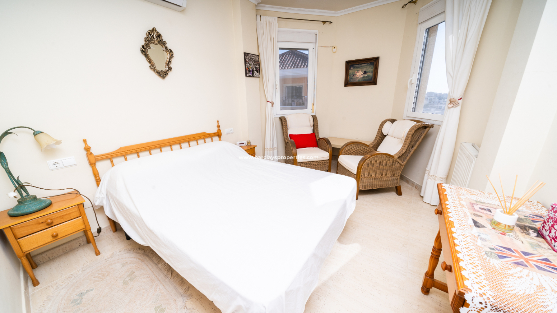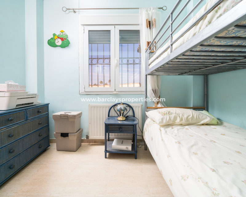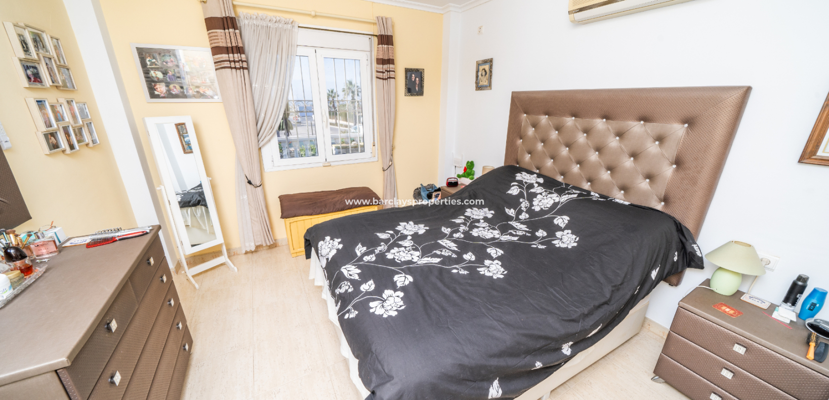 Villan har tre sovrum. Det första, som för närvarande används som kontor, har enkelsängar, inbyggda garderober och en takfläkt. Ett badrum med dusch, handfat och WC ligger bekvämt nära. Huvud sovrummet är rymligt och har stora inbyggda garderober, takfläkt och luftkonditionering. Badrummet en suite har ett fullt badkar, WC och handfat.