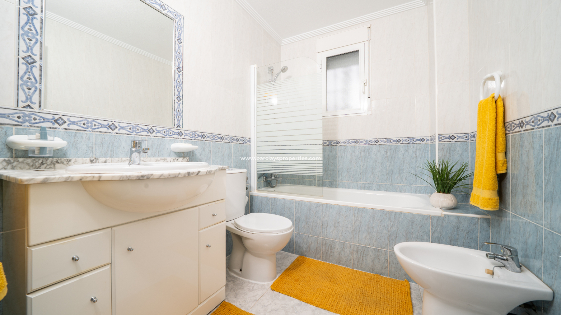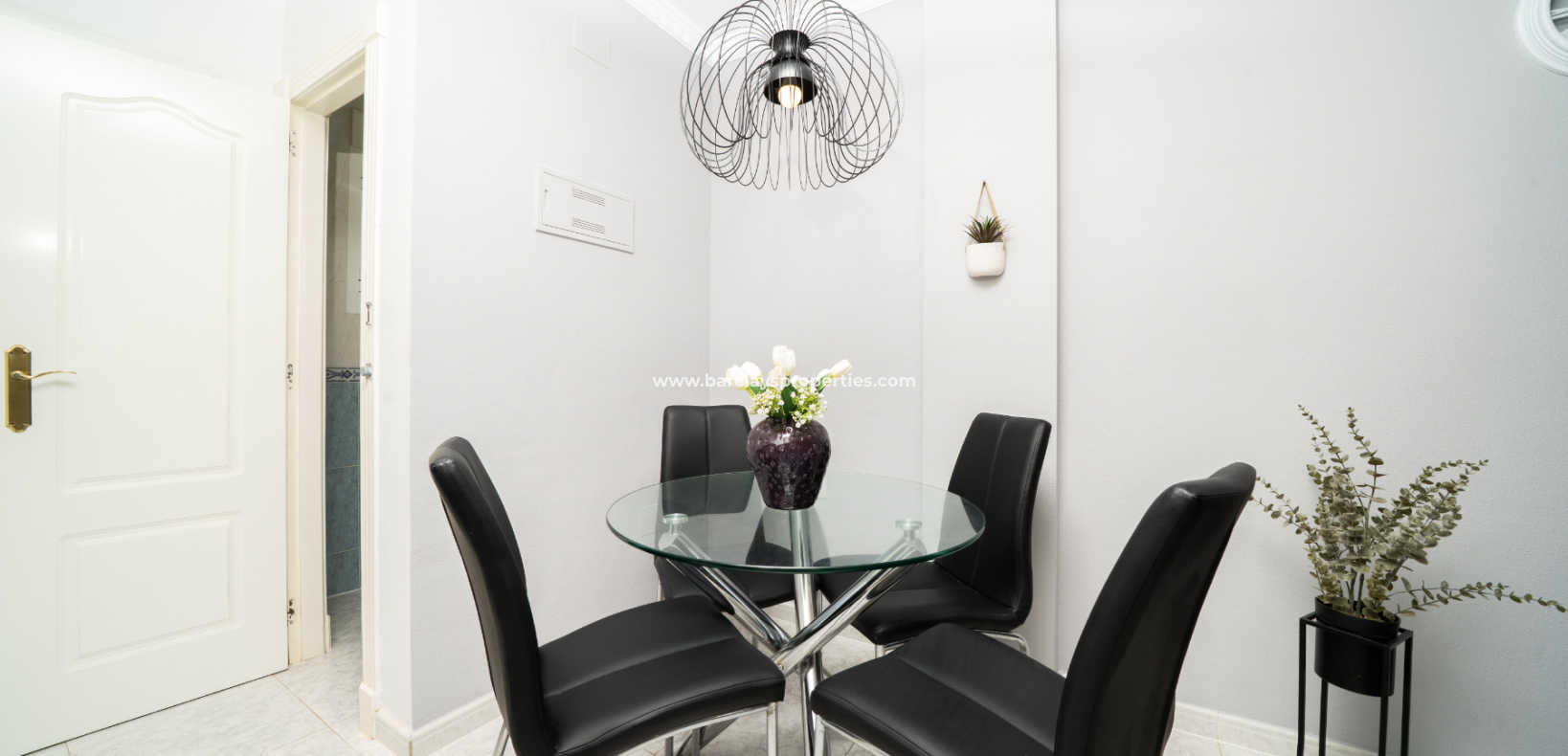 Fastigheten inkluderar en tvättstuga för extra bekvämlighet och ett komplett badrum med WC, tvättställ, bidé och badkar. Det första sovrummet är ett dubbelrum med takfläkt och inbyggd garderob. Det andra dubbelrummet har luftkonditionering, takfläkt, inbyggd garderob och egen privat balkong med vacker utsikt mot den närliggande staden Guardamar del Segura.
