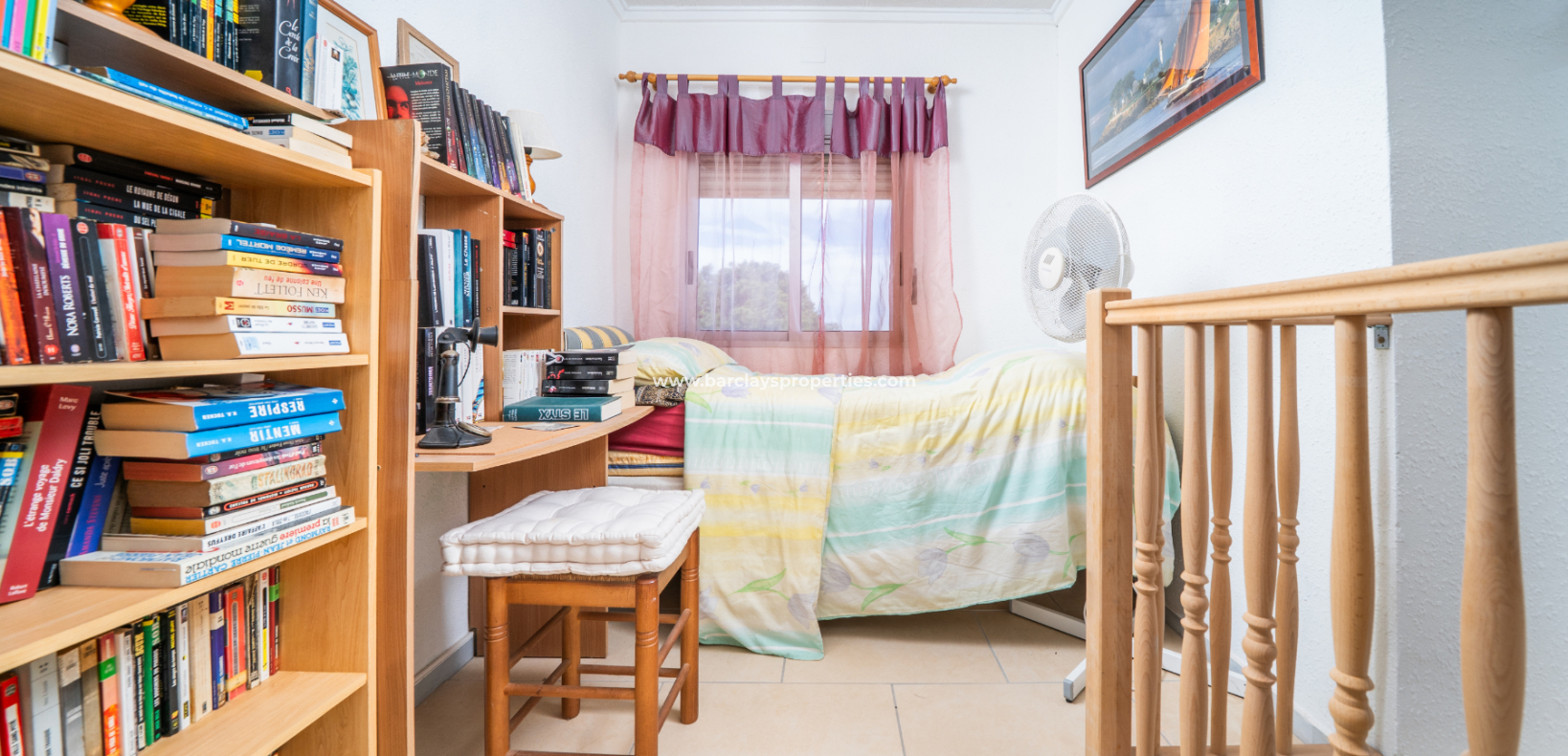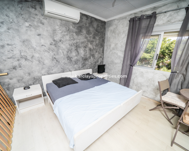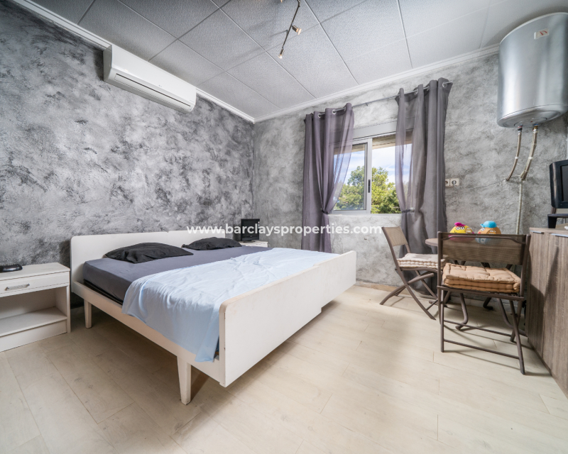 Ett hallområde som för närvarande används som sovplats och kontorsområde leder till ett dubbelrum med takfläkt samt ytterligare ett dubbelrum och det rymliga huvudsovrummet som har utsikt över grönområdet och poolen och erbjuder direkt tillgång till en solterrass med utsikt över landsbygden.