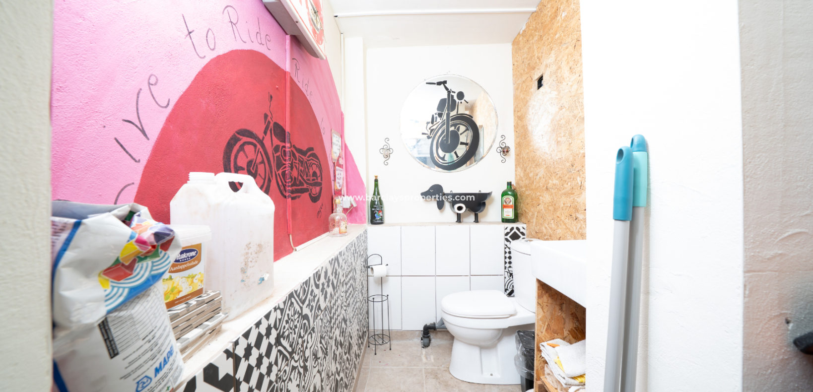 Invändigt består villan av tre sovrum och ett huvudbadrum med dusch i marknivå, toalett och handfatsmöbel. Ett av sovrummen ligger på övervåningen – perfekt för gäster eller familj – och är utrustat med luftkonditionering och takfläkt för komfort året runt. På denna våning finns även ett extra tvättrum med handfat och skåp.