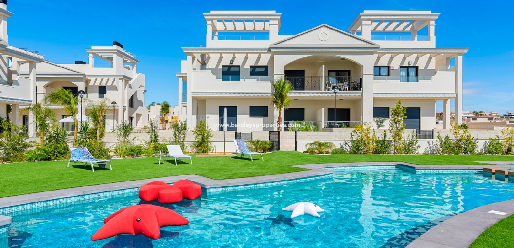 Dessa stilfulla lägenheter med 2 sovrum och 2 badrum erbjuder 79 m² välplanerat boende på ett plan, med öppen planlösning, dubbla glasfönster, ➡️ och tillgång till en vacker gemensam pool. Belägna i ett lugnt men välanslutet privat bostadsområde, endast 6 km från stranden, 4 km från golfbanan, 1 km från alla bekvämligheter och 54 km från flygplatsen. ➡️ Varje lägenhet har privat parkering och utmärkt uthyrningspotential. Två planlösningar finns att välja mellan: 2 eller 3 sovrum. Bottenvåningsmodellerna har rymliga privata trädgårdar på 90 till 155 m², medan lägenheterna på övervåningen erbjuder privata taksolarium – perfekta för att njuta av det medelhavska klimatet.