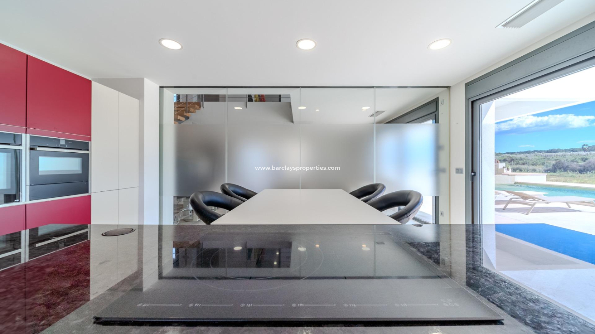 Denna extraordinära villa med 5 sovrum och 5 badrum i La Marina del Pinet (Elche) blandar lyxigt boende med modern funktionalitet ➡️ fördelat på tre våningar och 424 m² byggd yta, belägen på en vidsträckt tomt på 10 602 m². Byggd 2016 och med fullt söderläge, erbjuder hemmet fantastisk 360° utsikt över landsbygden och bergen, bara 5 km från stranden och 25 km från Alicantes flygplats. Den rymliga, öppna planlösningen, förstärkt av premiummaterial, ➡️ en privat hiss, källarutrymme och avancerade tillgänglighetsfunktioner, garanterar både komfort och elegans. Höjdpunkterna inkluderar ett designkök med en central ö och high-end vitvaror, ett vardagsrum som vetter mot en stor terrass och sommarkök med grill, samt ➡️ ett wellnessområde komplett med en 12 x 6 m pool, förhöjd jacuzzi och soldriven utomhusdusch.