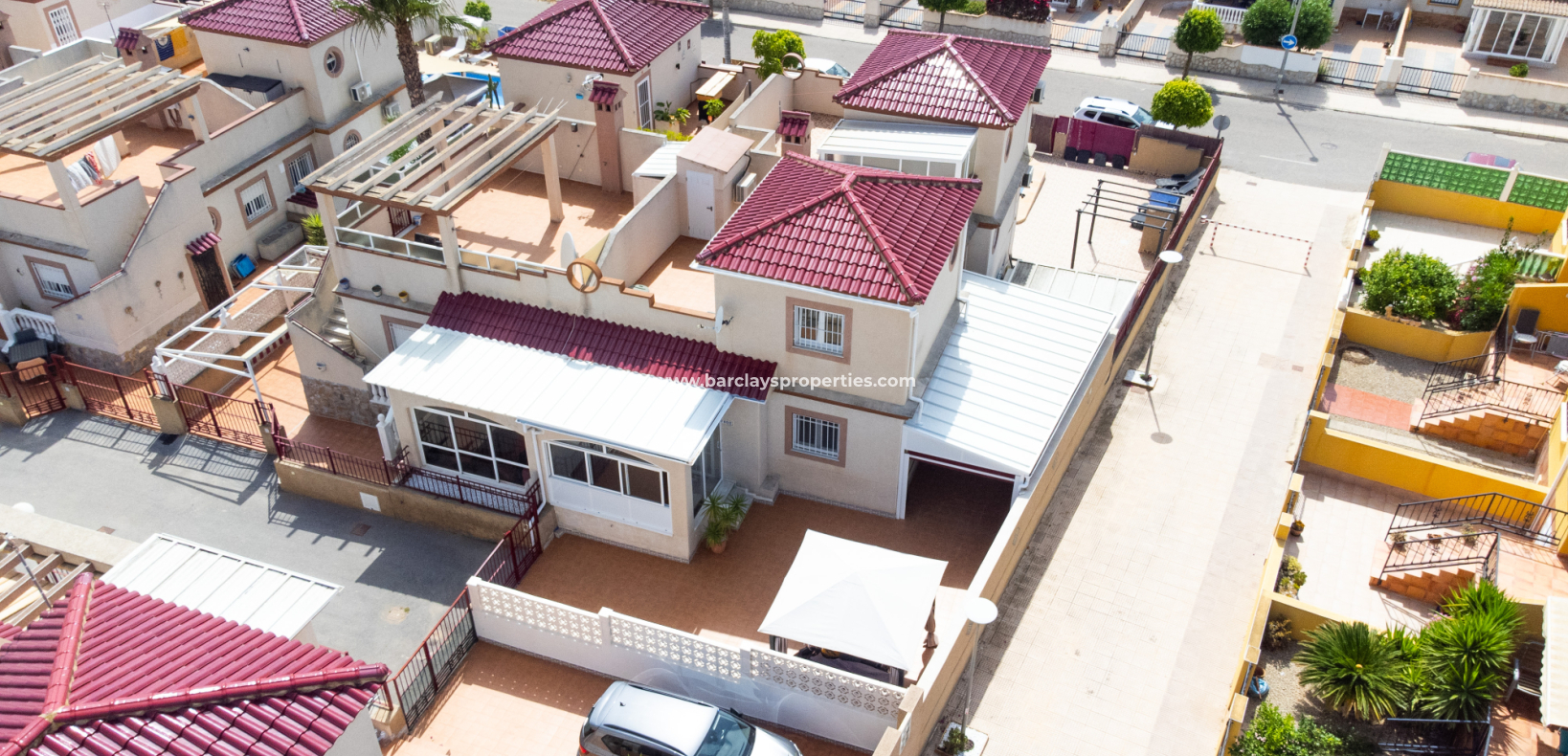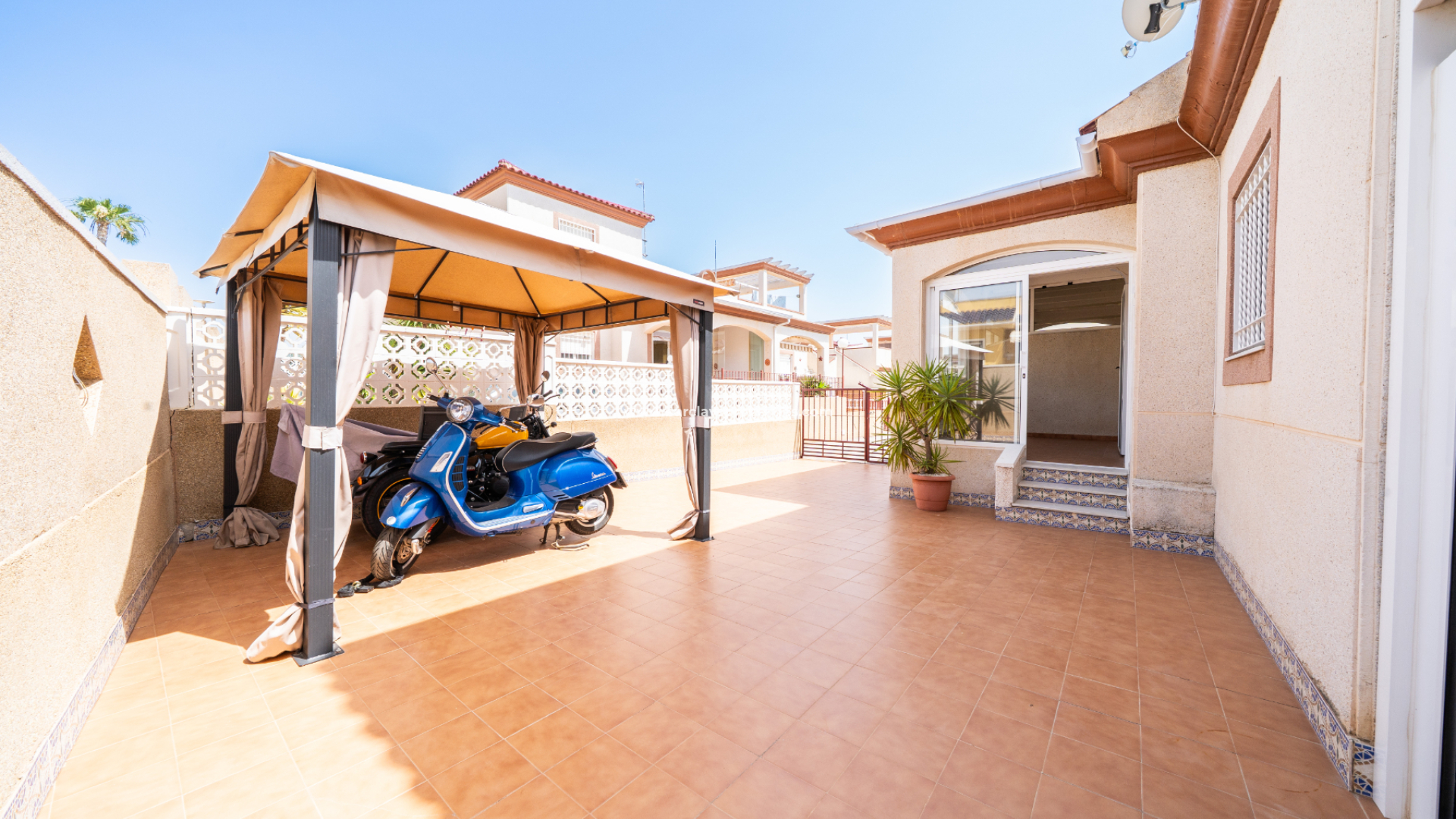 Fastigheten ligger på en lättskött, helbelagd trädgårdstomt och har en härlig pergola för skuggade utomhusplatser. Ett nyligen installerat aluminiumtak ger ytterligare skydd och kompletterar solmarkiserna. Det finns också ett byggt förråd, perfekt för utomhusföremål.