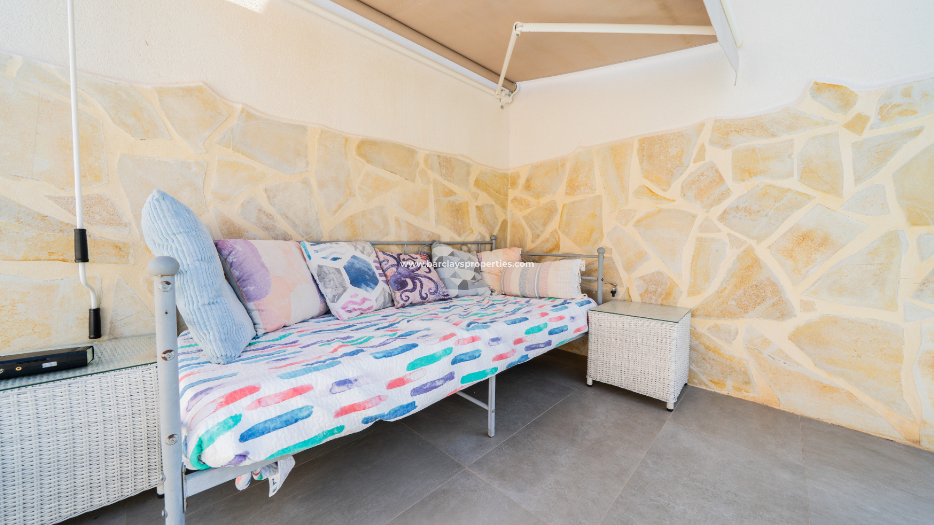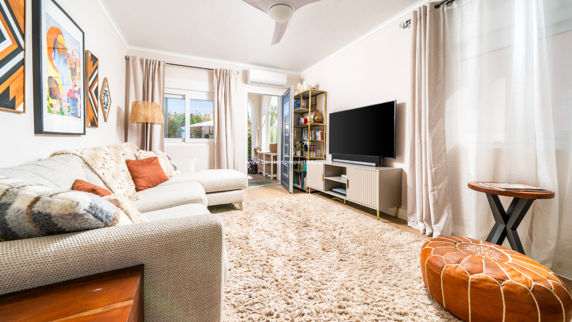 Kliv in genom ytterdörren och in i ett ljust och luftigt vardagsrum utrustat med luftkonditionering, takfläkt och UPVC-skjutfönster med myggnät och elektriska persienner för komfort året runt.